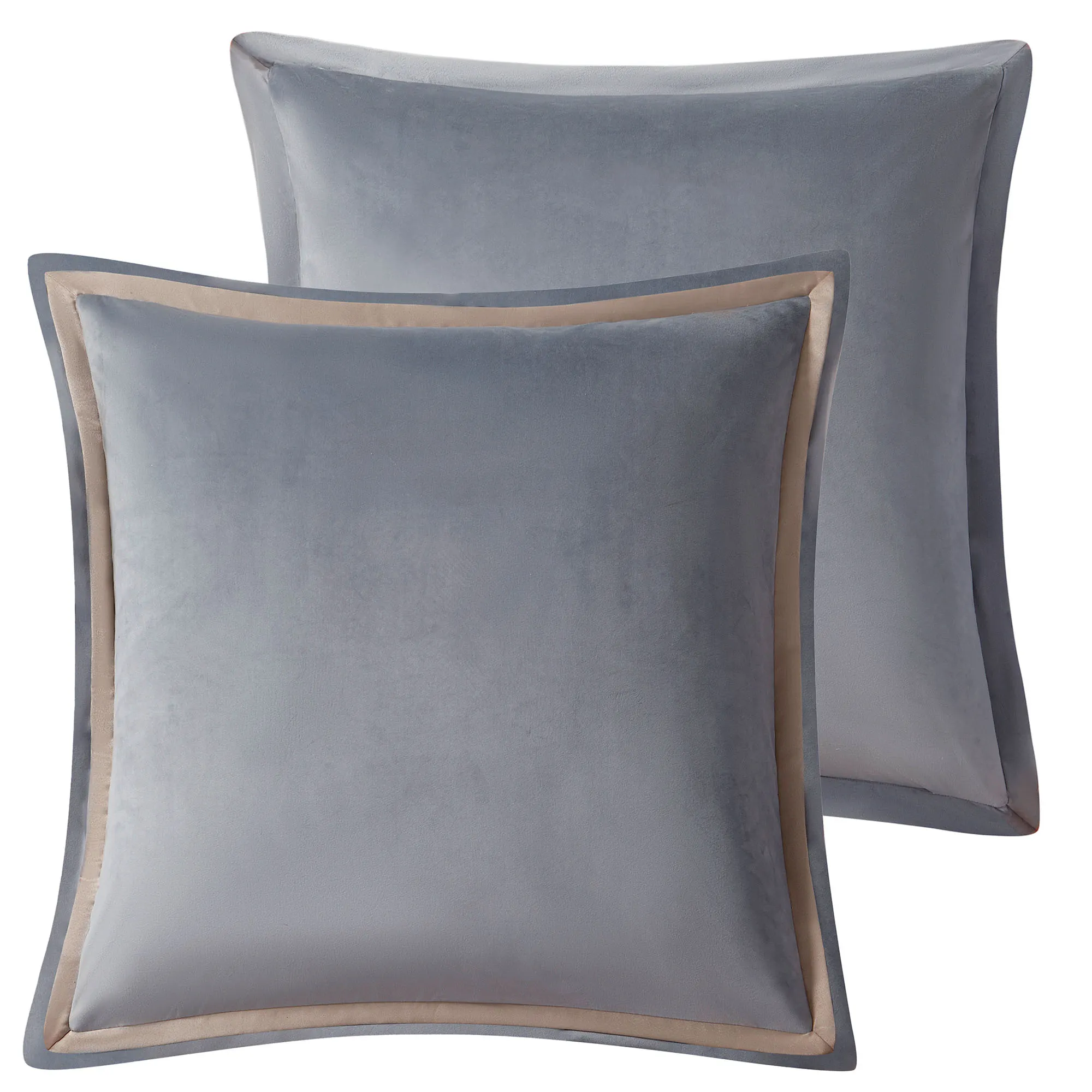 European Sham is gray velvet and has a double flange, a zipper closure, and a reverse of gray velvet.