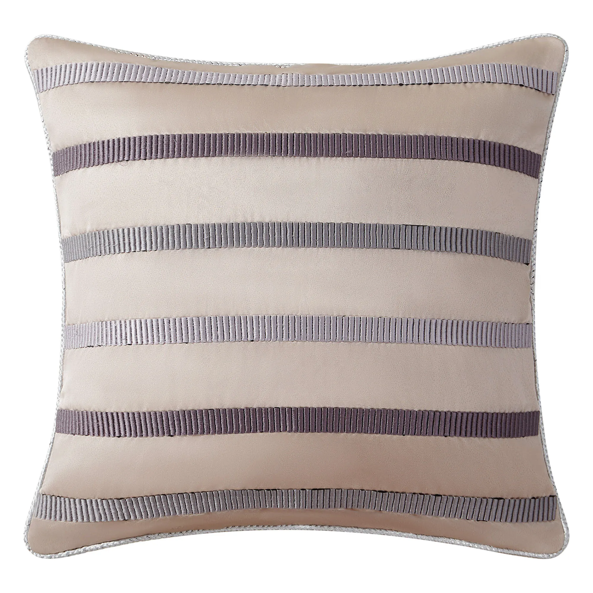 Piped Pillows: Spot clean. Rectangle has scroll embroidery on charcoal velvet. Square has embroidered ribbon detailing on mocha sateen.
