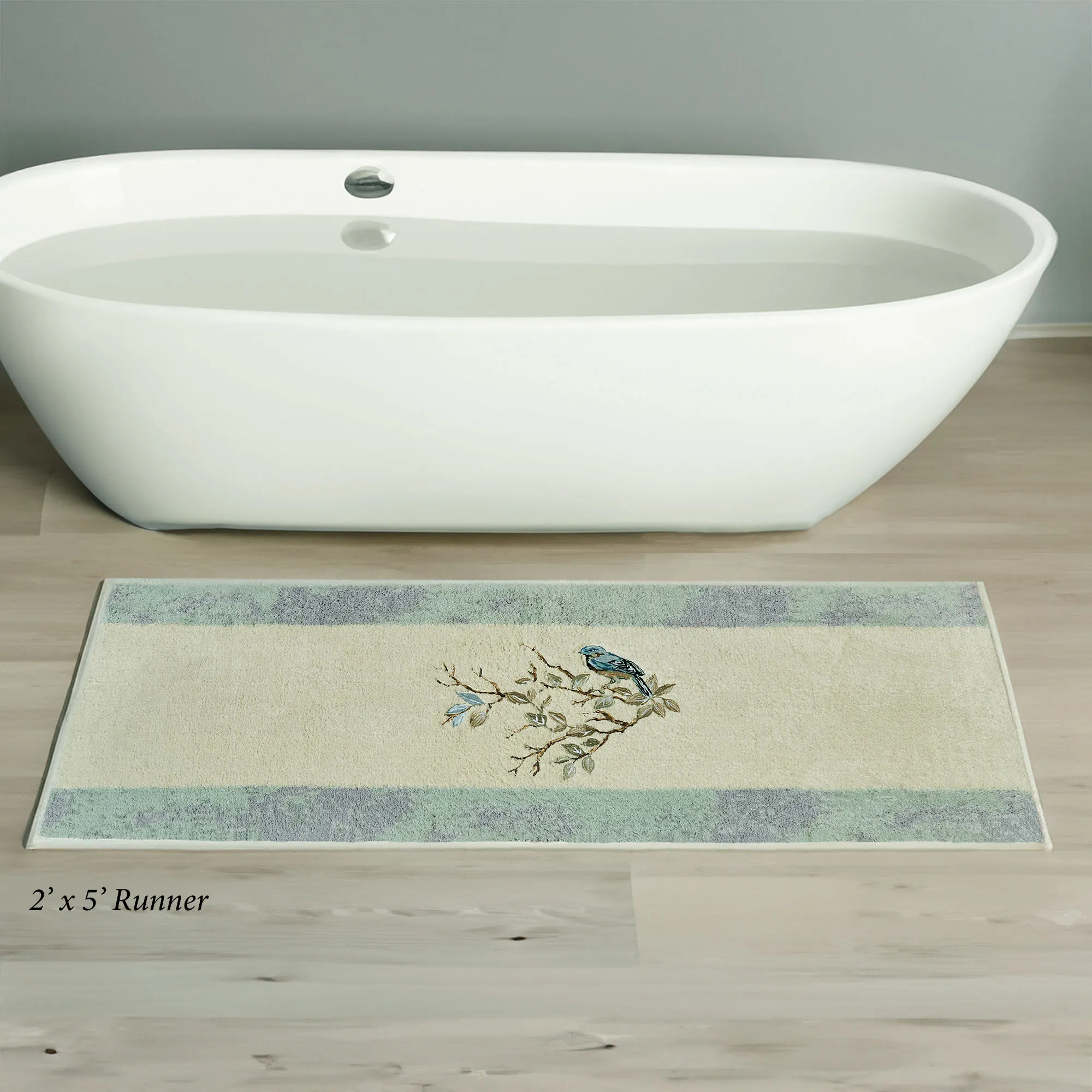 The Love Nest Bath Rug, by (C)Anita Phillips via Sagebrush Fine Arts, transforms your space with the graceful charm of nature. Accented by bands of mingled wisteria and seafoam, the .5" thick, tufted cotton bath rug features a soft natural center embroidered with a bird on a leafy branch. Backing is nonskid latex. Machine washable. Imported.