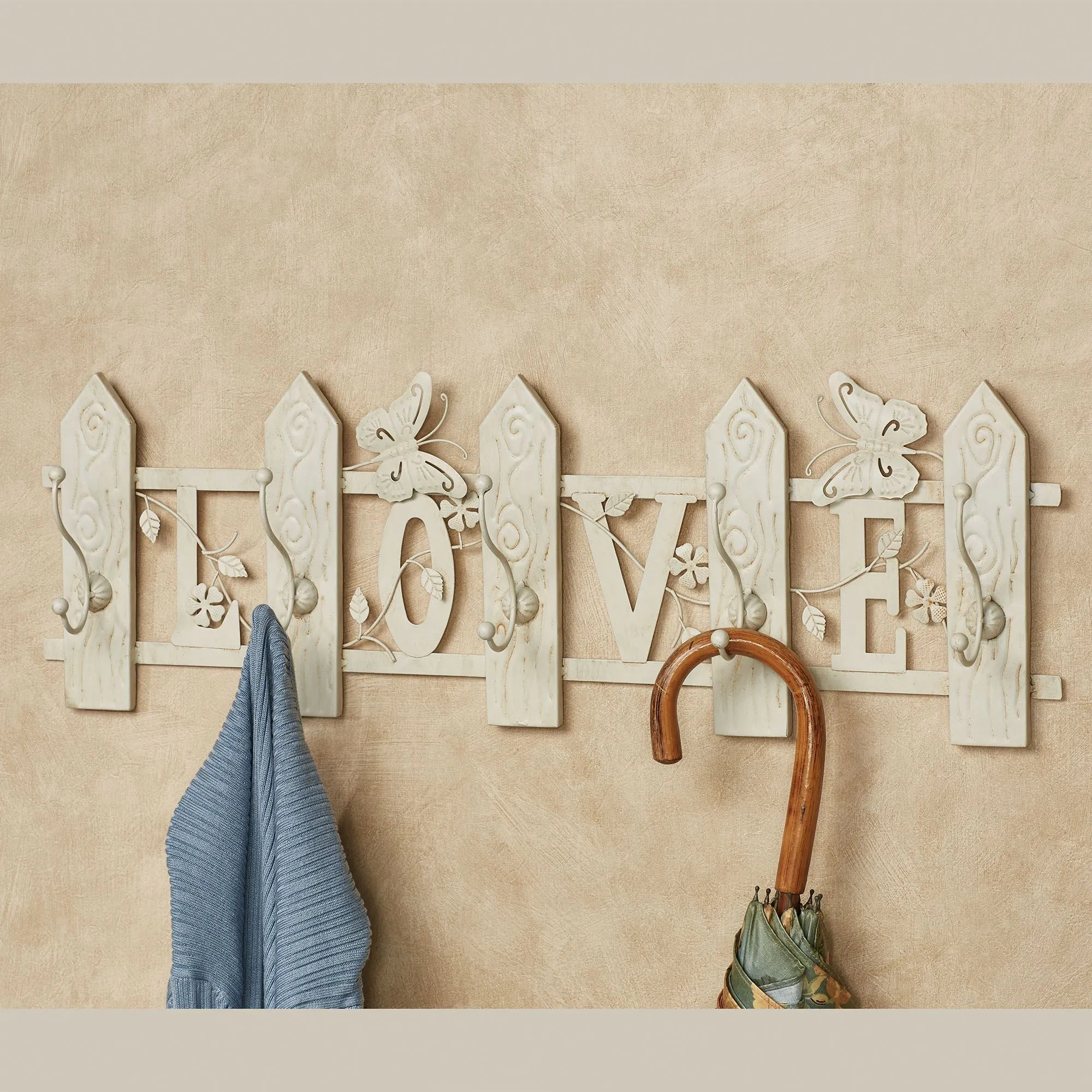 A picket fence, butterflies, vining florals, and the word "Love" are displayed with sweet charm. This metal wall hook rack has an ivory finish with a mocha wash. Wall accent has 10 hooks for jackets, hats, or other items. Measures 28"Wx3.5"Dx9"H.