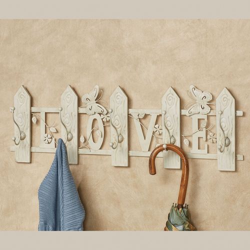 A picket fence, butterflies, vining florals, and the word "Love" are displayed with sweet charm. This metal wall hook rack has an ivory finish with a mocha wash. Wall accent has 10 hooks for jackets, hats, or other items. Measures 28"Wx3.5"Dx9"H.