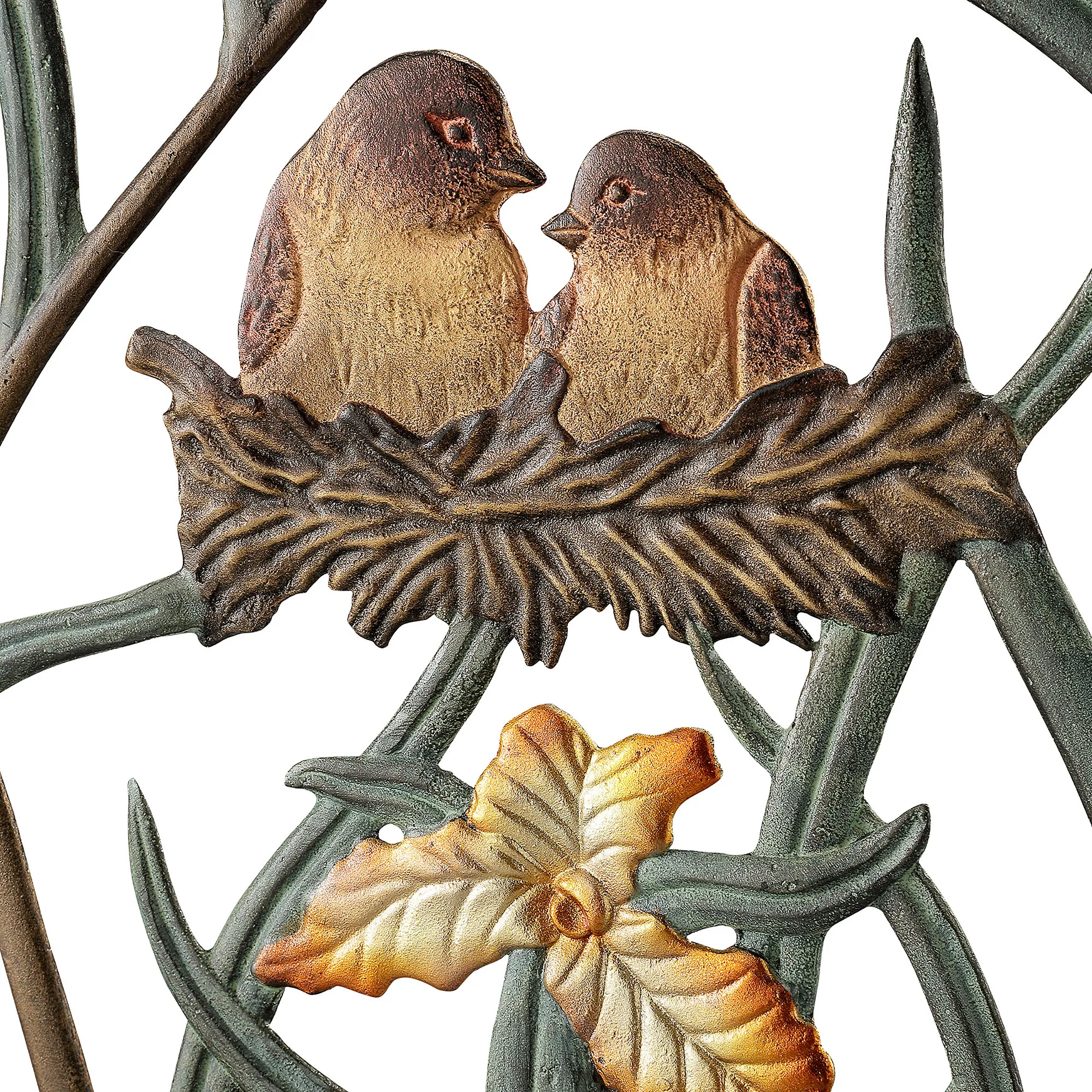 The Lovebirds Floral Outdoor Garden Trellis helps your flowering beauties flourish with a touch of nature's charm and sweetness. Hand-cast from aluminum, the hand-finished trellis features a rubbed bronze arched design filled with a dimensional nature scene of two birds perched in a nest. Golden yellow flowers and trailing verdi green leaves grow around the birds. Outdoor year-round use. With 6.25"H ground stakes, the sculptural garden trellis measures 14.5"Wx1"Dx39"H overall.