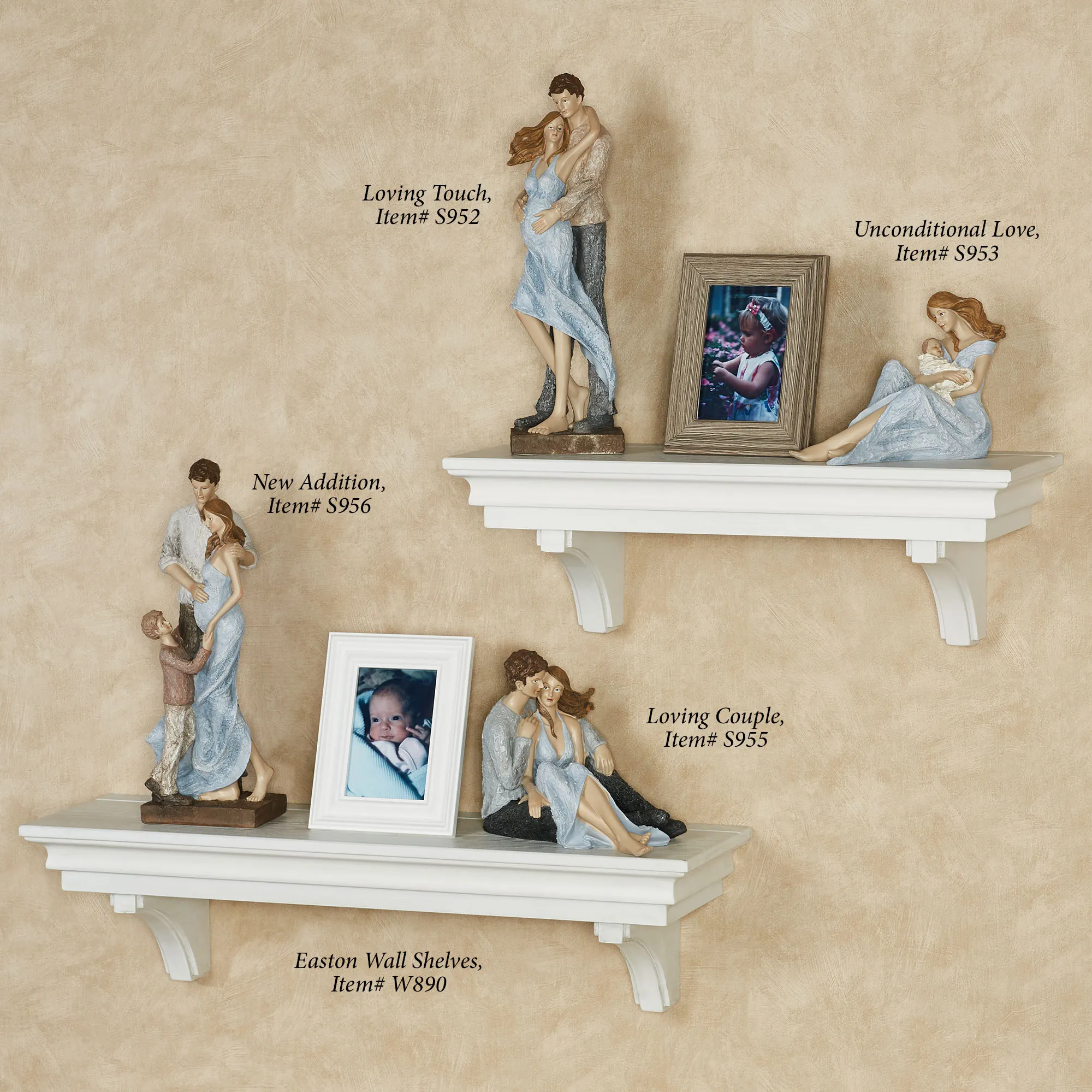 The Loving Touch Expectant Mother Sculpture captures the heartfelt emotions shared by a young couple as they embrace some of life's greatest blessings. This beloved, textured resin sculpture reminds us to make every minute count. A soon-to-be dad provides a loving touch to his wife. He has on a brown shirt and slacks. Sculpture measures 5"Wx4"Dx16"H.