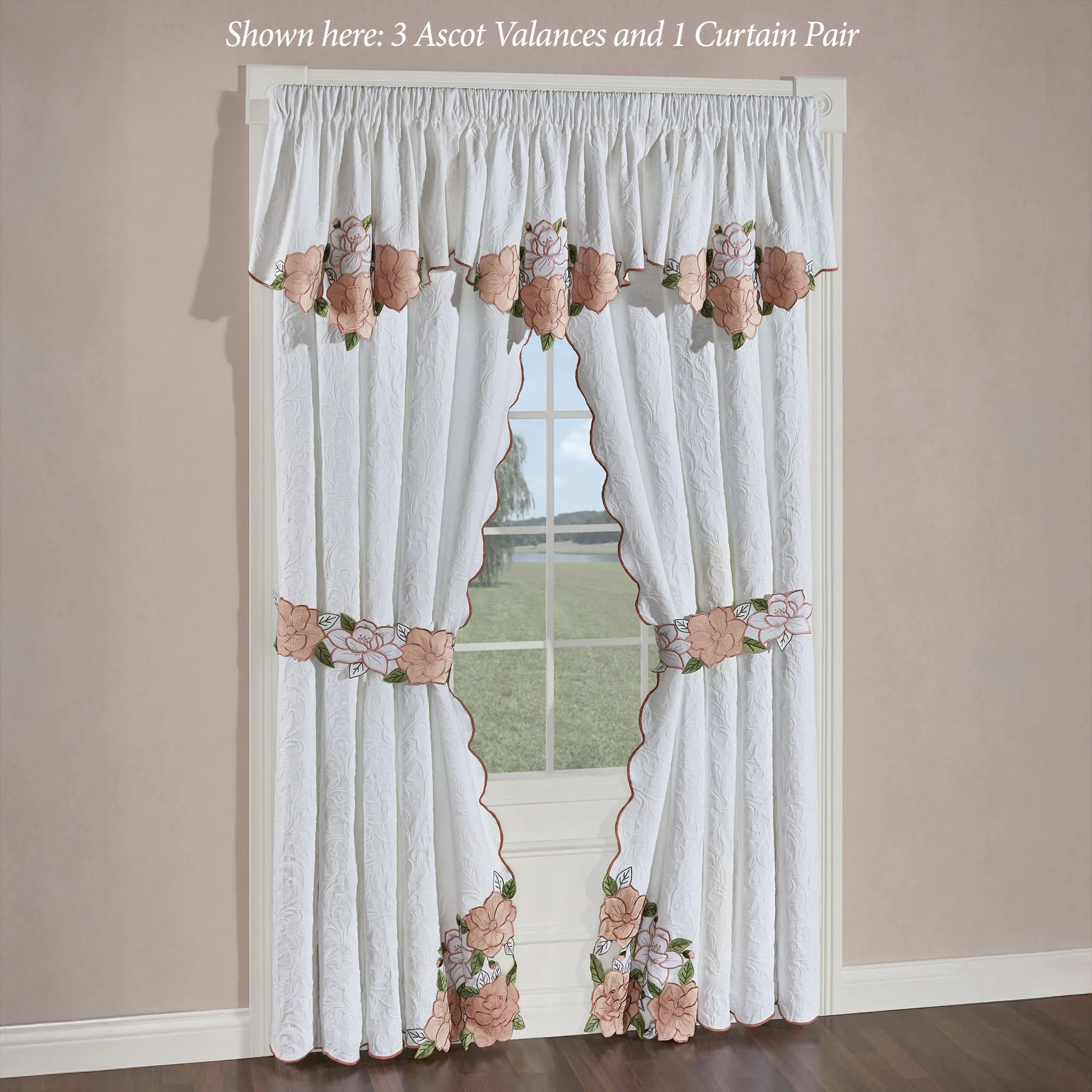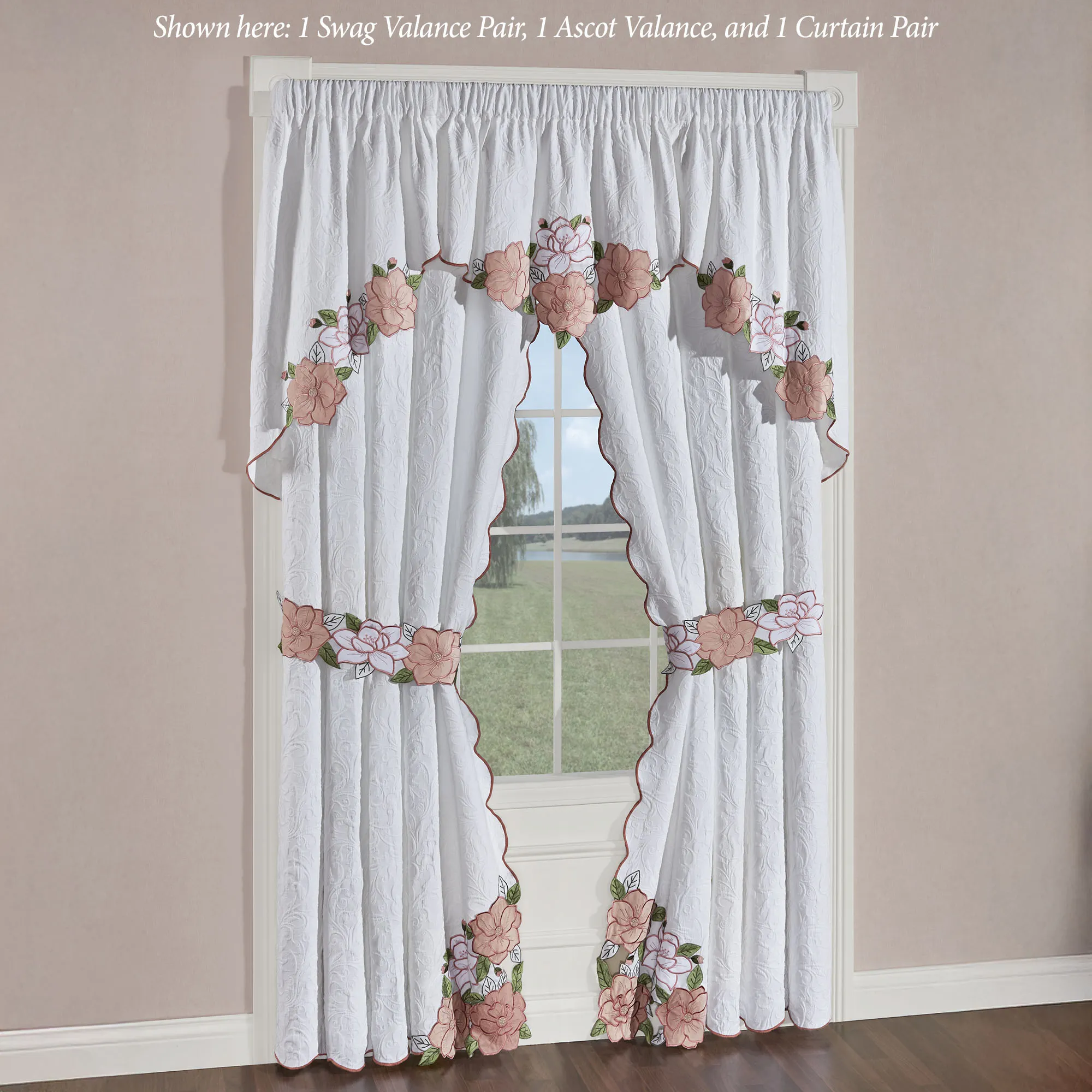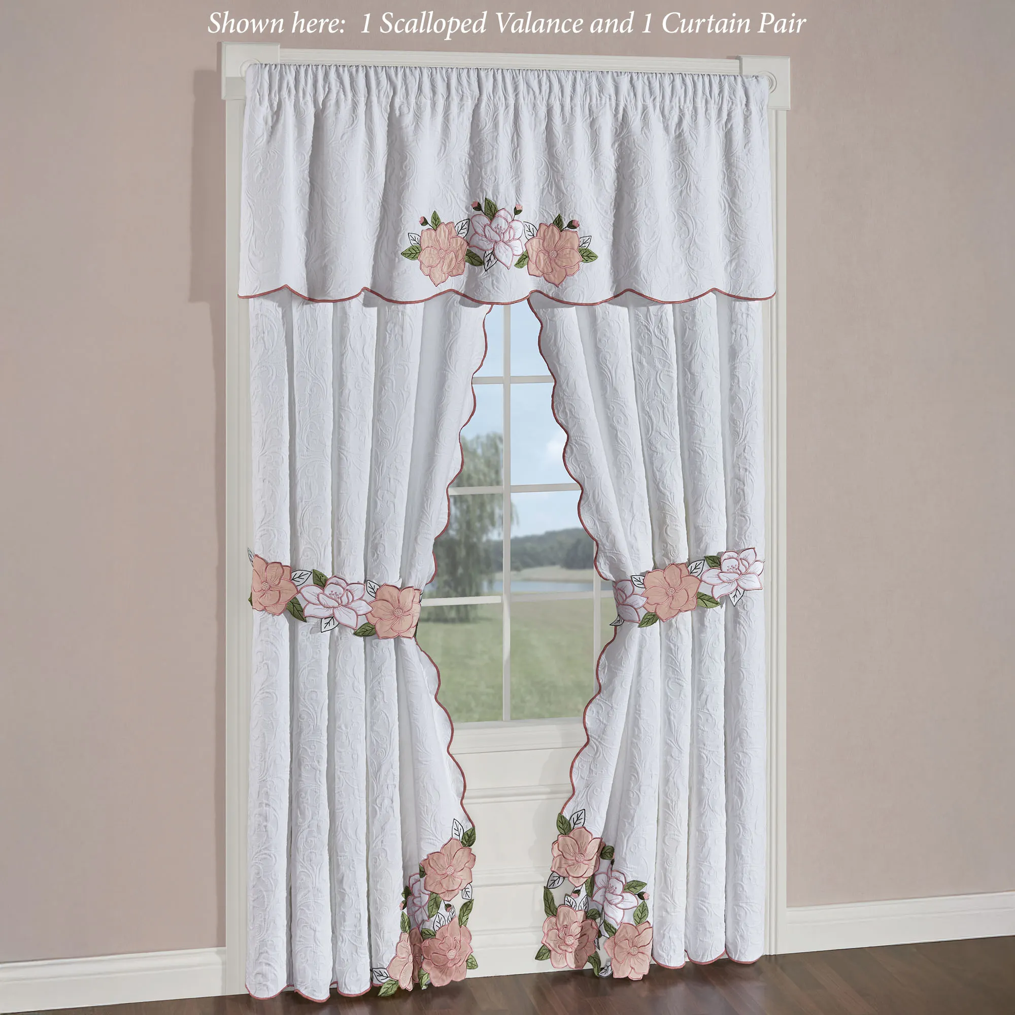 Matelasse Window Treatments have 3" rod pockets. Contour-cut flowers detail the scalloped edges of all, except the Scalloped Valance. Curtain Pair has contour-cut inside corners and includes floral tiebacks. Each Ascot Valance features a contour-cut floral center edge. Scalloped Valance has a center floral swag. Swag Valance Pair has contour-cut florals along each angled edge.