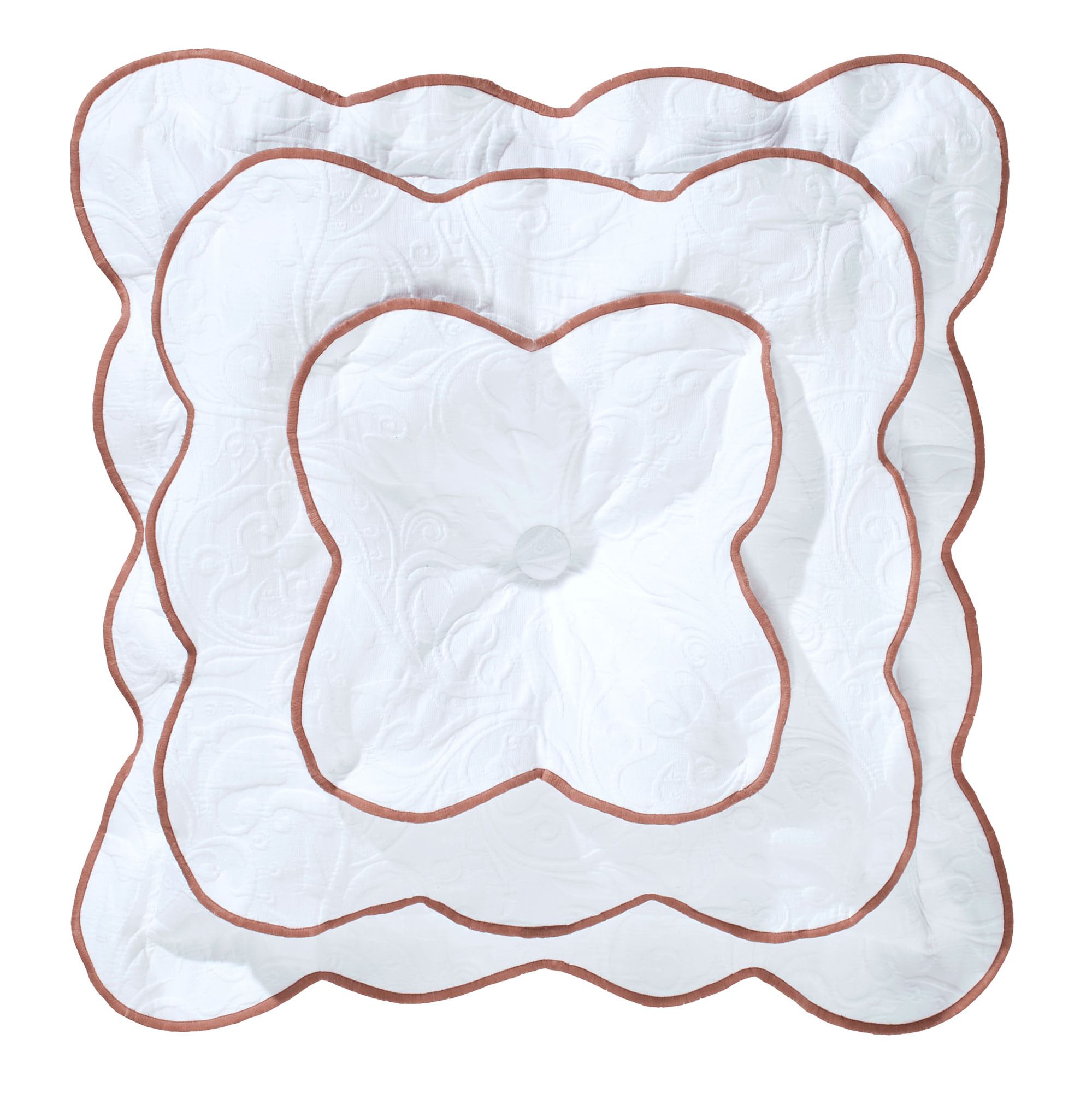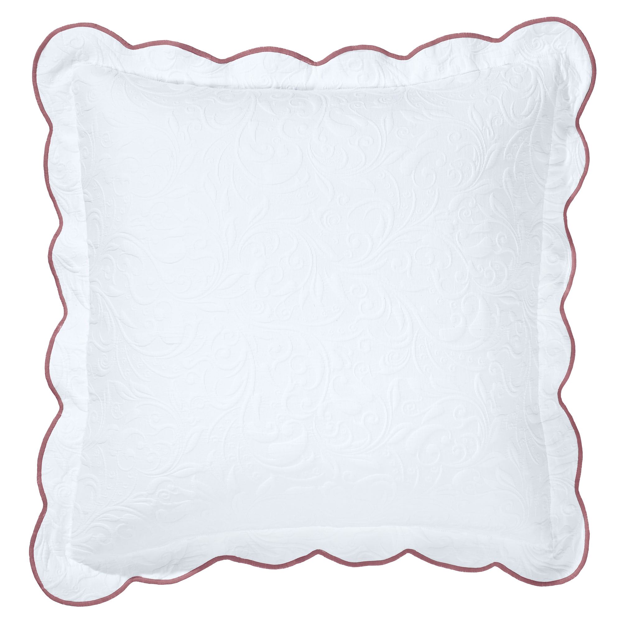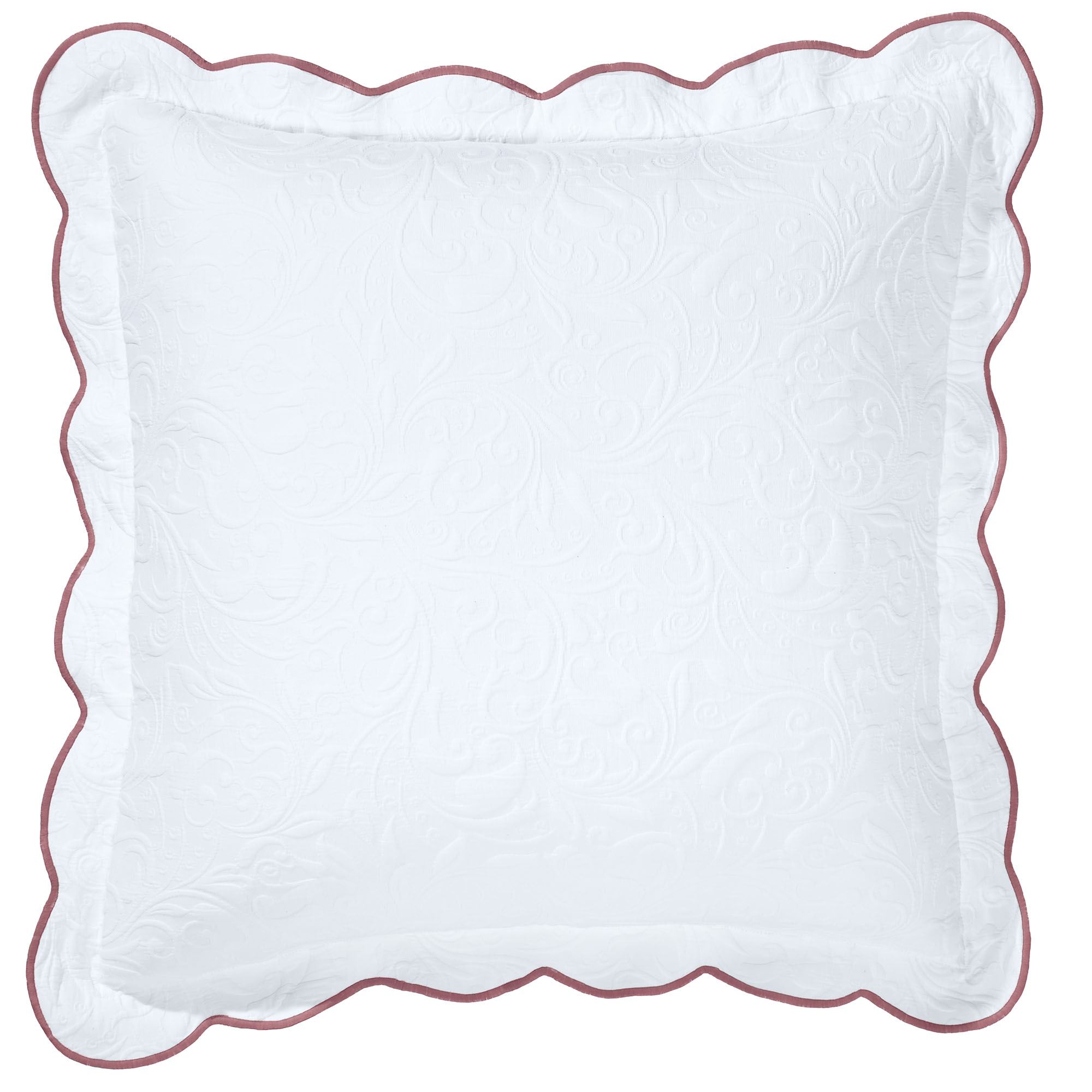 A sweet promise blossoms from the Lovington Bedding. With a lovely scrollwork pattern, the white, woven matelasse cotton/polyester ground provides a charming landscape for the velvet applique soft rose and white blooms with pink embroidery detailing and embroidered green leaves. Pink stitching finishes the scalloped edges of each darling design, except the Round Pillow.