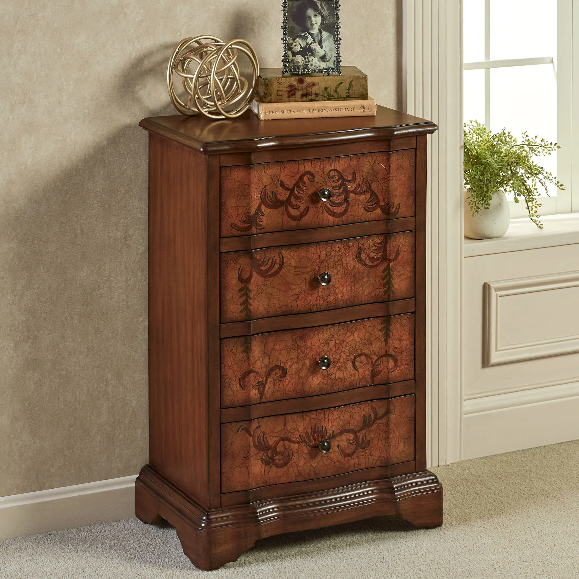 The stately Luca Bella Four-Drawer Storage Cabinet will perfectly complement a variety of decor themes. Wooden storage cabinet with shaped front features an estate mahogany finish and has four drawers with crackled pecan fronts adorned with handpainted vining scrolls in brown tones. Bronze metal drawer pulls and a stepped base complete this exquisite design. Drawers are each 15"Wx9.5"D. Overall, storage cabinet measures 21"Wx13"Dx32"H; weighs 36 lbs.