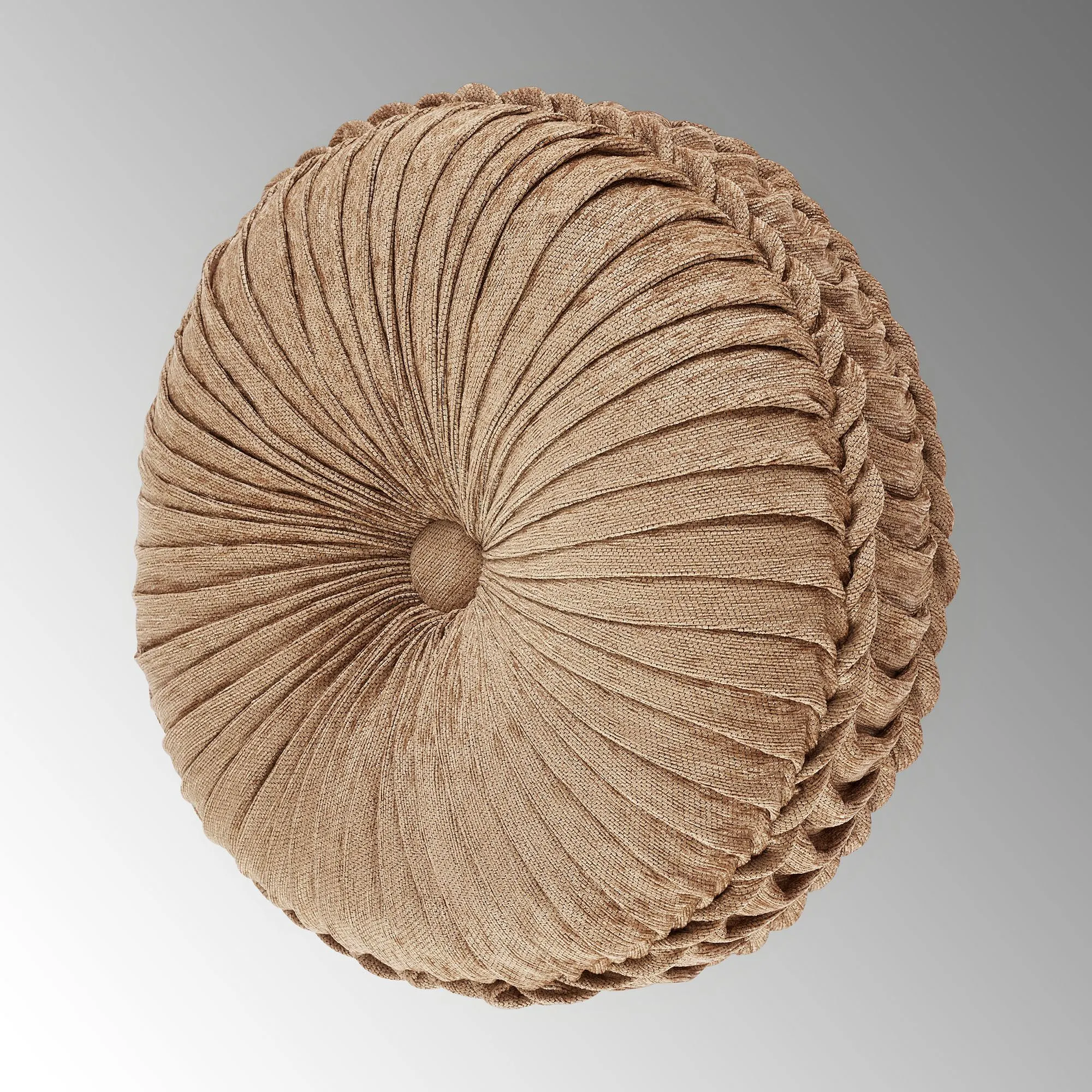 Pillows: Spot clean. The piped Embroidered Square has an embroidered rust medallion on honey chenille. The piped Damask Square has a woven jacquard scrolling damask pattern on honey chenille. The reversible, pleated Round is solid honey chenille with a center button tuft and a 2.5" side gusset.