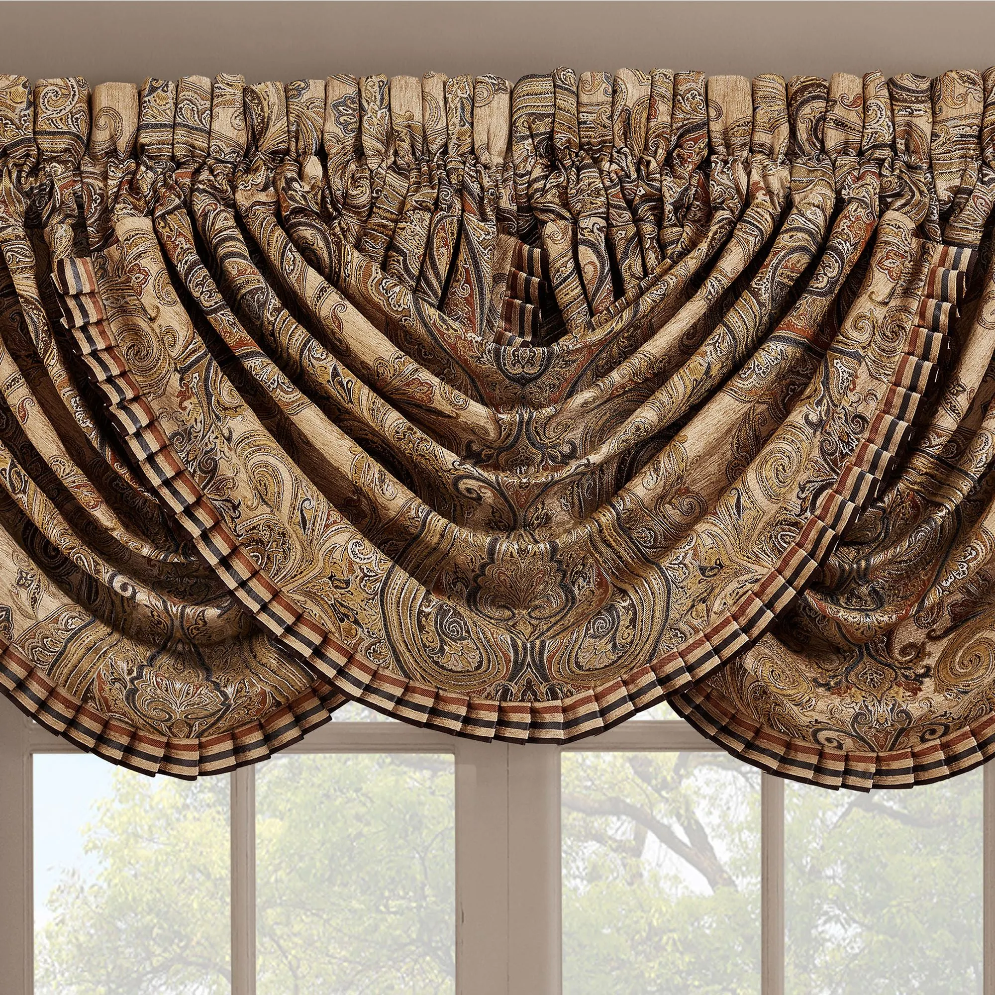 Tailored, lined Window Treatments have the woven jacquard scrolling damask pattern. Wide Curtain Pair includes tiebacks and has a 3" rod pocket. Waterfall Valance has pleated striped trim. Rod pocket is 3.25". We recommend one for every 12"-15" of window width.