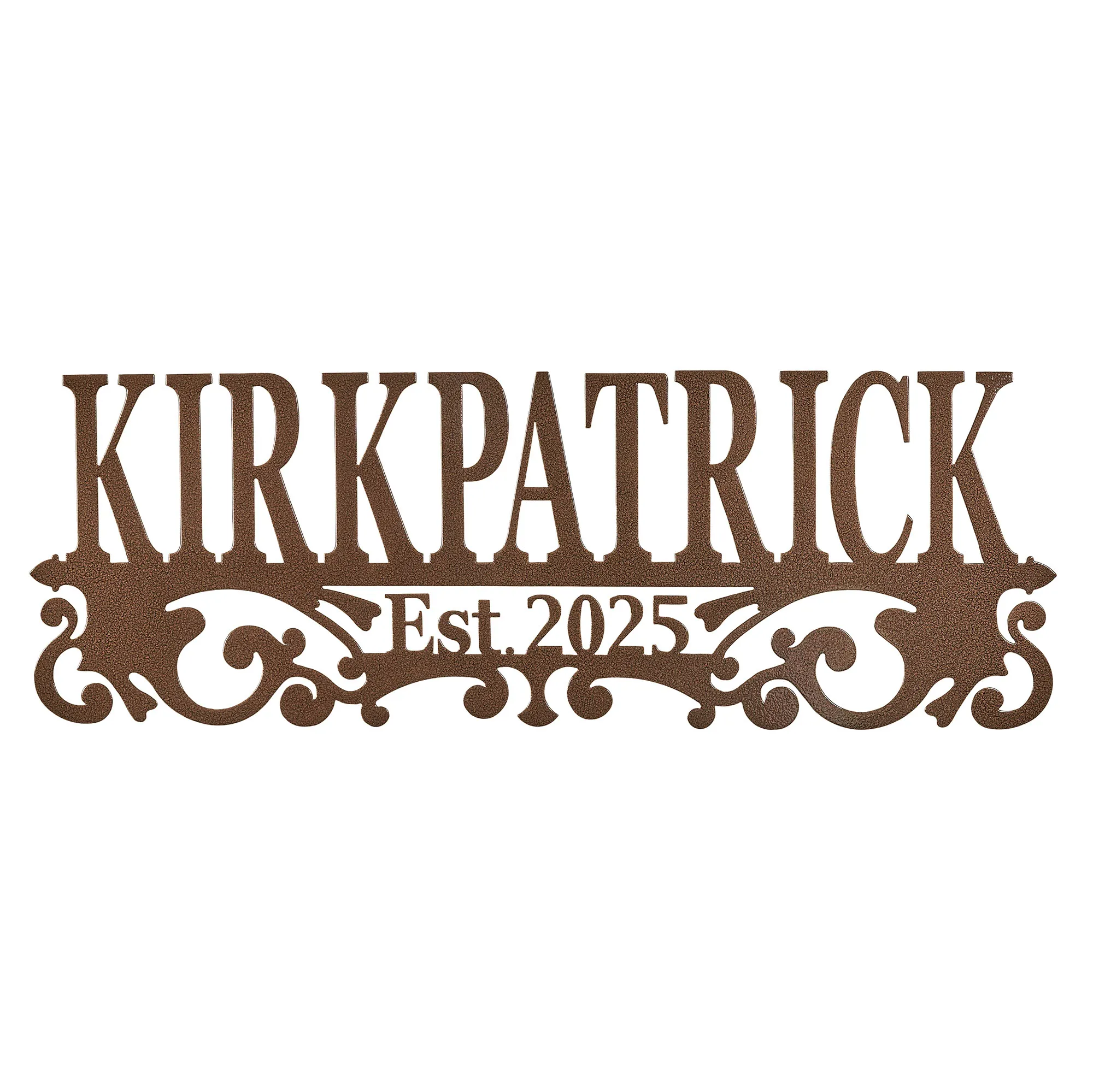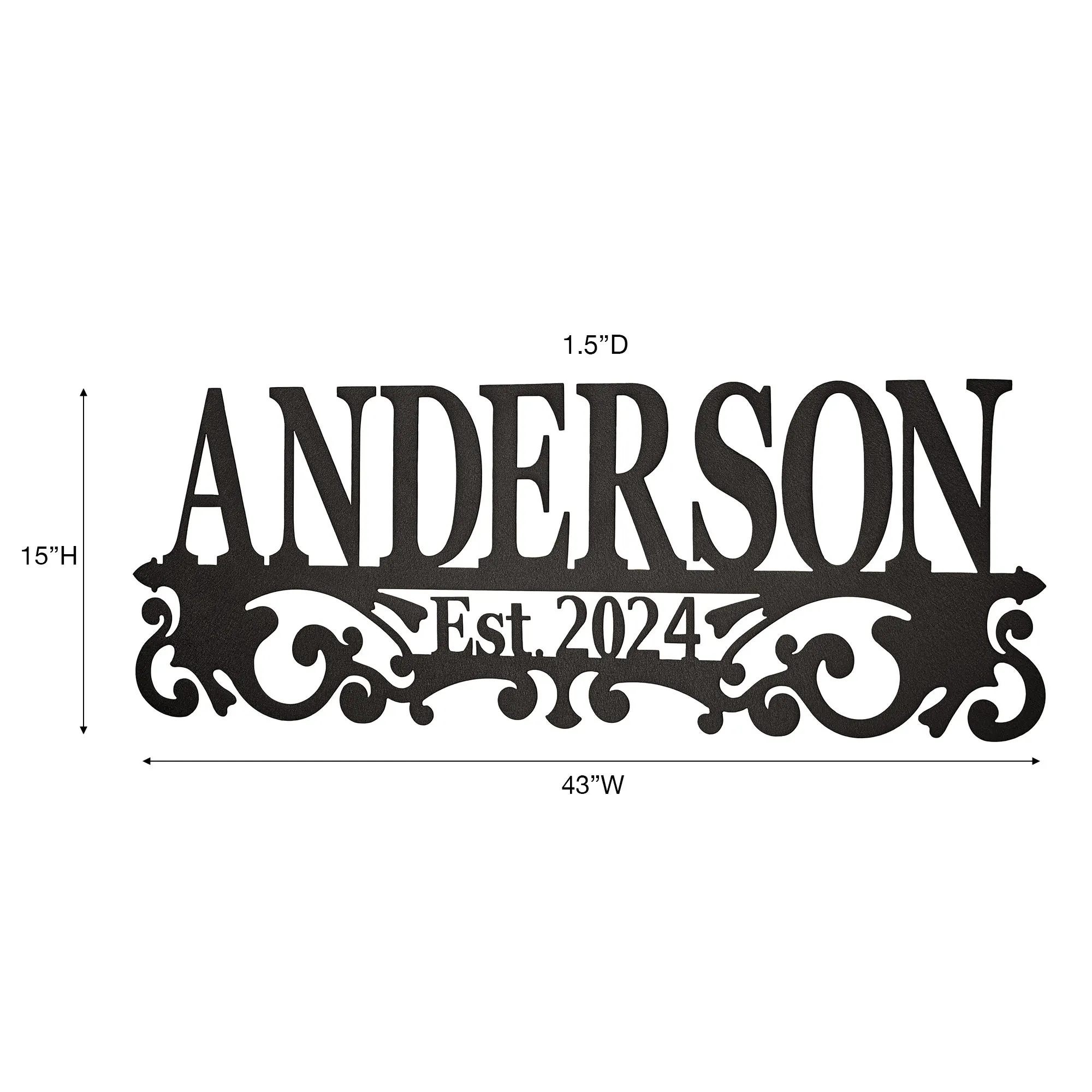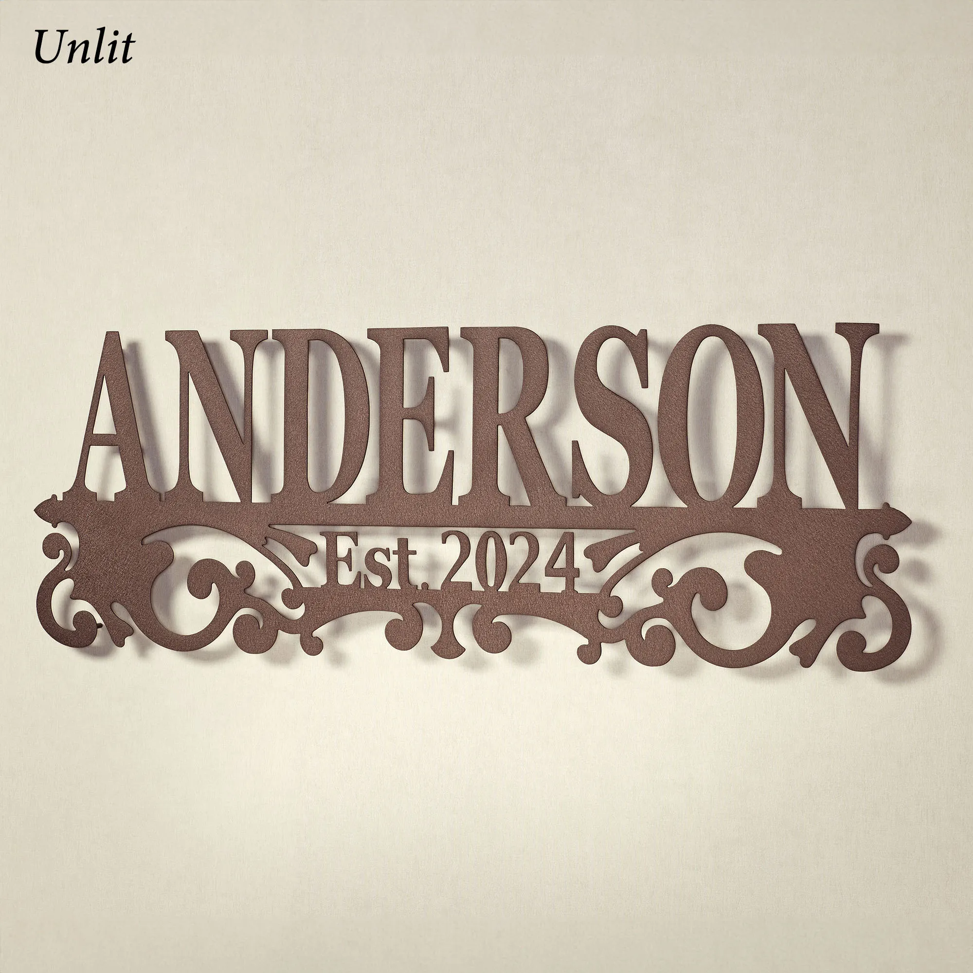 The Lucius LED Lighted Established Personalized Wall Art Sign glows with your familial pride. Designed by JasonW Studios(R), the wall art is finely handcrafted in the USA from precision-cut, 14-gauge steel and finished in a UV-, weather-, and tarnish-resistant powder coat fit for display in your indoor space, covered porch, or enclosed patio. Personalized with your name up to 14 capitalized characters, the unique design features decorative scrollwork. Warm LED lights illuminate the wall sculpture in eight various modes. The included remote makes changing functions easy and convenient, while also offering six-hour timer and dimmer options. LED lights require three of your AA batteries; remote battery is included. Surnames with a prefix will be uppercase, lowercase, and then followed by capital letters. Overall, the lighted personalized wall art measures 43"Wx1.5"Dx15"H. (C)2024 Touch of Class(R).