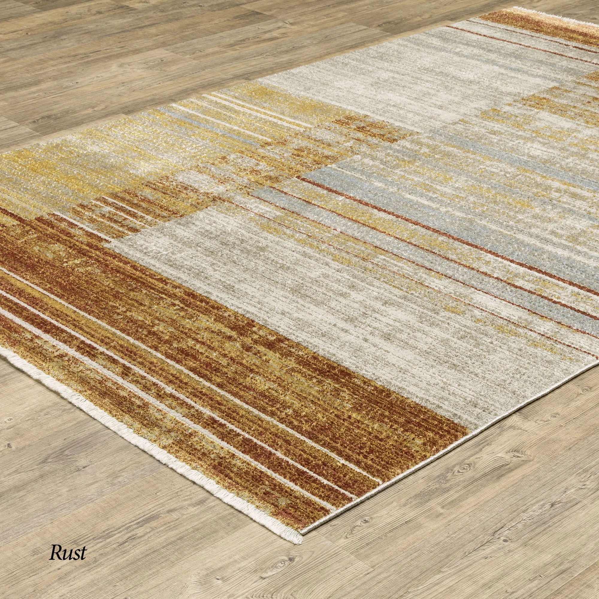 A line and block design adds to the contemporary look of the Lufia Rug. Power-loomed with recycled PET yarn, this area rug is .16" thick and has .5"L length-end fringe. Blue includes colors of blue, beige, and tan. Brown includes shades of brown, beige, and ivory. Rust includes shades of rust, gray, and beige. We recommend professional cleaning by a rug cleaner. Imported.