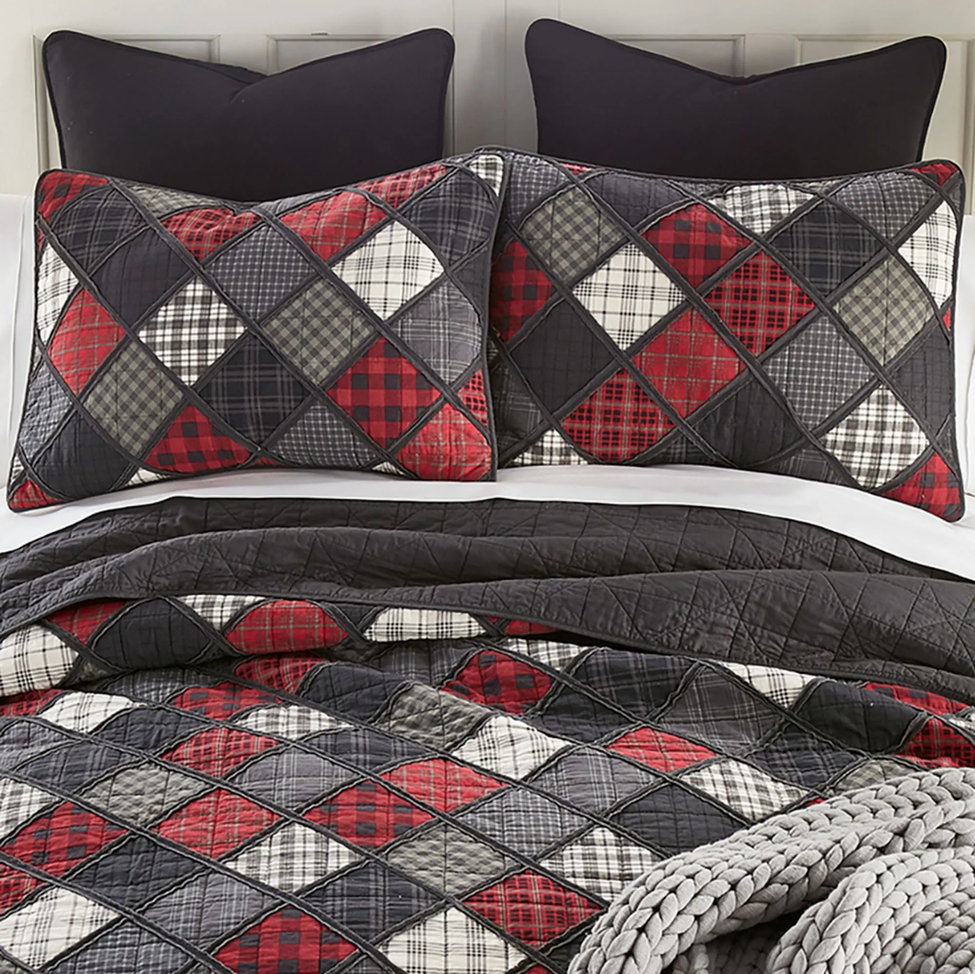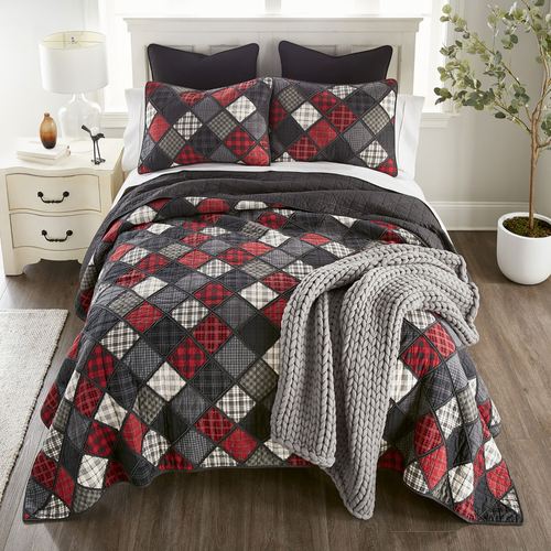 Charm your space with the rugged air of the Lumberjack Patchwork Bedding from Donna Sharp(R). The Mini Quilt Set includes a quilt and shams. The cotton bedding features a classic diamond patchwork crafted from various plaid patterns. Black, red, charcoal, and ivory hues fill the motifs, while charcoal fabric trims each block. Square quilting complements the designs. Quilt is backed in charcoal. Fill is a cotton/polyester blend. Machine washable. Imported. Sorry, the gray throw blanket shown on the bed is not available.