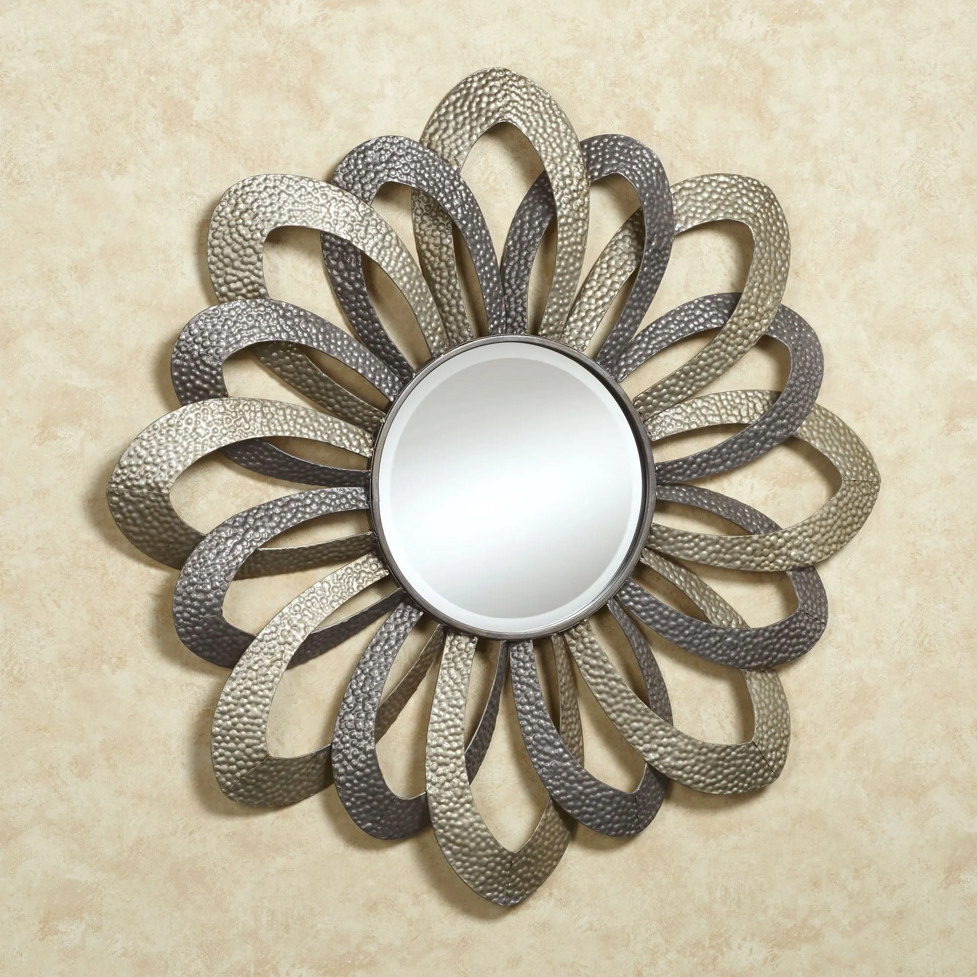 Presented with rich, elegant sophistication, the Lunar Unmasking Round Wall Mirror accentuates your home with impressive beauty. Metal wall accent features openwork, textured loops overlapping around a 12" dia. beveled glass mirror. Loops have a platinum and charcoal finish. Measures 36"dia.x2"D.