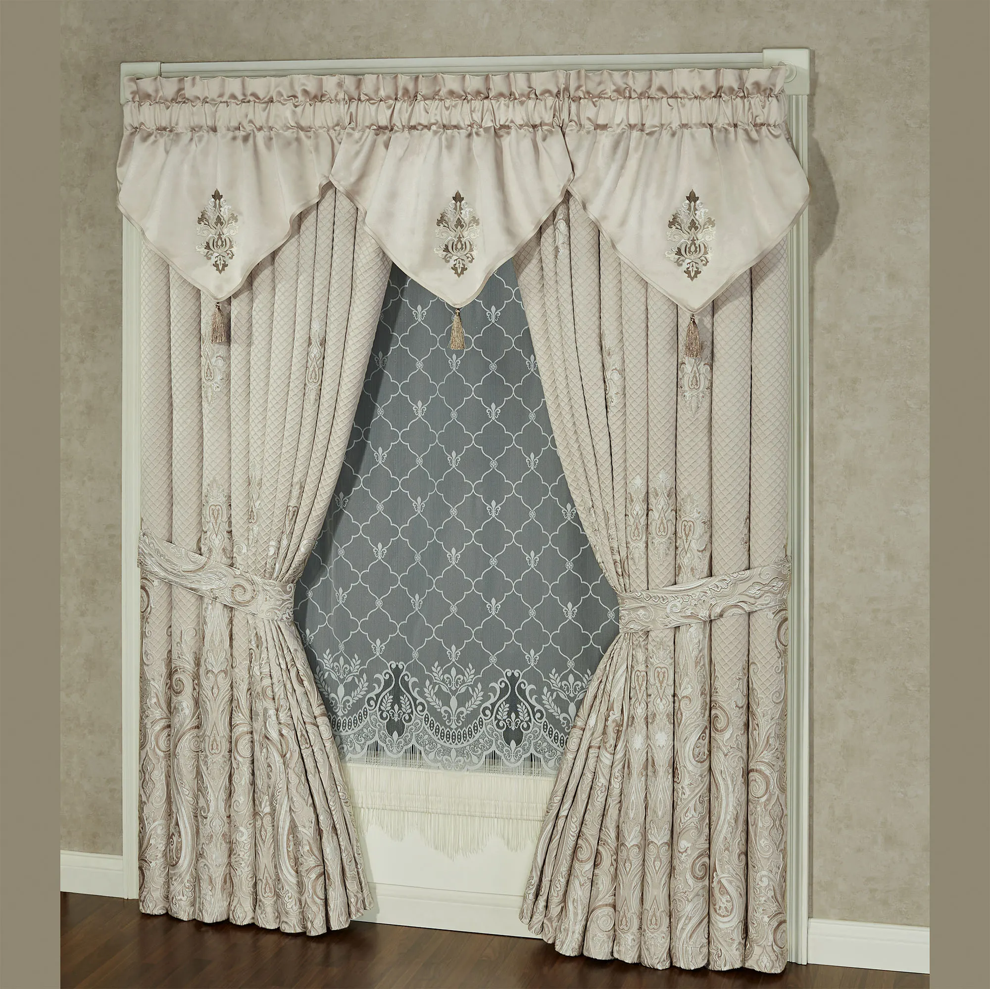 Lose yourself among the undulating medallions of the Lunata Window Treatment. The polyester window treatment has 3" rod pockets. Specify Ascot Valance or Wide Curtain Pair. Each Ascot Valance is sand with an embroidered medallion and a tassel on the end. The lined Wide Curtain Pair has tailored edges. Jacquard-woven curtains feature a sand diamond latticework ground embellished with sprawling almond and ivory scrollwork medallions and cascading miniature medallions. Tiebacks are included. Dry clean only. Imported. The curtain pair width is the total width of two panels together.