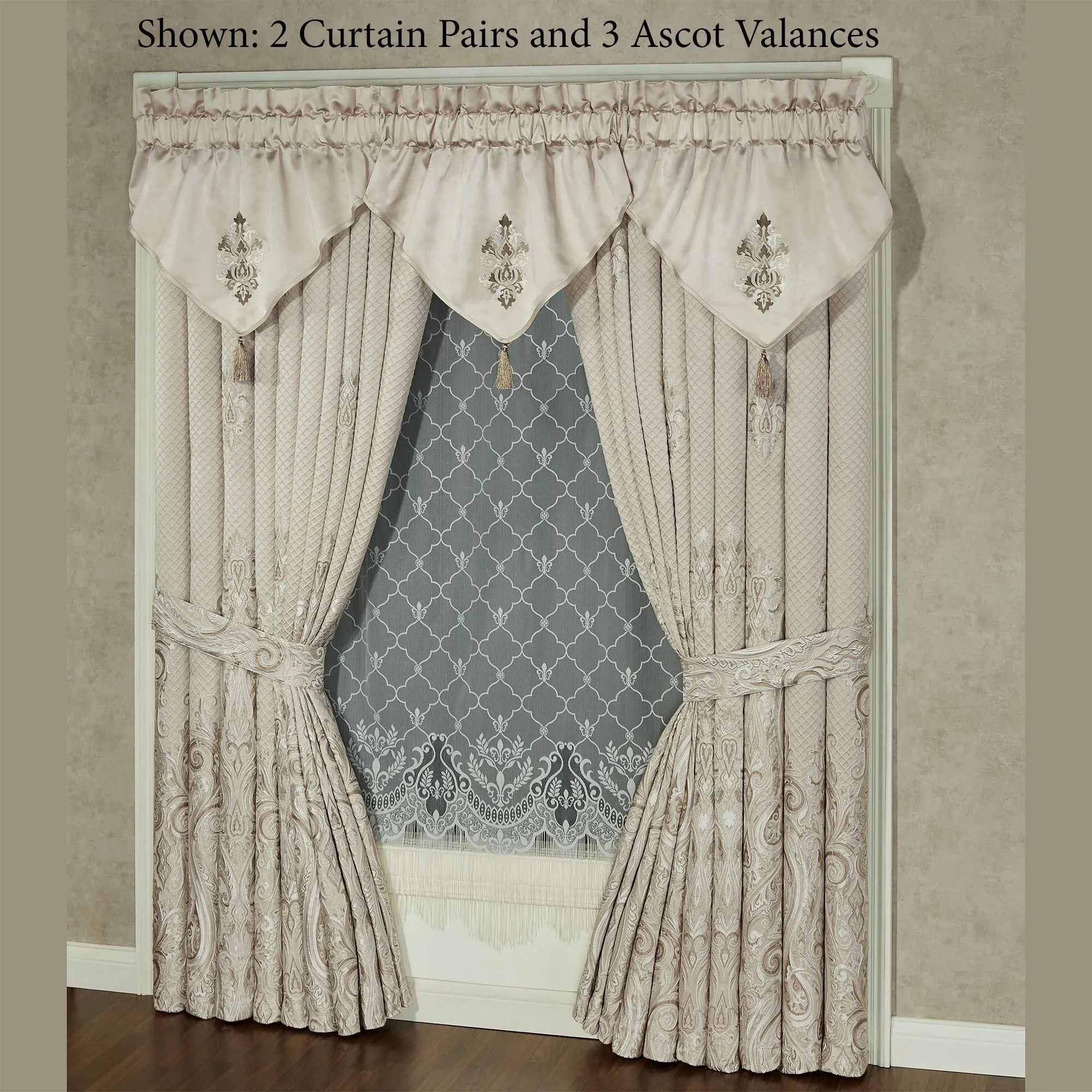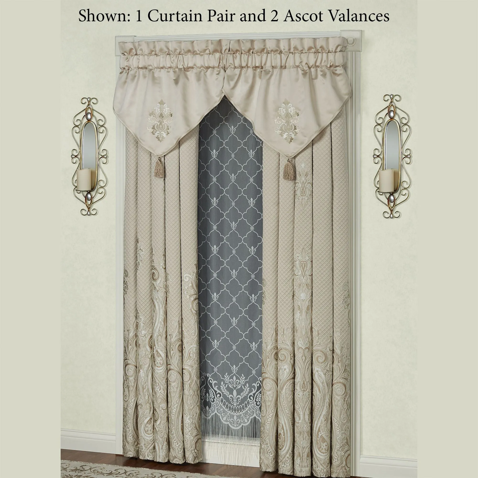 Window Treatment has 3" rod pockets. The lined Wide Curtain Pair has tailored edges. Tiebacks are included. Curtains are available in two lengths. Each Ascot Valance is sand with an embroidered medallion and a tassel on the end. The lined Scalloped Valance has a medallion top, diamond bottom, and gimp trim.