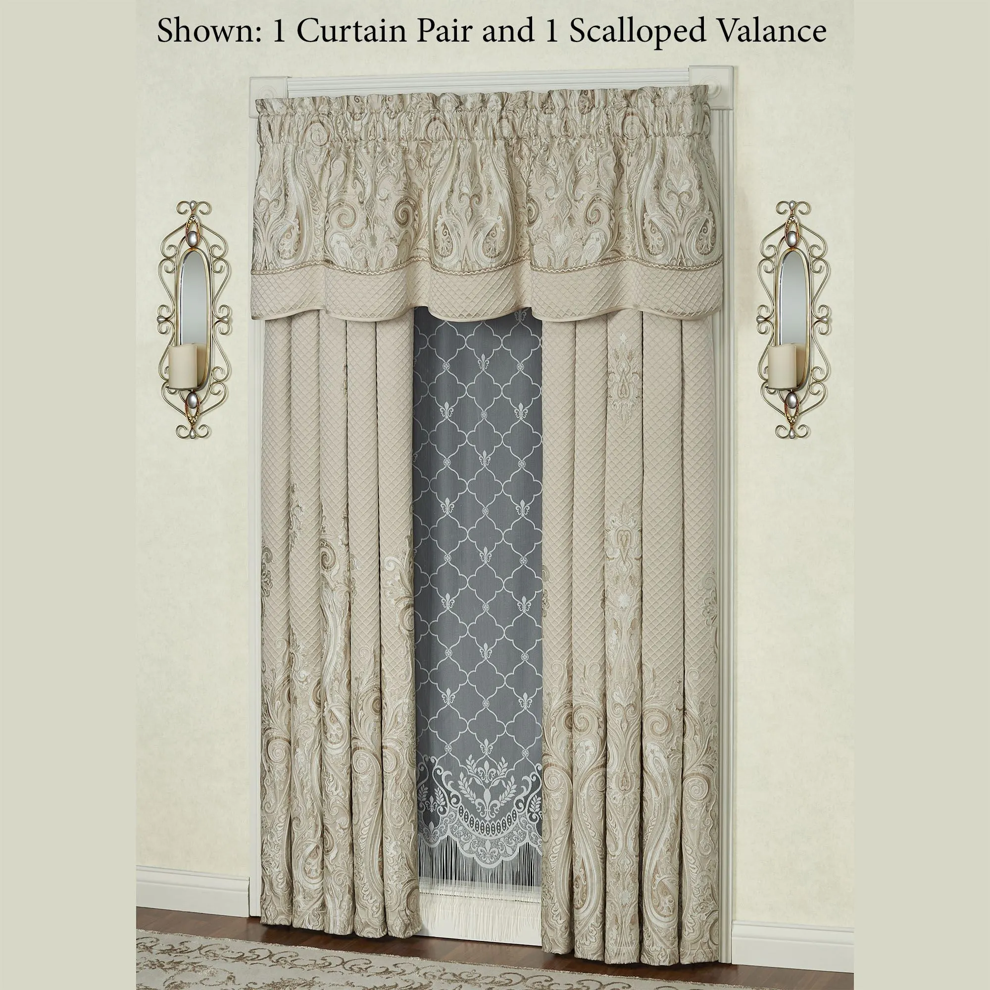Window Treatment has 3" rod pockets. Wide Curtain Pair is 100"W; choose 84"L or 95"L. Each Ascot Valance is 40"Wx21"L. Scalloped Valance is 72"Wx20"L.