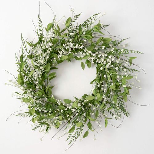 The Lush Leaf and Berry Wreath is a simple arrangement for any season. This wreath features white berries and polyester greenery. Use the natural hanger to hang. This item will need to be fluffed after removing from the box. For indoor use only. Measures approx. 24"dia.x7"D.