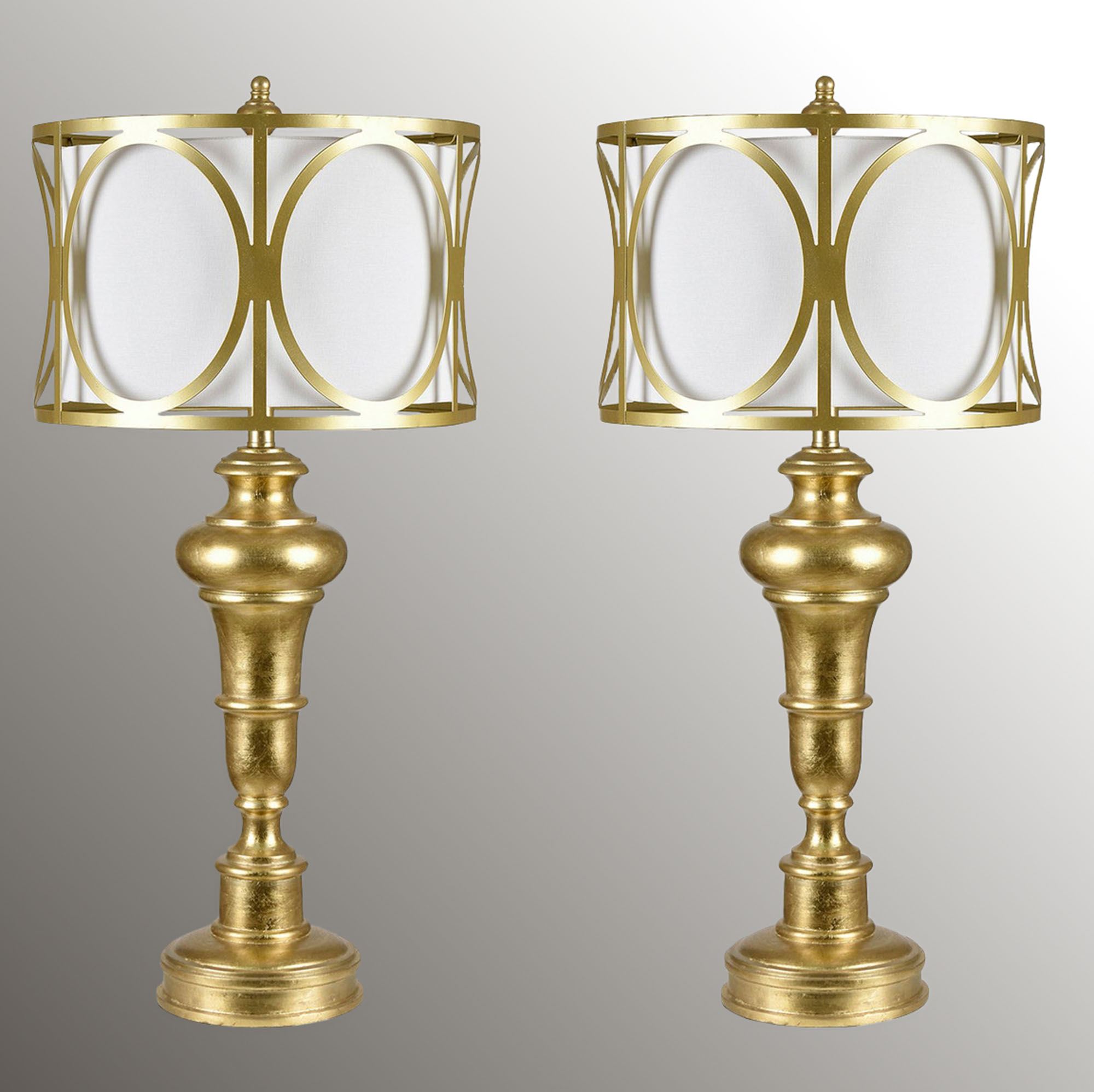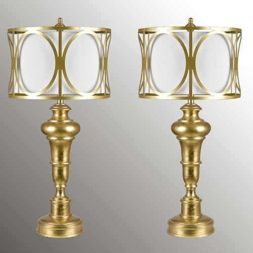 The Luxborough Table Lamp Pair is the epitome of exquisite style. These resin table lamps have candlestick-style fonts, round bottom bases, and openwork outer shades finished in gold. The inner fabric shades are white. UL listed. Each lamp requires one 150W max. 3-way bulb, not included, and measures 16"dia.x34"H, including the 2.75"H finial. Pair weighs 22 lbs.