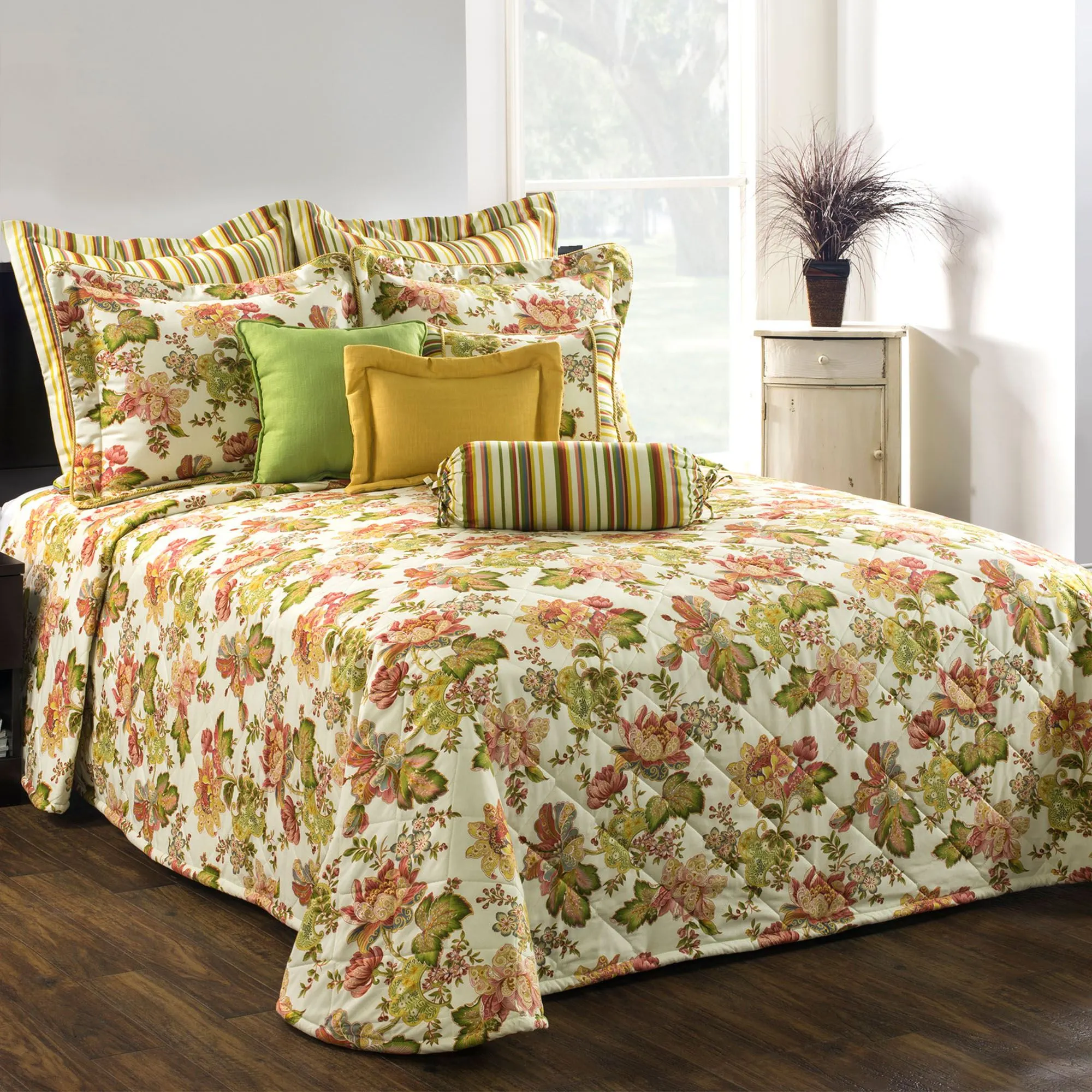 The Bedspread has printed designs on a woven ivory background, jumbo piping, and box quilting. Back is ivory cotton/polyester. For bedspread, choose Full/Queen, King, or Cal King.