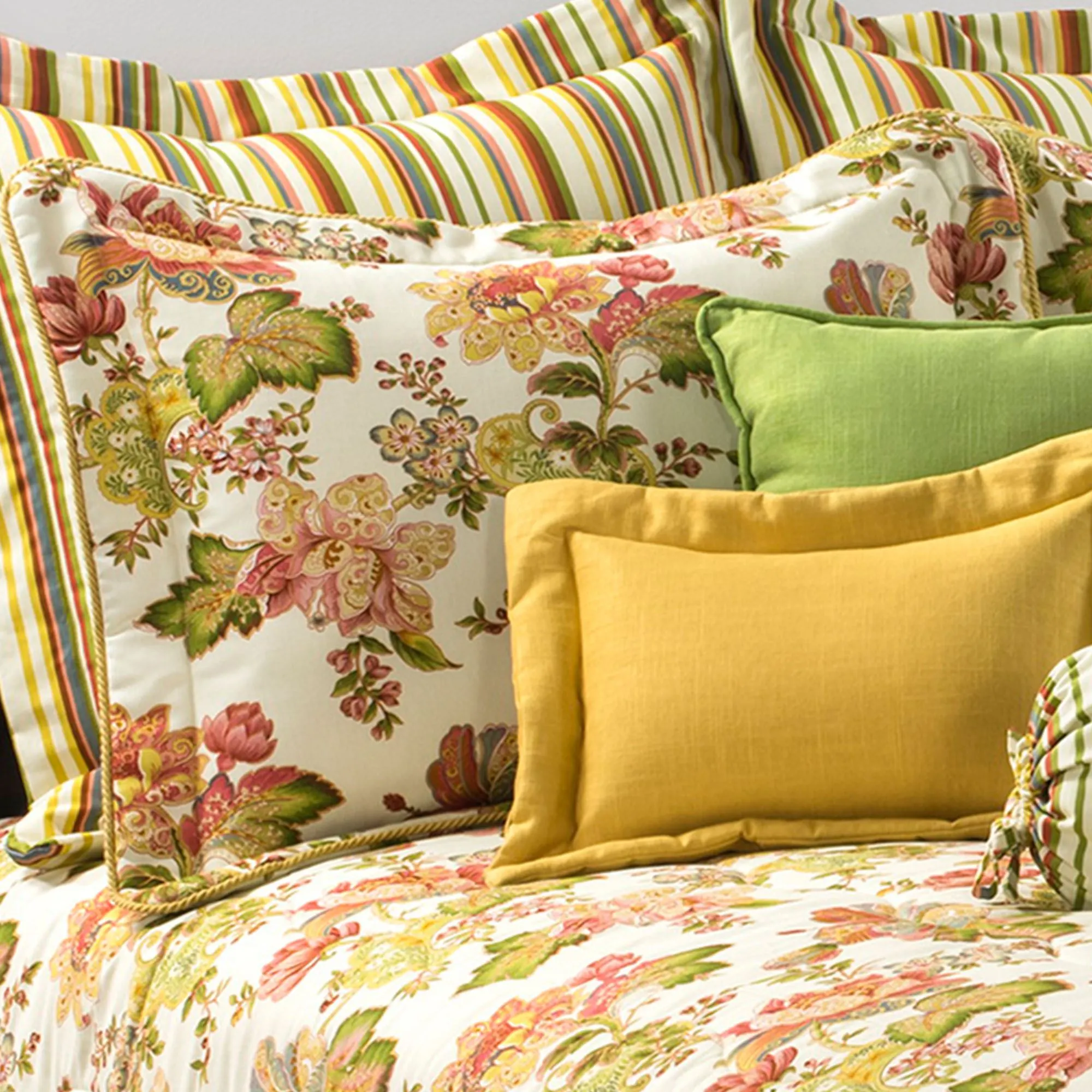 Pillows: Spot clean. The reversible, woven Square is solid peridot with piping. Tailored Neckroll has a stripe print and tie ends. Pieced Rectangle has printed florals and stripes with twist cording; pillow is reversible to the printed floral pattern. The Woven Rectangle is goldenrod with flanged edges and a French back closure.