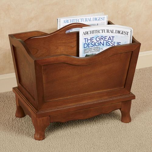 Finely handcrafted from solid hardwood and veneers, the Lyndhurst Magazine Rack features magnificent artistry and a regal walnut finish. The two compartments hold periodicals neatly to cut down on clutter. Each compartment is 17"Wx5"D. Magazine holder is embellished with peaked, arched aprons and shaped feet. A handle in the center allows for easy mobility. Measures 18"Wx11"Dx17"H; weighs 13 lbs.