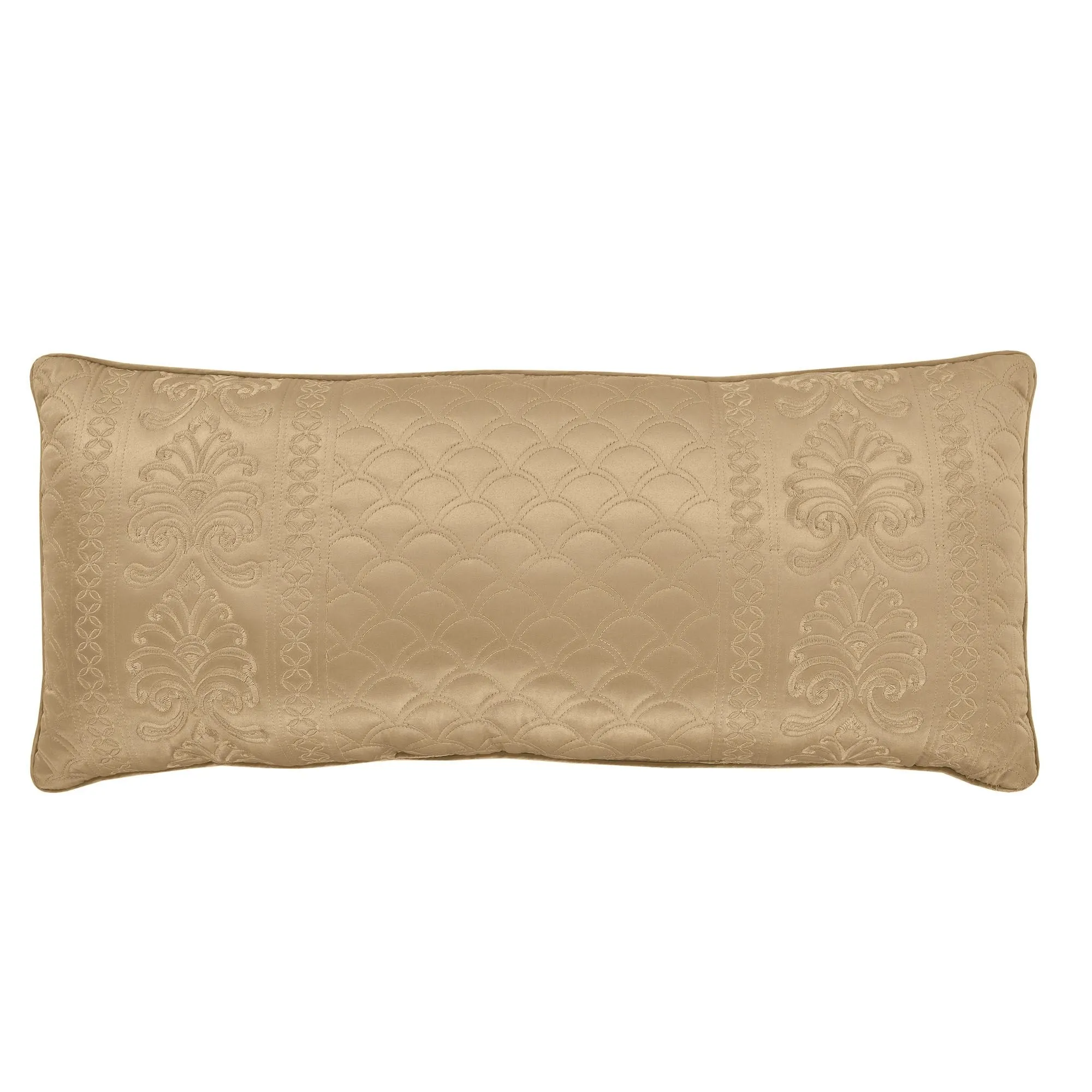 Adorn your bedroom with an embroidered and quilted masterpiece, the Lyndon Gold Quilt from J. Queen New York. The solid gold quilt is a luxurious matte satin polyester and features a machine-quilted center in fanning motifs, a mitred frame of damask and mini foulard embroidery, bound edges, and a coordinating solid color back. Fill is polyester. Dry clean only. Imported.