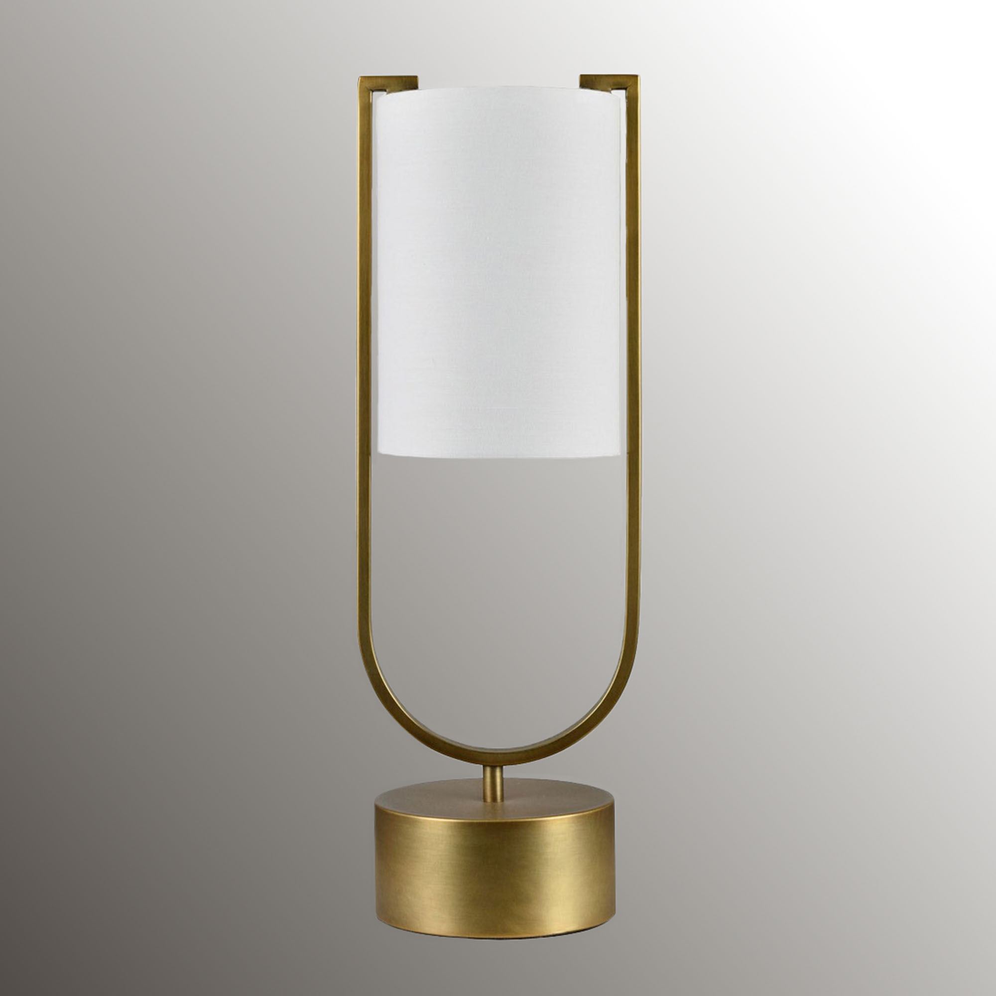 The Lynx Table Lamp marvels with a sleek shape and unique design. Finished in dark gold, the metal lamp features a thick round base and openwork u-shaped font in a chic geometric design. A tall white fabric shade completes the look. Requires one 40W max. bulb that operates via the on/off switch on the cord. UL listed. Overall, the accent table lamp measures 6.5"dia.x22"H.