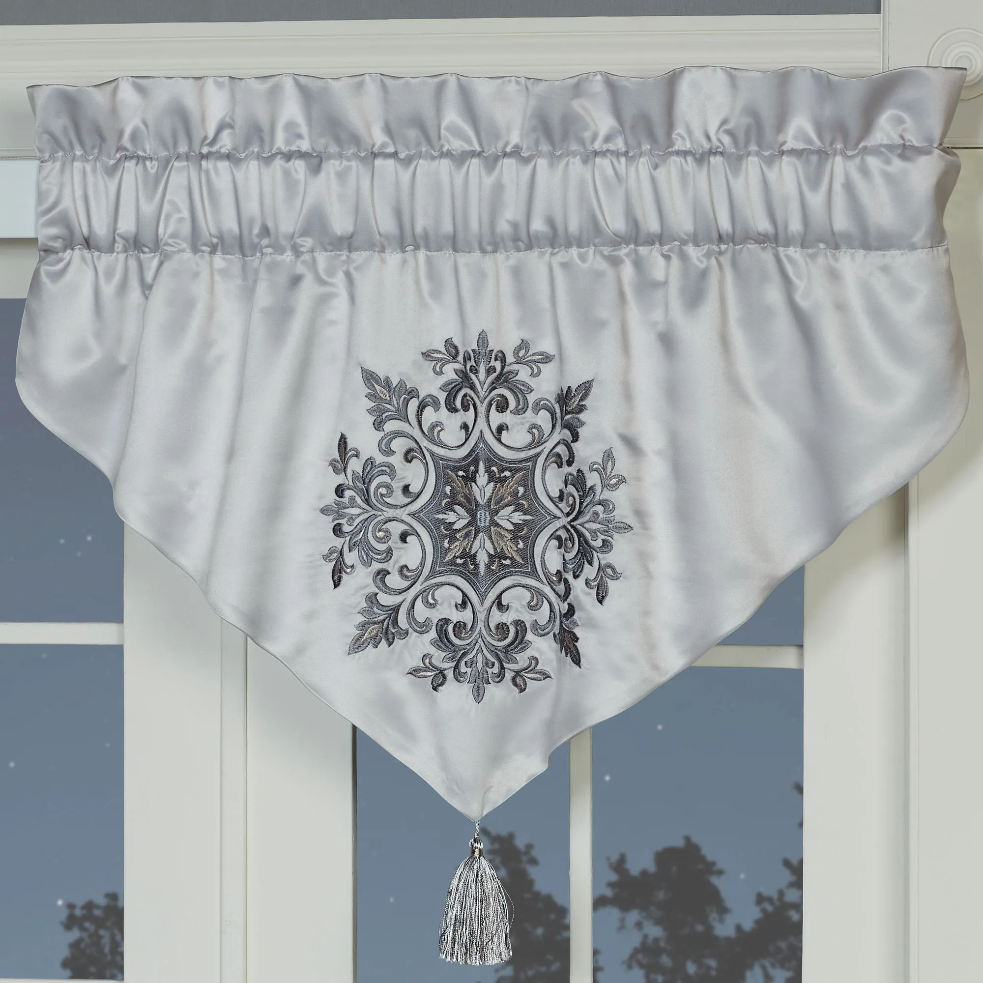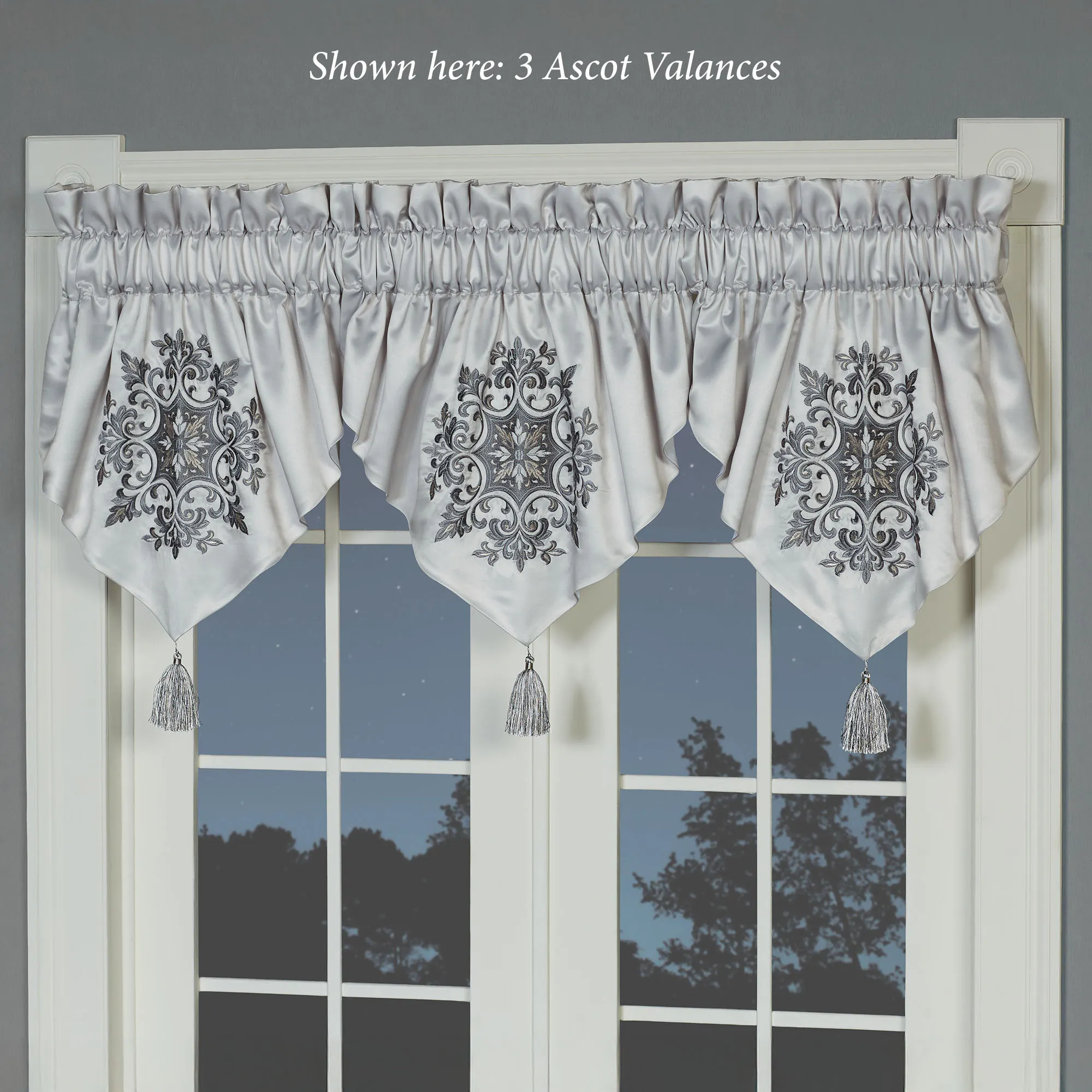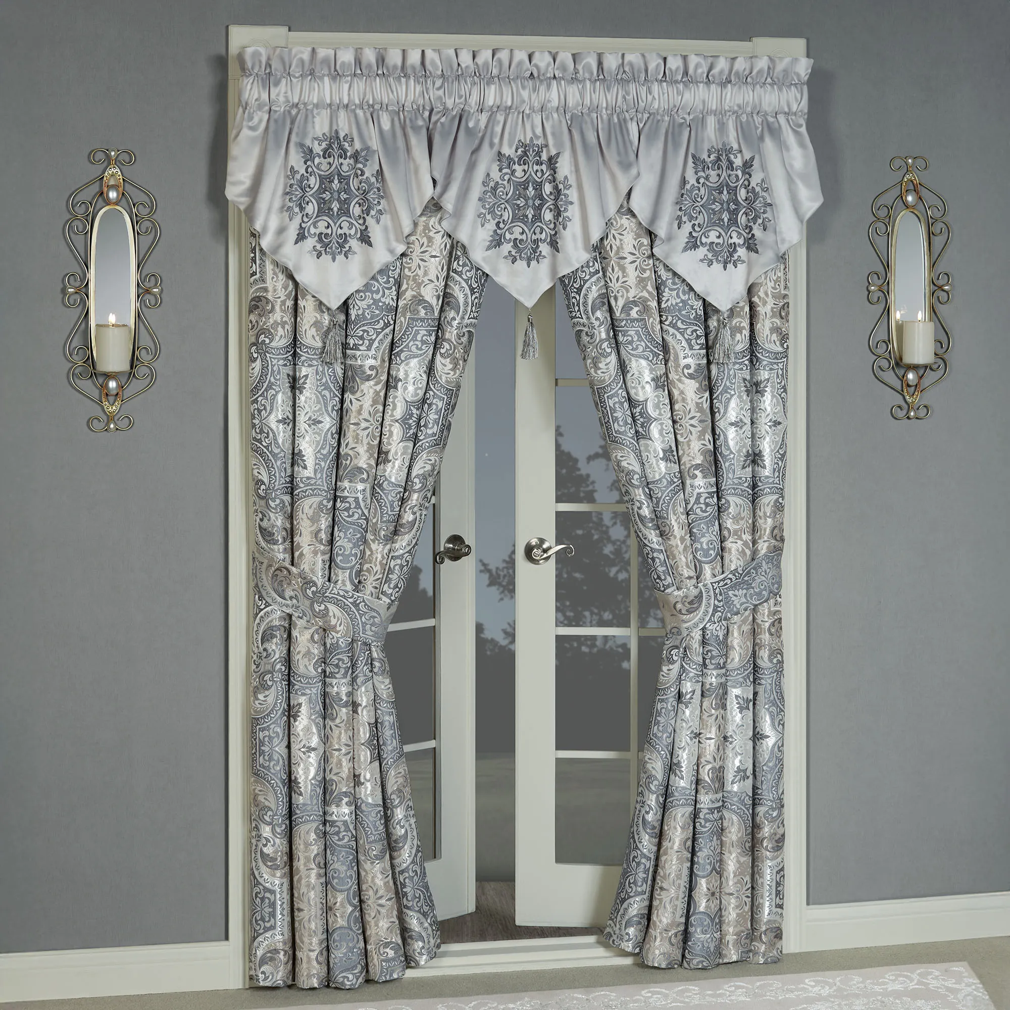 Meticulously detailed damask medallion designs flourish with sophisticated elegance on the stunning Lyra Window Treatment. This elegant polyester window treatment is lined and has 3" rod pockets. Colors include shades of slate, champagne, platinum, and silver. Specify Ascot Valance or Wide Curtain Pair. Each Ascot Valance has embroidery on platinum and a tassel on the bottom. The tailored Wide Curtain Pair has all-over woven-jacquard damask medallions and includes tiebacks. Dry clean. Imported. The curtain pair width is the total width of two panels together.