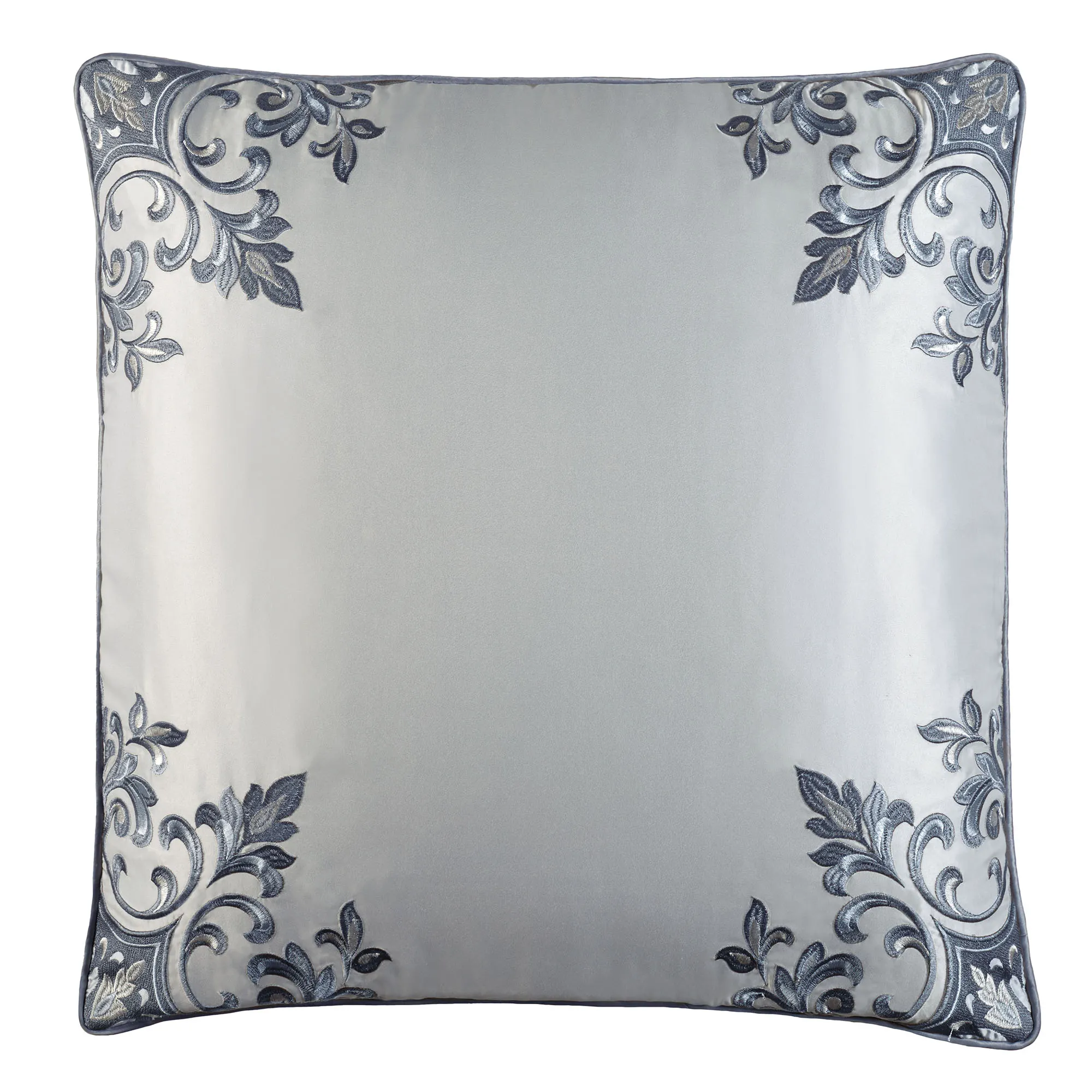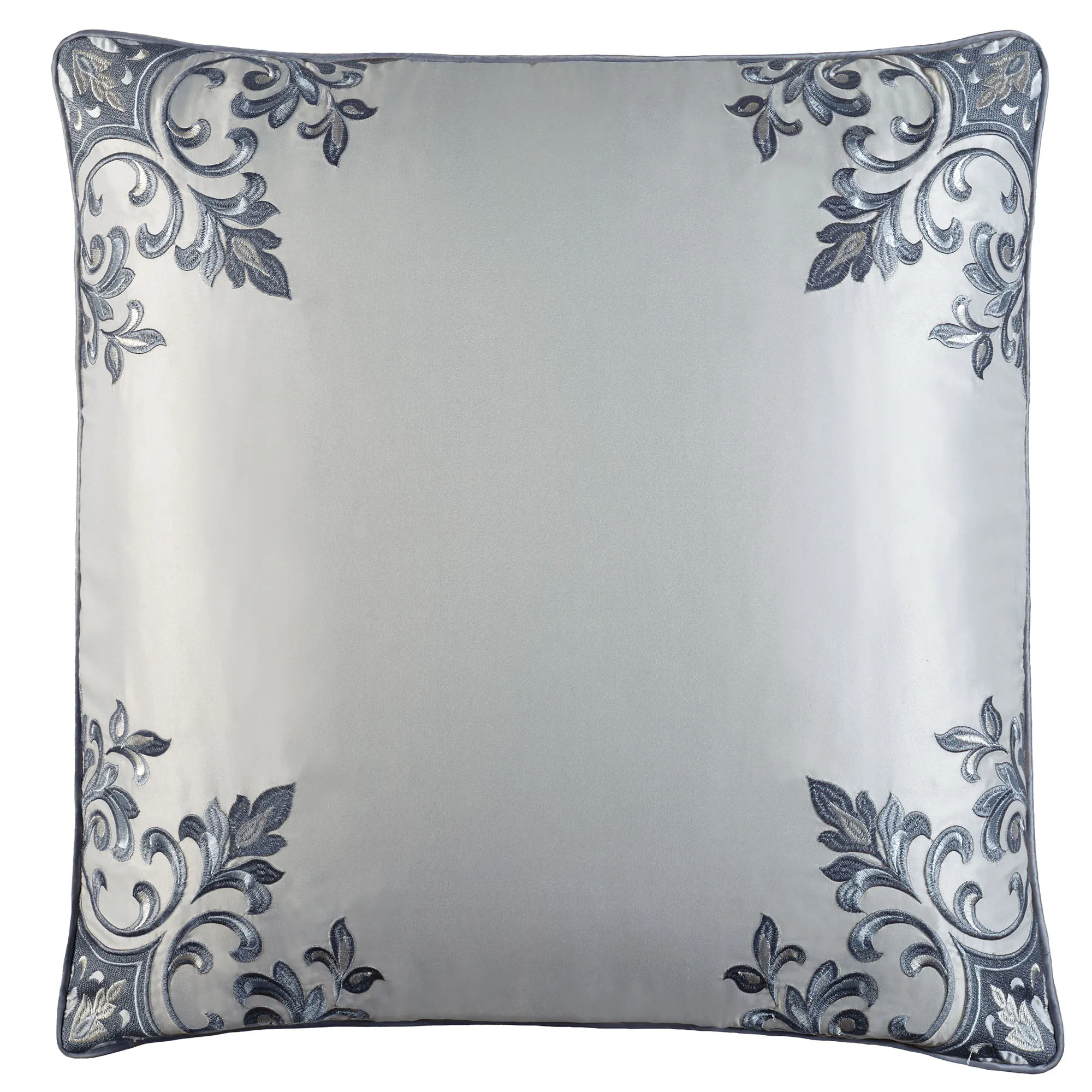 European Sham has scroll embroidery on platinum, piped ends, and a zipper closure. The European sham may be monogrammed for an extra charge. Monogramming is shown in the Gray thread color.