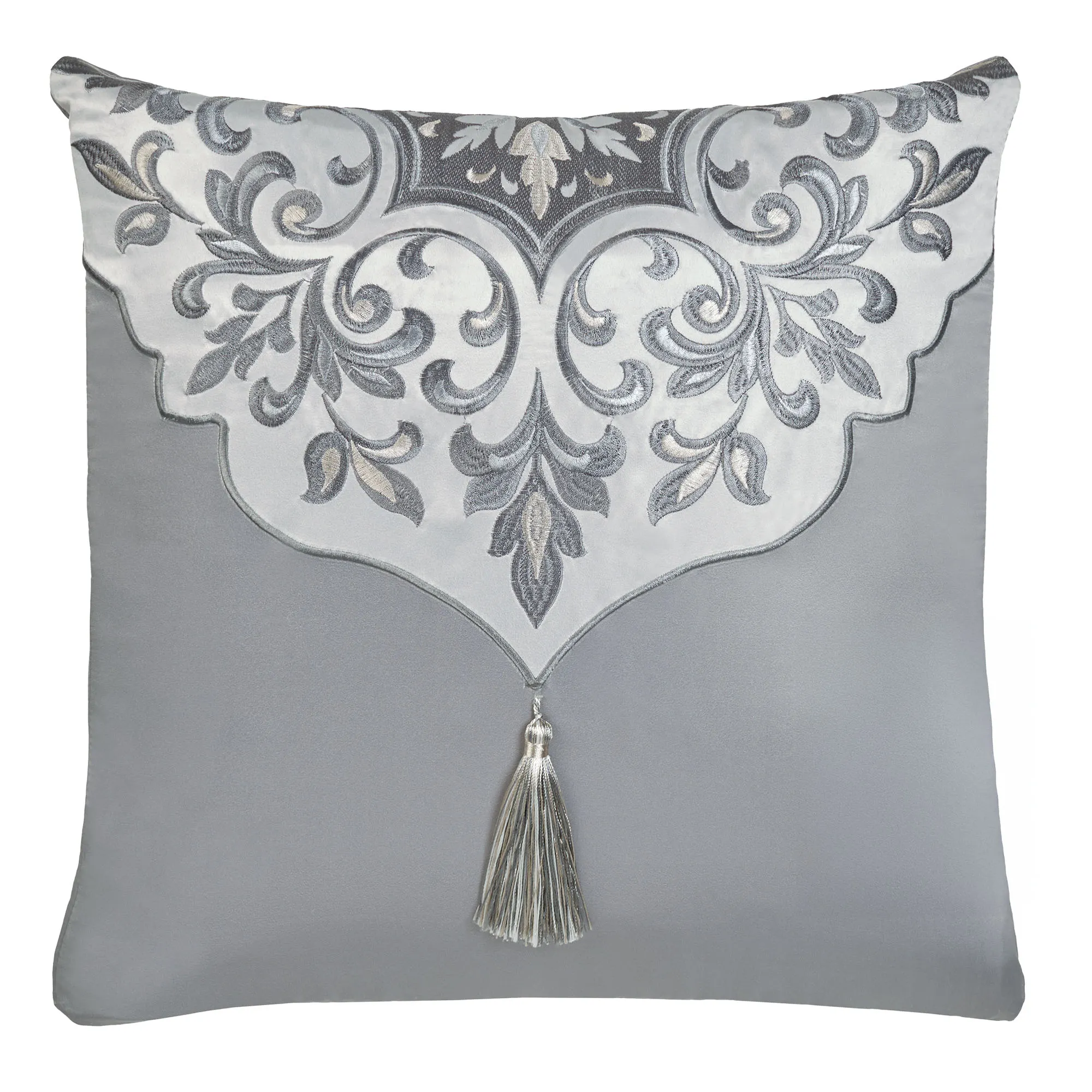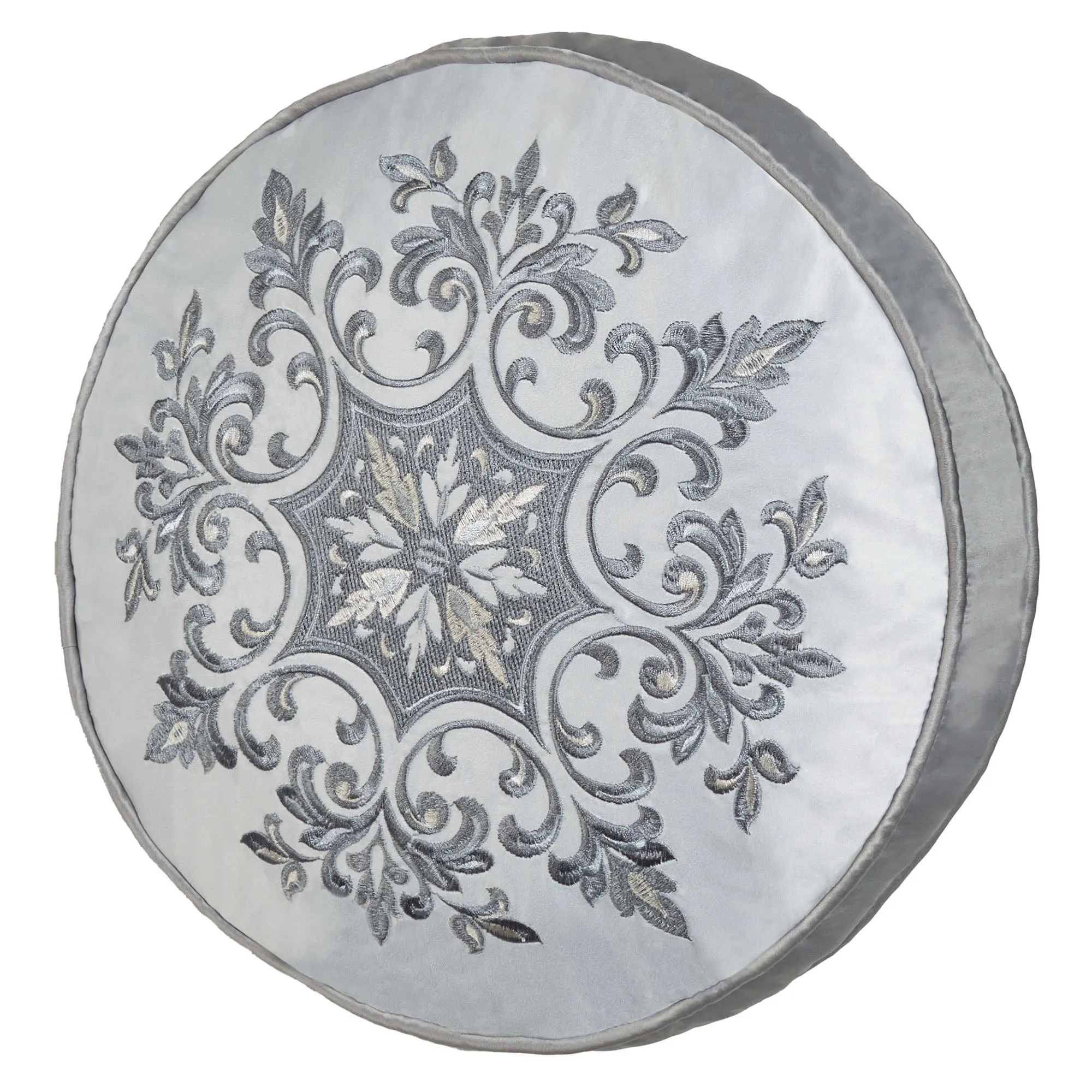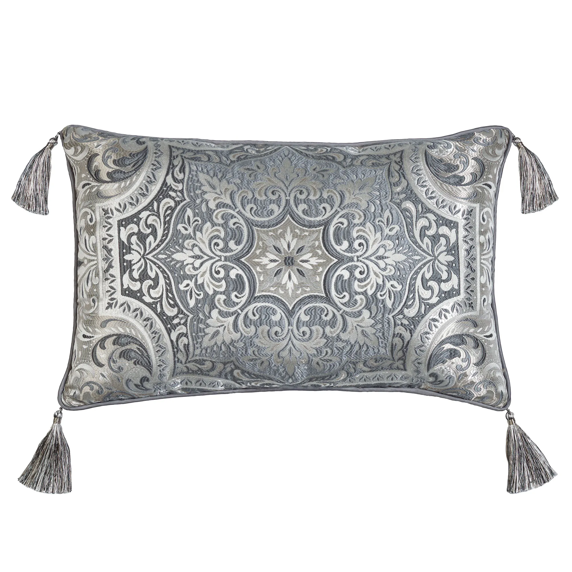 Pillows: Spot clean. Round has scroll embroidery on platinum, piped ends, and a 2" side gusset. Rectangle has damask medallions, piped ends, and corner tassels. The tailored Square is pieced with embroidery and a tassel accent.