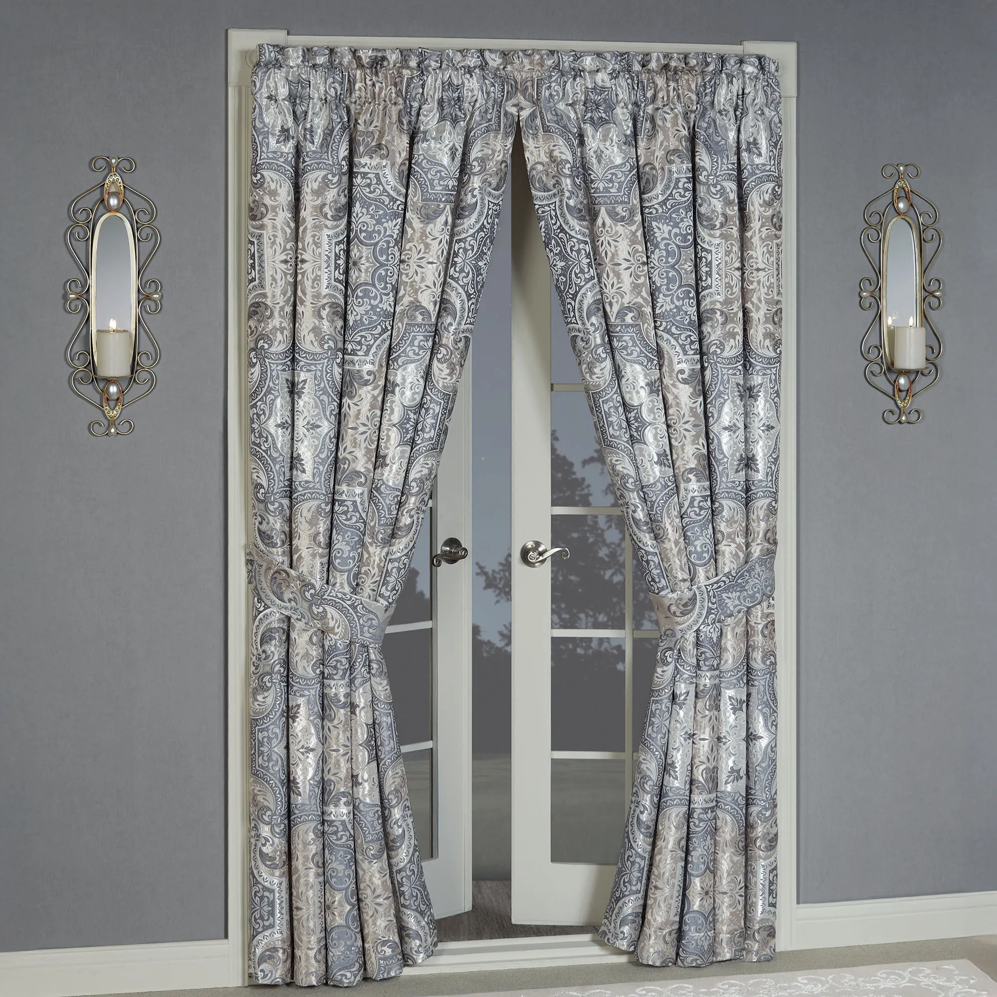 Lined Window Treatments have 3" rod pockets. The tailored Wide Curtain Pair has damask medallions and includes tiebacks. Each Ascot Valance has embroidery on platinum and a tassel on the bottom. The pieced Scalloped Valance has damask medallion motifs and a solid slate bottom with gimp trim.