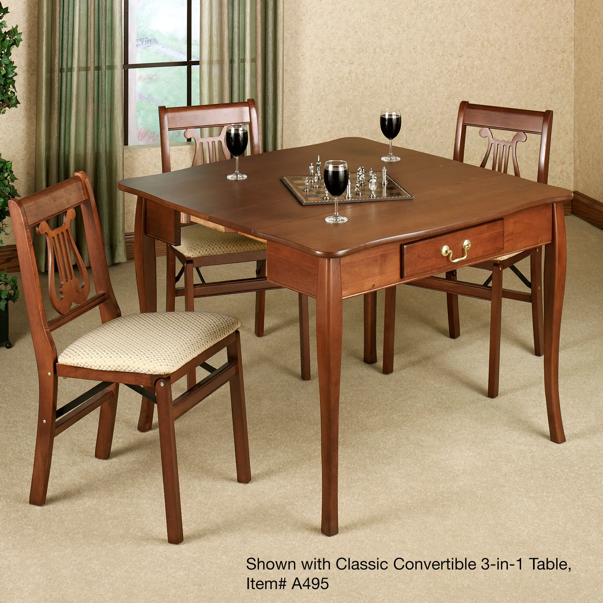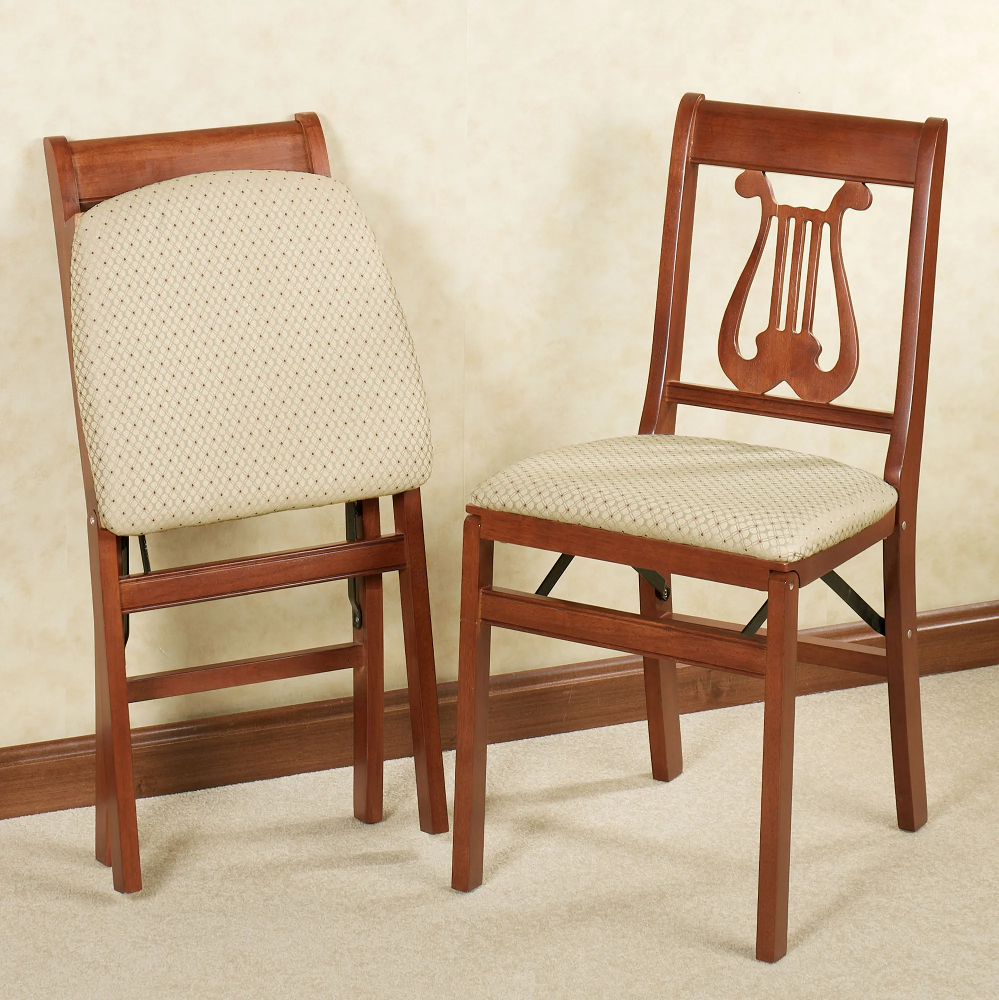 The handcrafted, hardwood Lyre Folding Chairs by Stakmore are paragons of convenience, possessing the appearance of fine, permanent furniture, yet perfect to use with a game table or when company drops by. Finished in cherry, these traditional chairs have lyre-shaped backs and square legs. Each chair features a folding mechanism that allows it to be easily and compactly stored away when not in use. Padded seat cushions are covered in a jacquard-woven polyester fabric, which features a lattice design accented with bordeaux dots. Furnishings are stained with a water-based stain, sealed, and top-coated for protection. Sold as a pair. No assembly required.