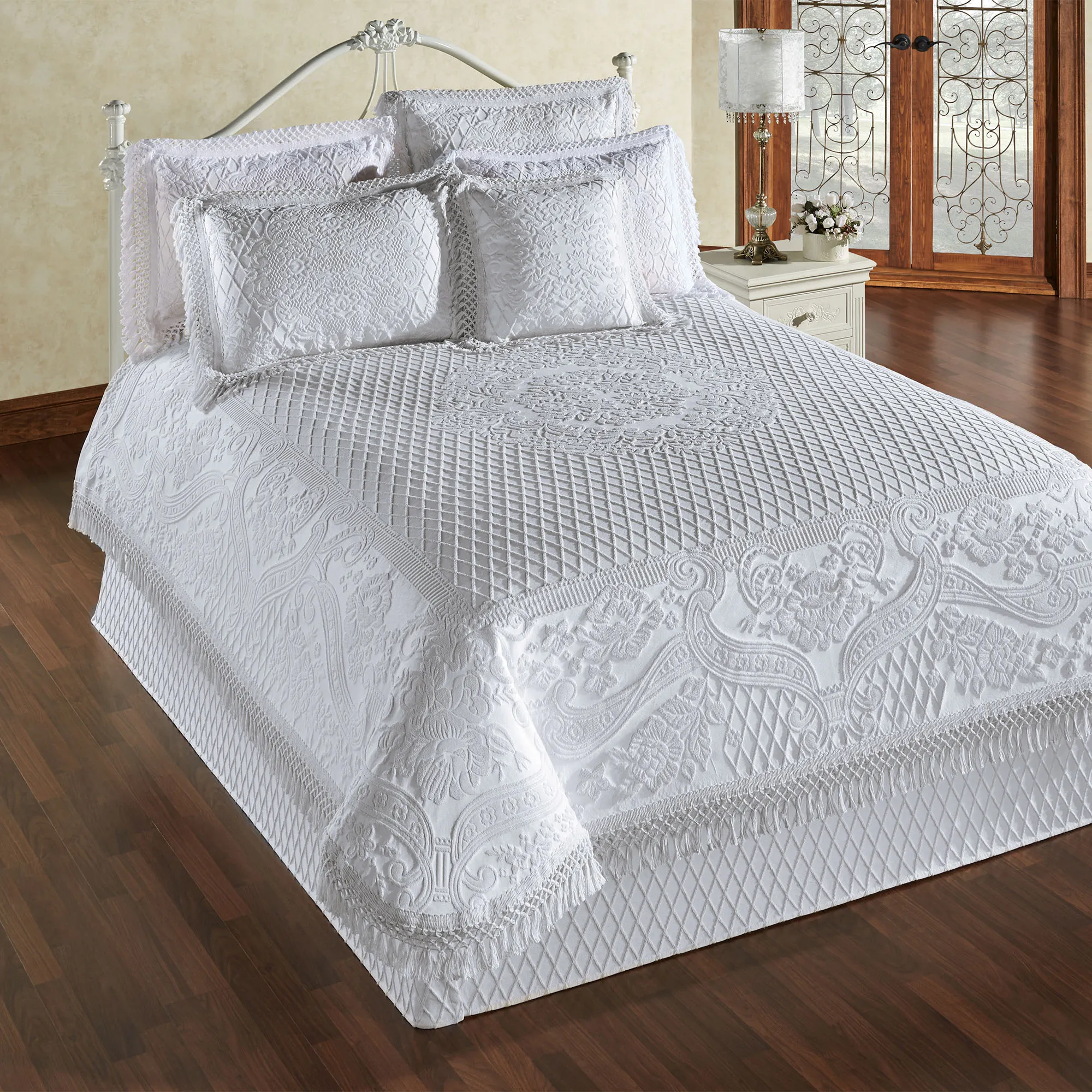 Matelasse Coverlet has a central floral and scroll pattern surrounded by woven diamonds and framed by intricate florals and scrolls. Oversized coverlet fits mattresses up to 15". Knotted flange with fringe completes three sides. Specify coverlet size: Full, Queen, King, or Cal King.