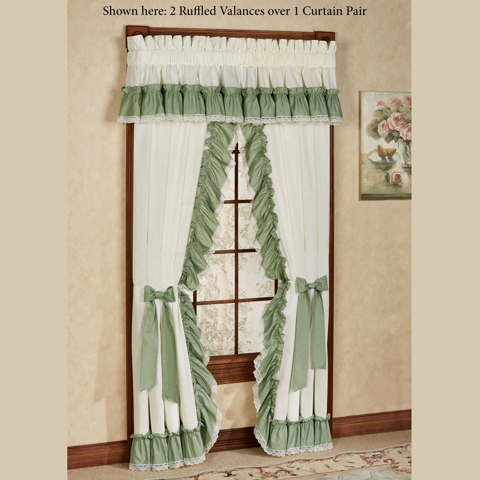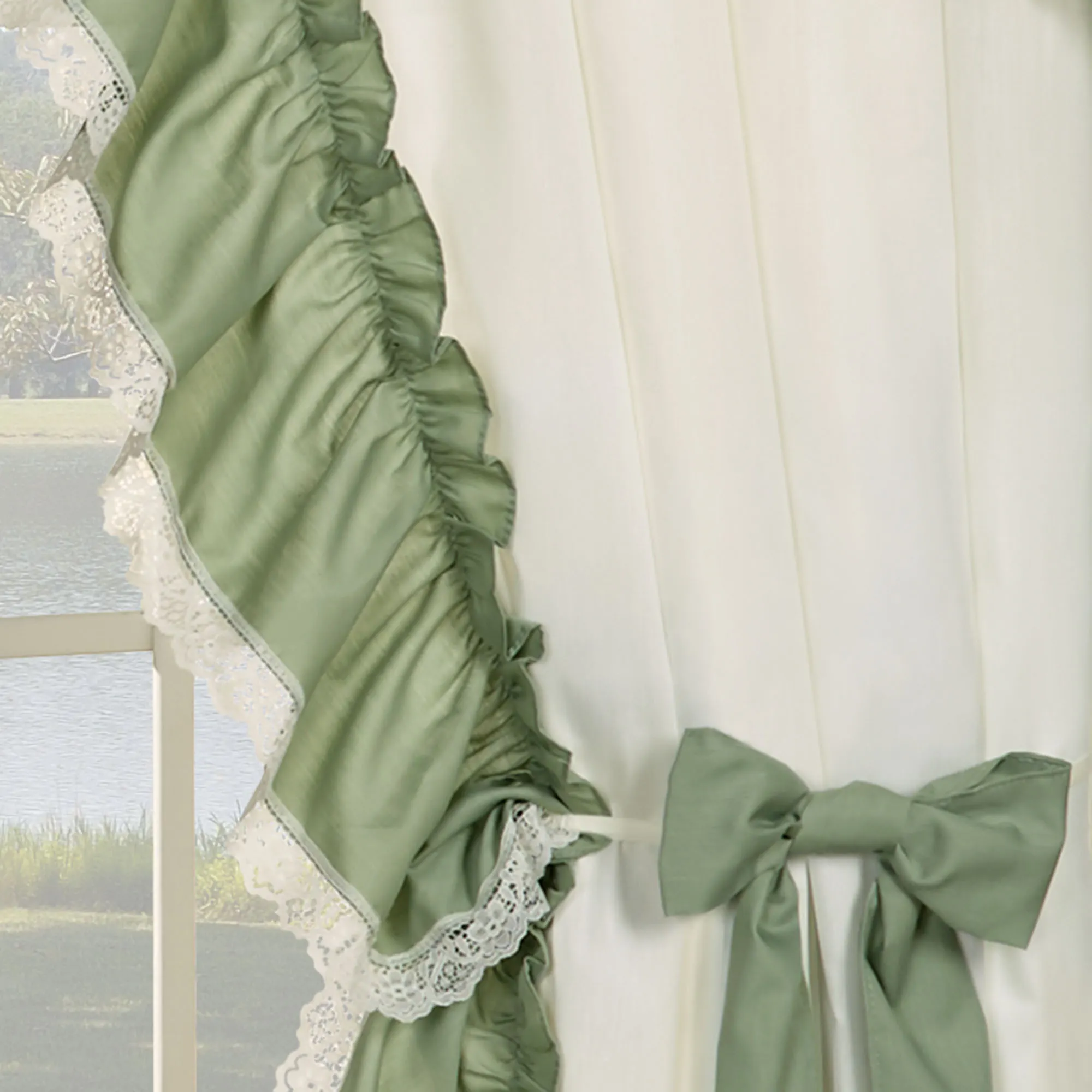 The Madelyn Ruffled Window Treatment is perfect for a simple, frilly look. Made from solid color, polyester/cotton, this window treatment features ruffled accents trimmed with lace. Sage is light cream with a sage ruffle. Cerulean Blue is light cream with a cerulean blue ruffle. Light Cream is solid light cream. White is solid white. Priscilla Curtains include bow tiebacks. Specify Priscilla Curtain Pair, Ruffled Valance, or Swag Valance Pair. 3" rod pockets. Length measurement includes the header (except on Ruffled Valance). Machine wash. Imported/USA. The curtain pair width is the total width of two panels together.