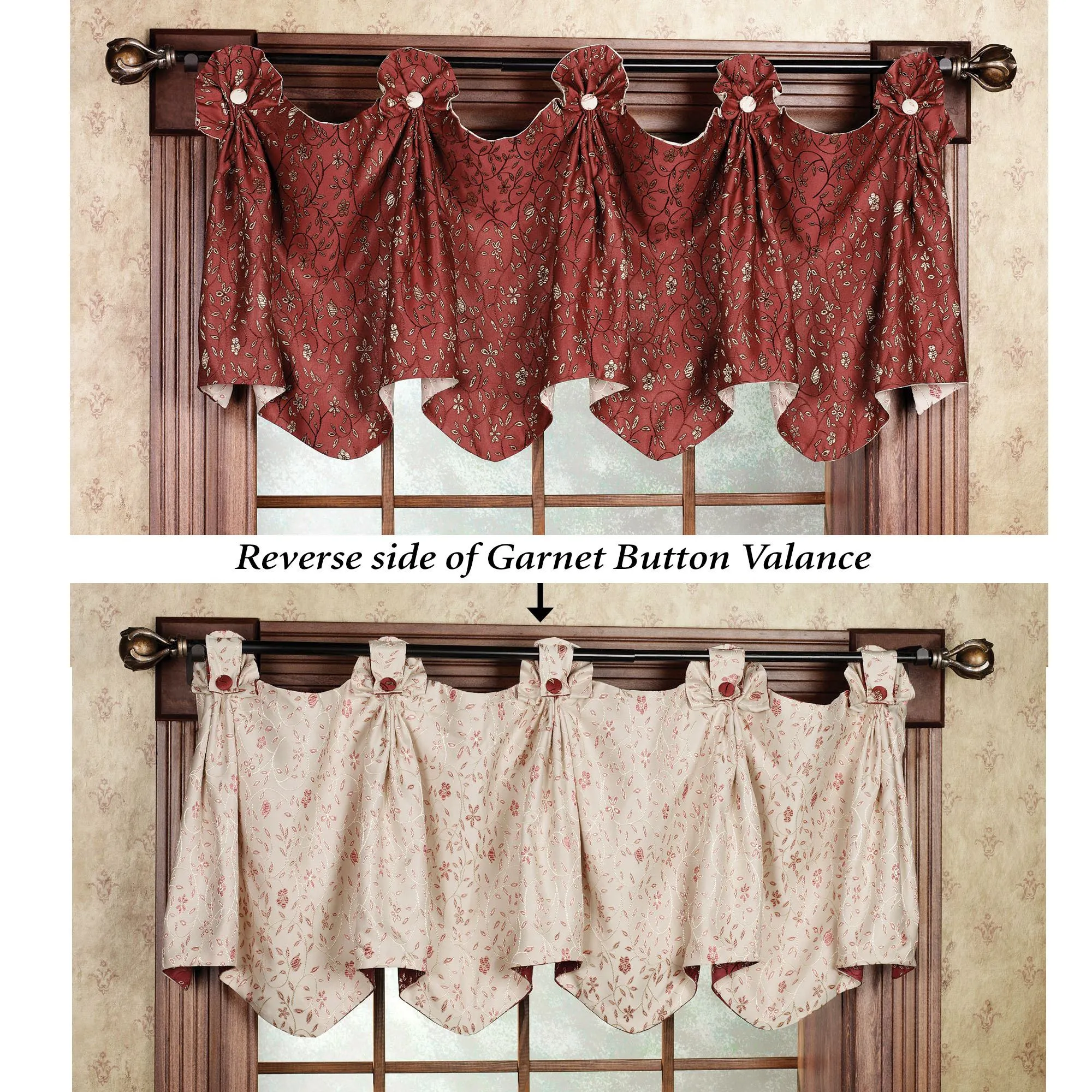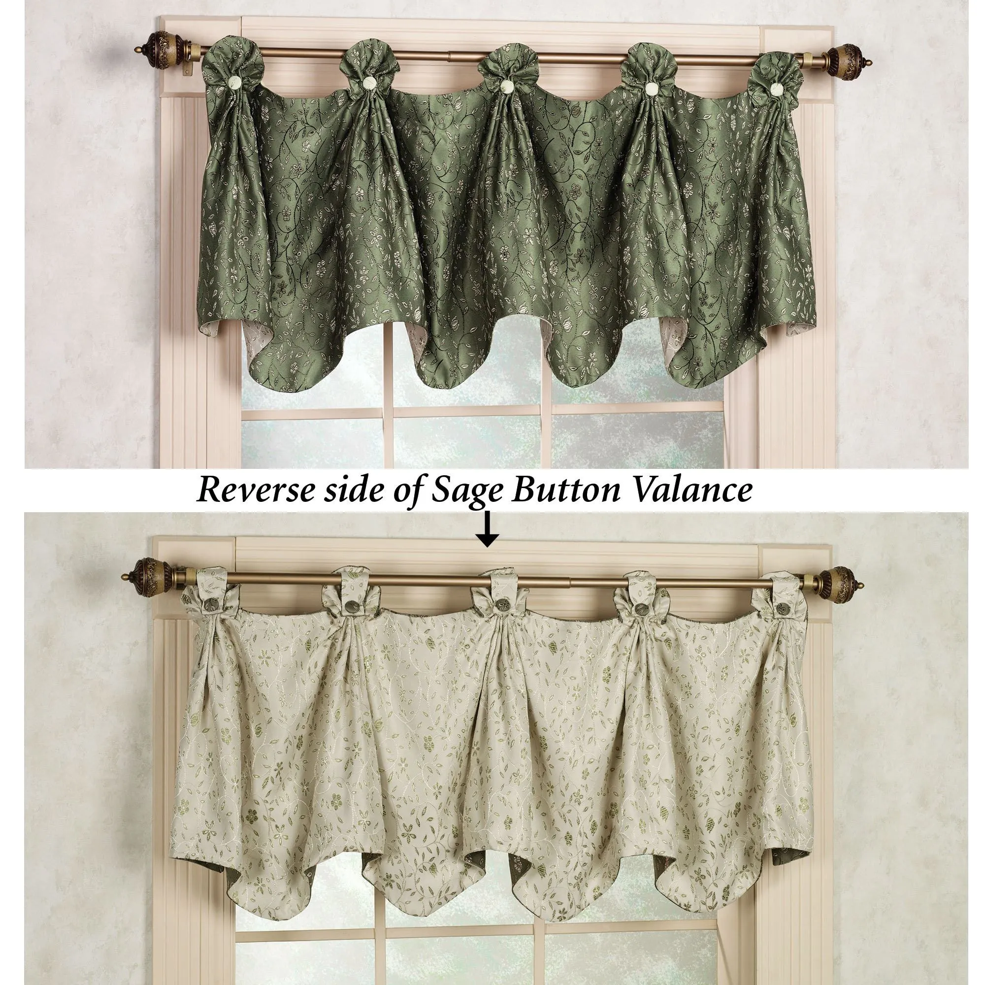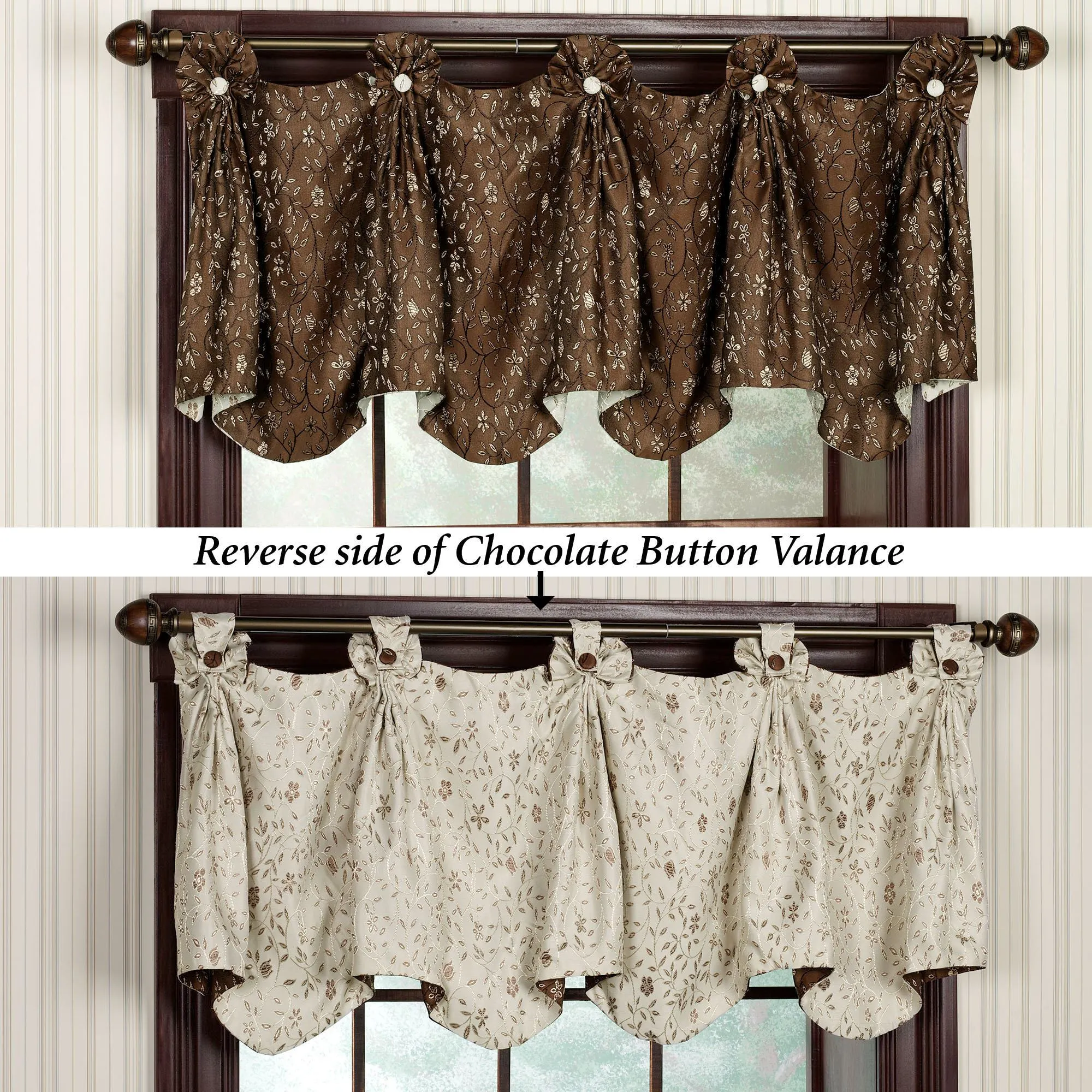 Madison Button Window Valance is vining floral jacquard on a solid color with a reversible coordinating color. Button tabs with fans to hang. Polyester window accessory has a 1.5" rod pocket. Measures 48"Wx20"L. Washable. Imported.