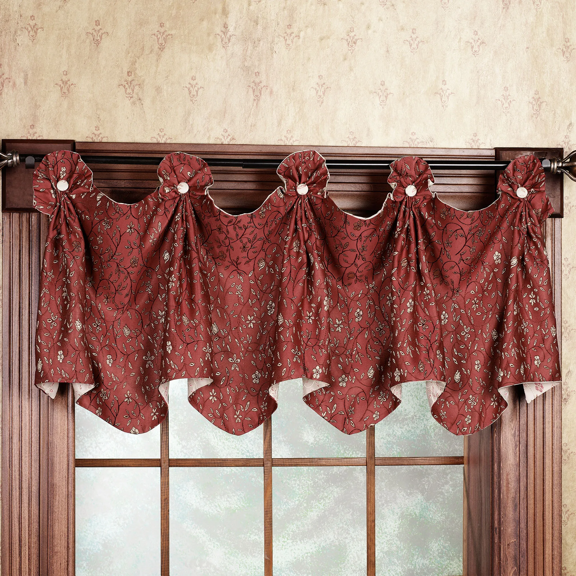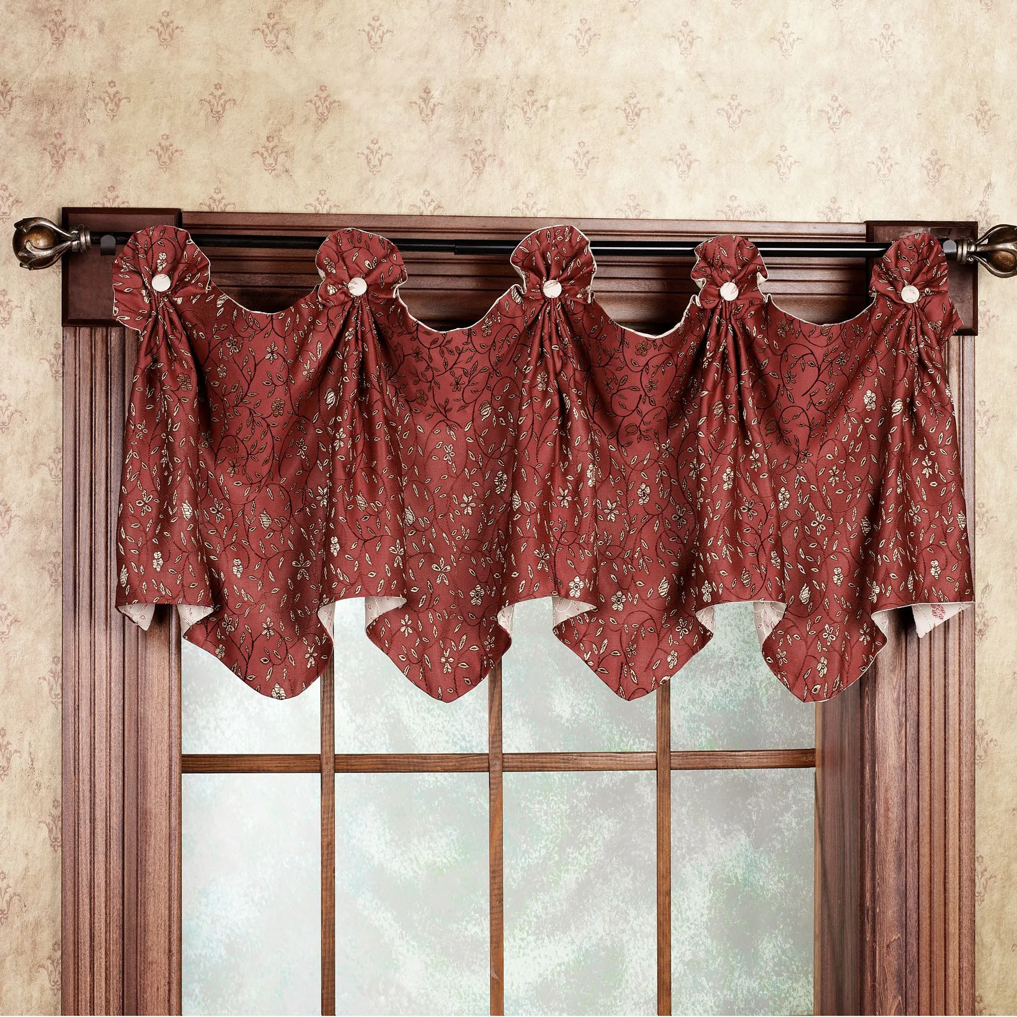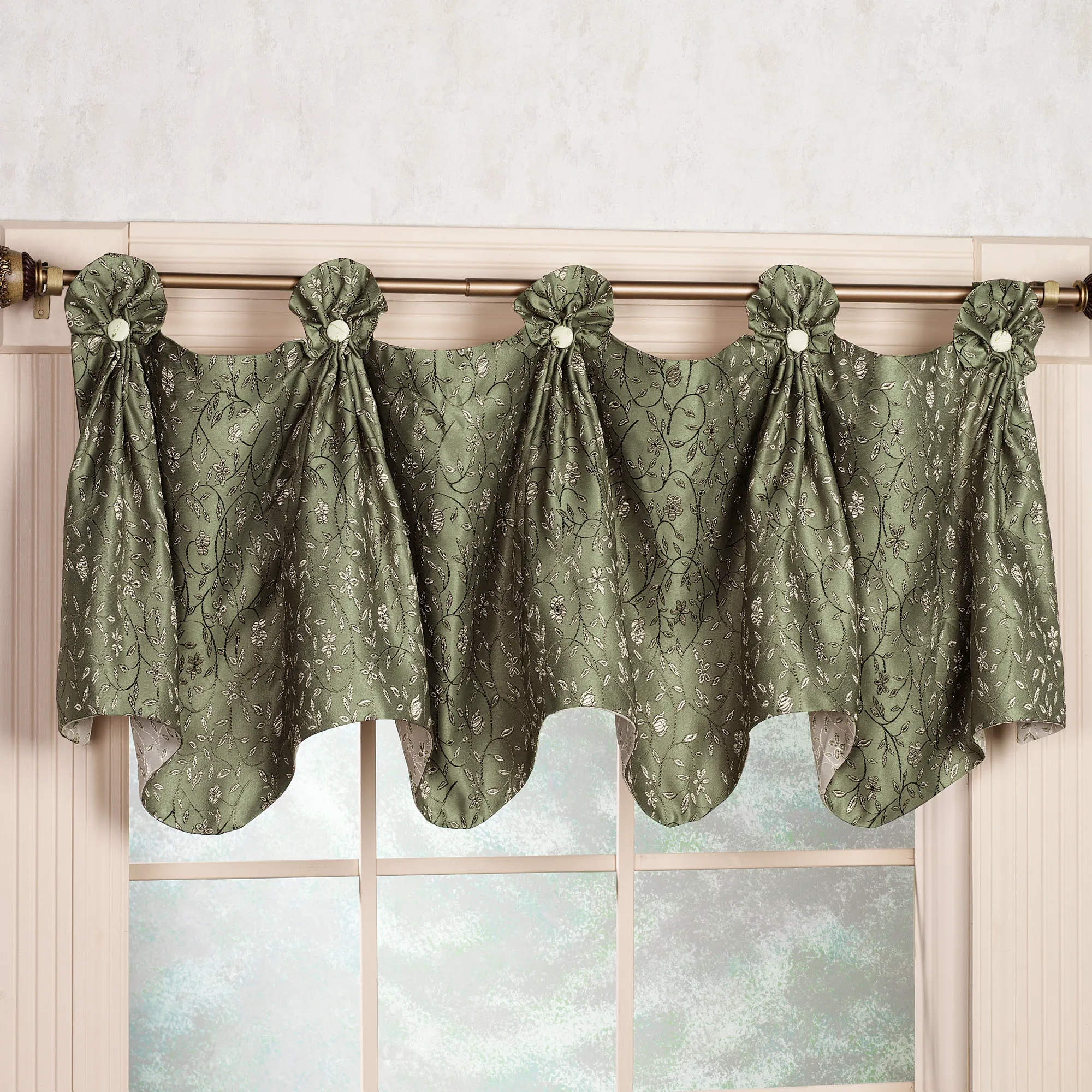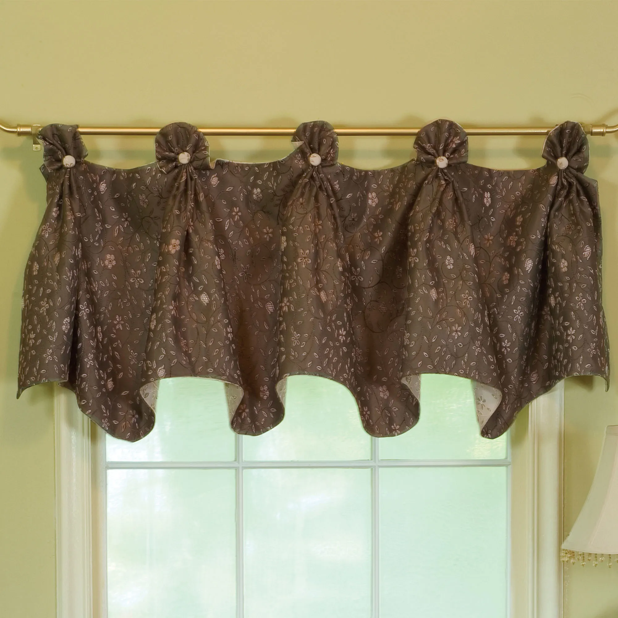 Madison Button Window Valance is vining floral jacquard on a solid color with a reversible coordinating color. Button tabs with fans to hang. Polyester window accessory has a 1.5" rod pocket. Measures 48"Wx20"L. Washable. Imported.