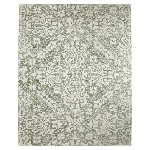 Charm blossoms within the Maely Area Rug. Hand-hooked from pure wool, the .5" thick looped pile features a heathered green and deep sage ground patterned with ivory floral damask for a design that complements a variety of decor tastes. The wool's natural lanolin provides resistance to fading, water, and stains. Backing is cotton. We recommend professional cleaning by a rug cleaner. Imported.