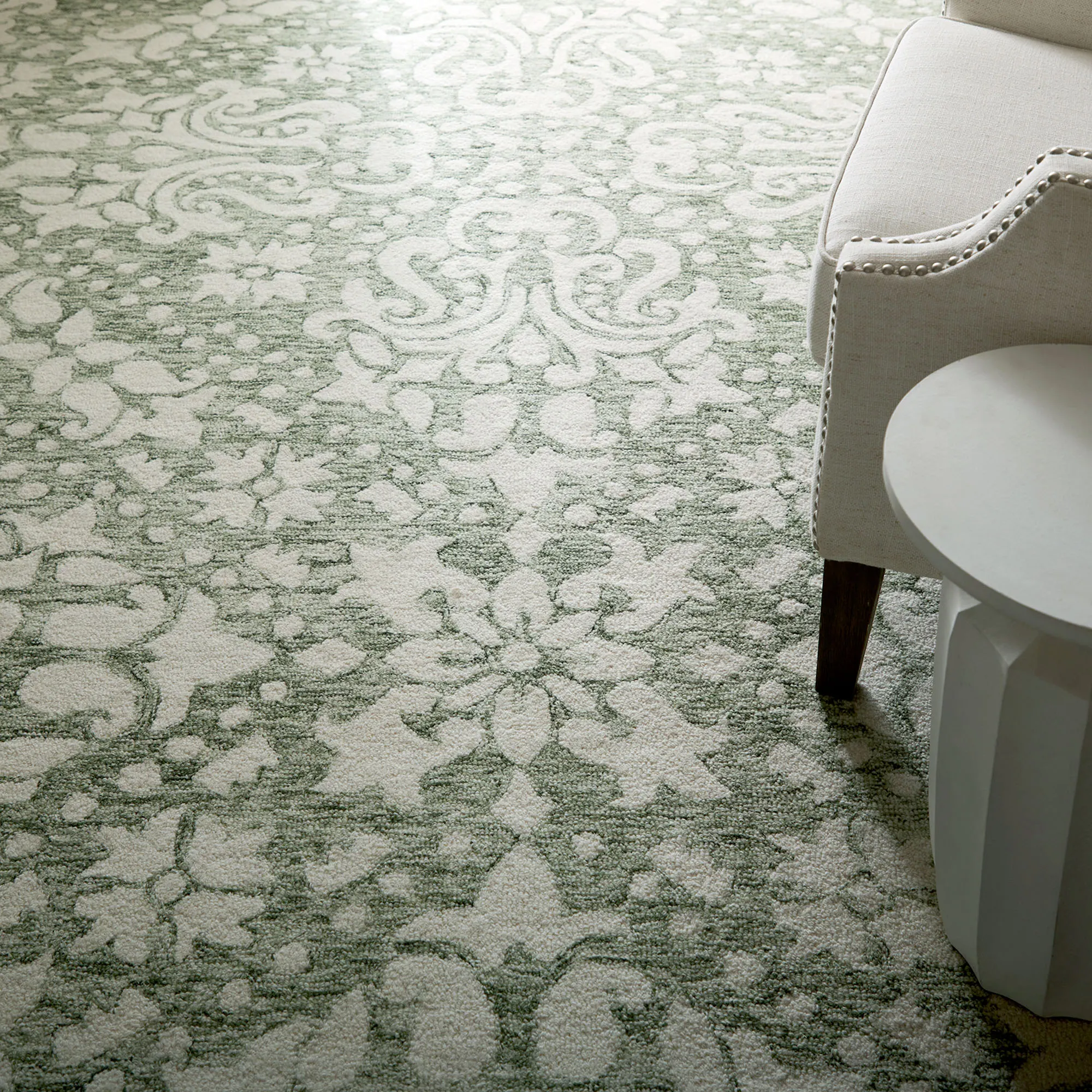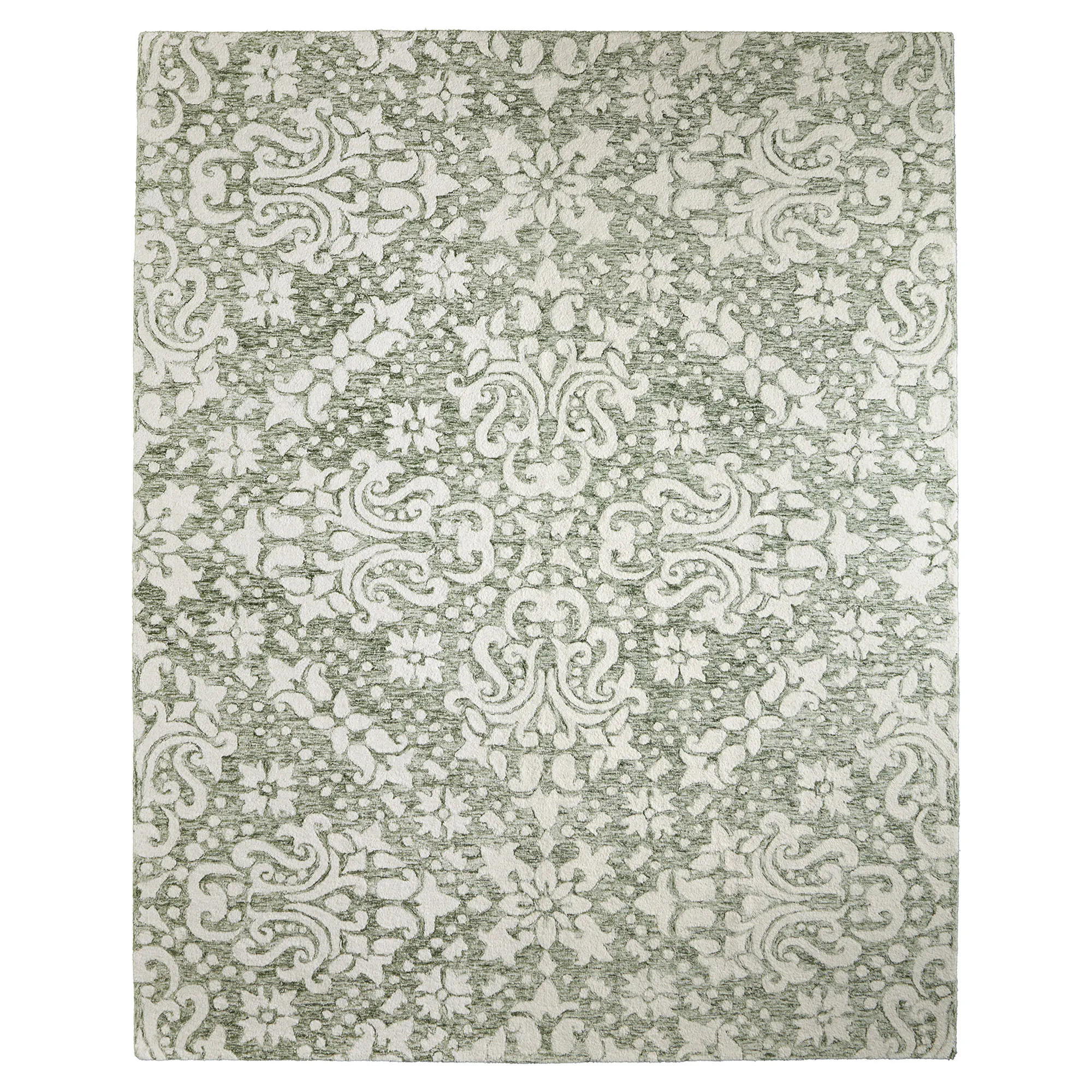 Maely Deep Sage Green Floral Damask Hand Hooked Wool Area Rugs