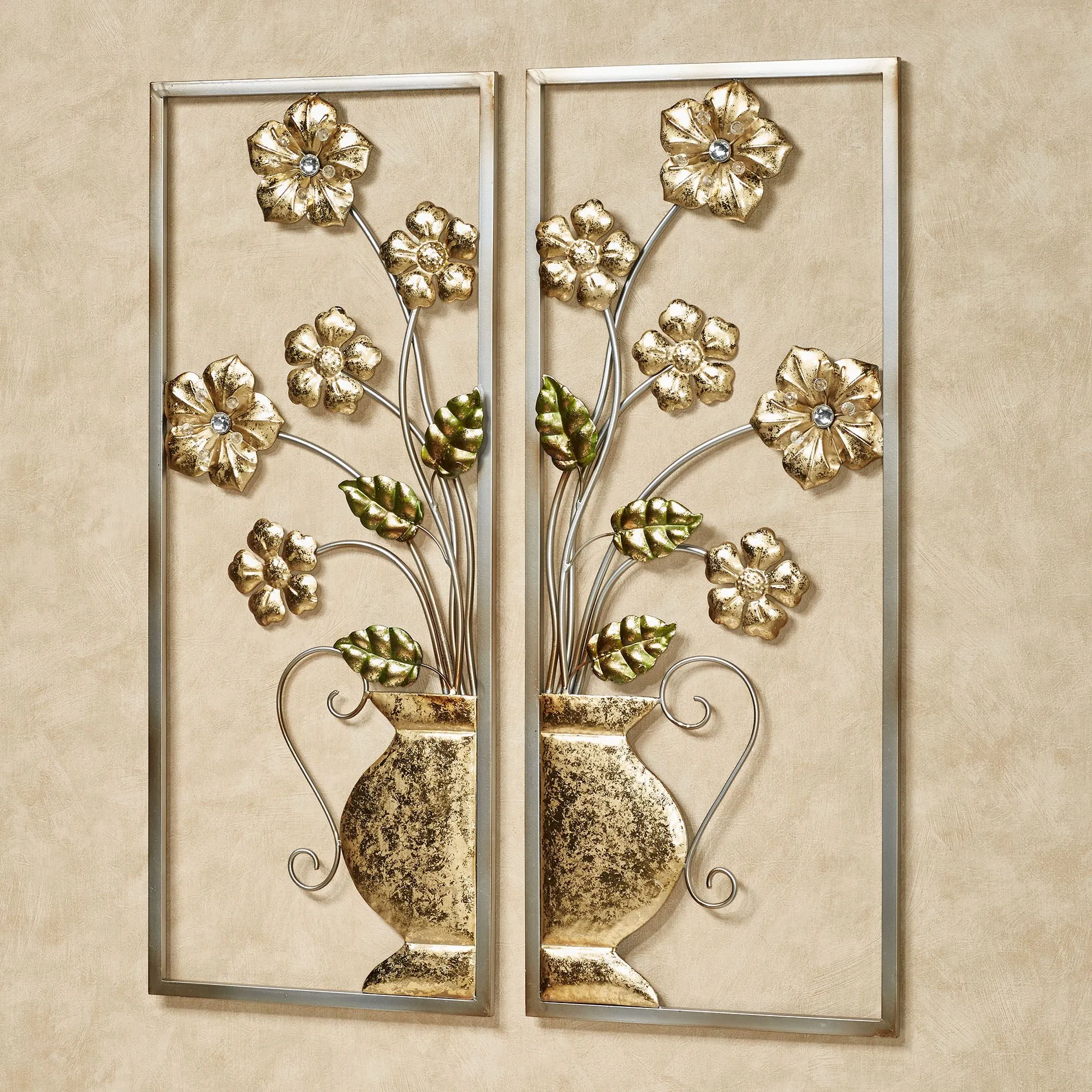 Flowers and shaped leaves artfully bloom on the Maelynn Floral Wall Art Set. This openwork metal wall art has a gold foil finish and features silver branches, gold blossoms, and green leaves. Some flowers have acrylic gems in the center. Each floral wall art panel is 14"Wx2"Dx34"H.