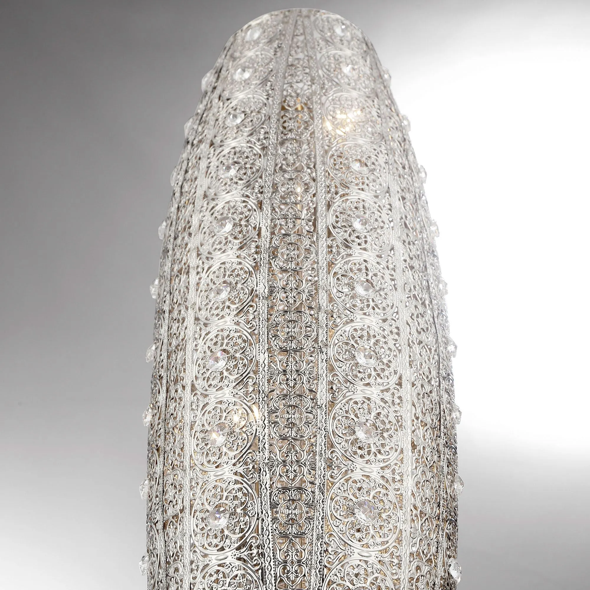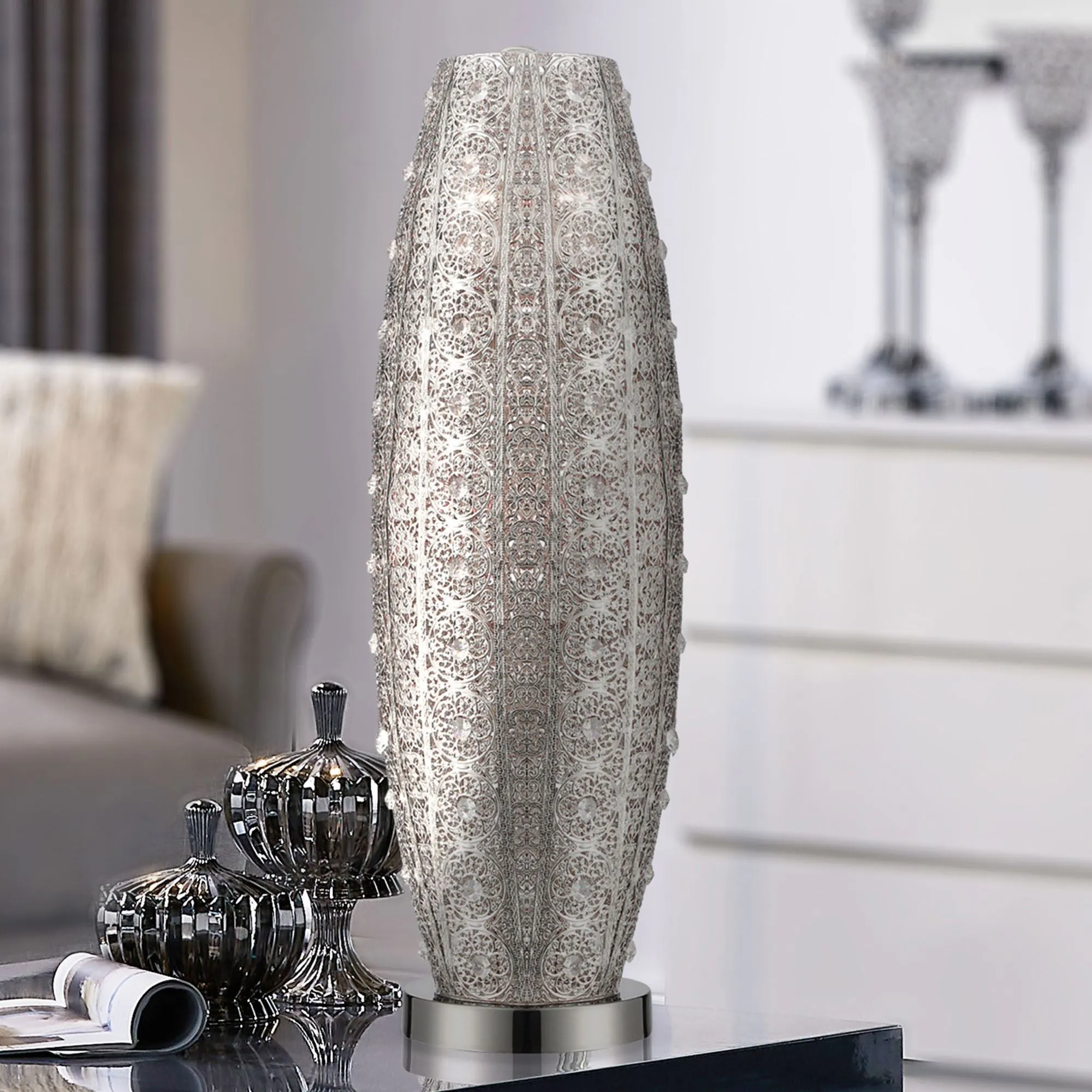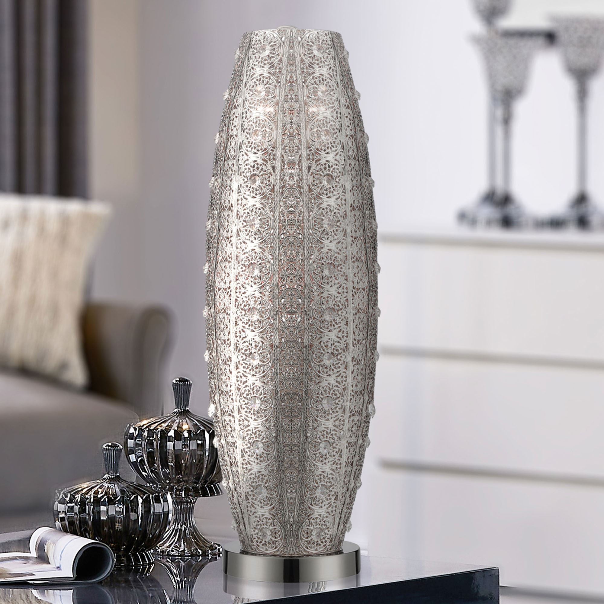 The silver floral filigree designs on the Magdalena Accent Lamp will light up any room with an elegant essence. Made of metal, this table lamp has ornate designs with fine-cut crystal accents on a polished nickel mounting base. UL listed. Requires two 100W max. bulbs. Measures 8"dia.x25"H.