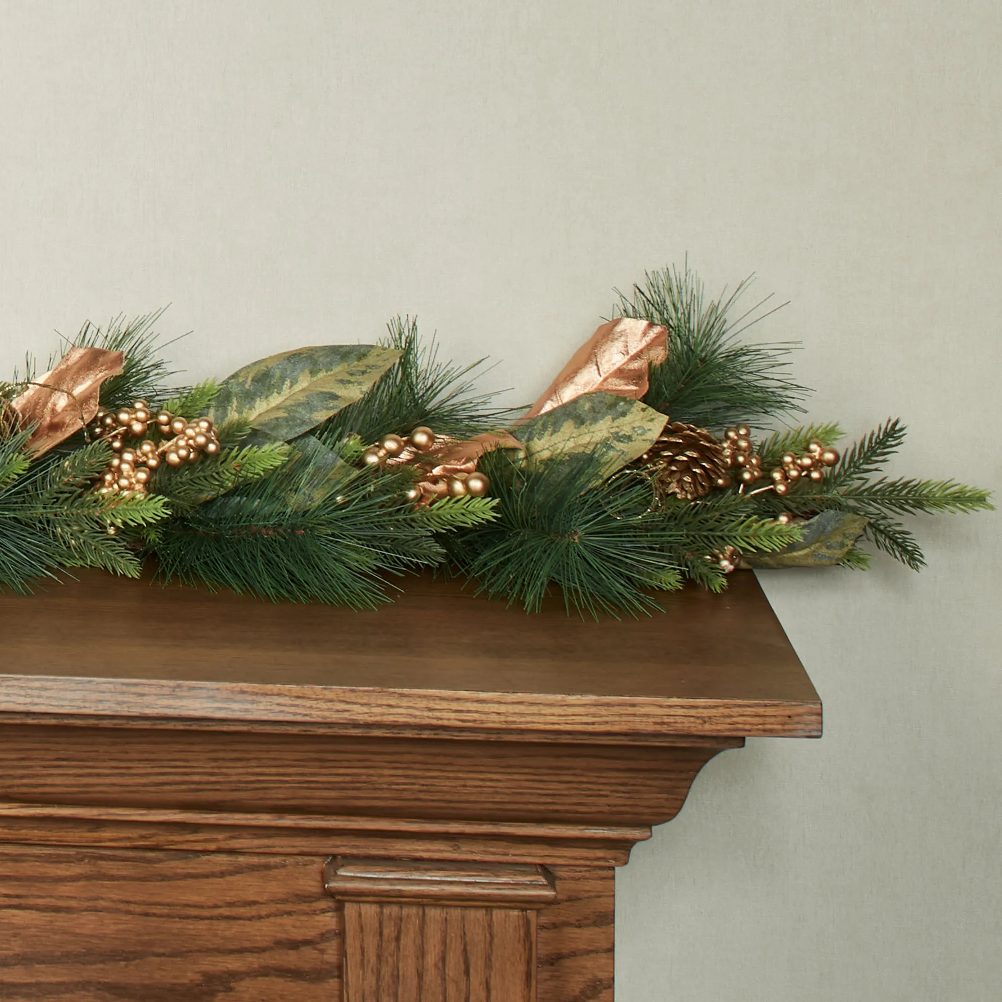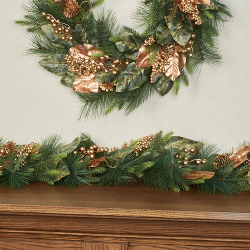 • Features pine greenery and green and copper magnolia leaves