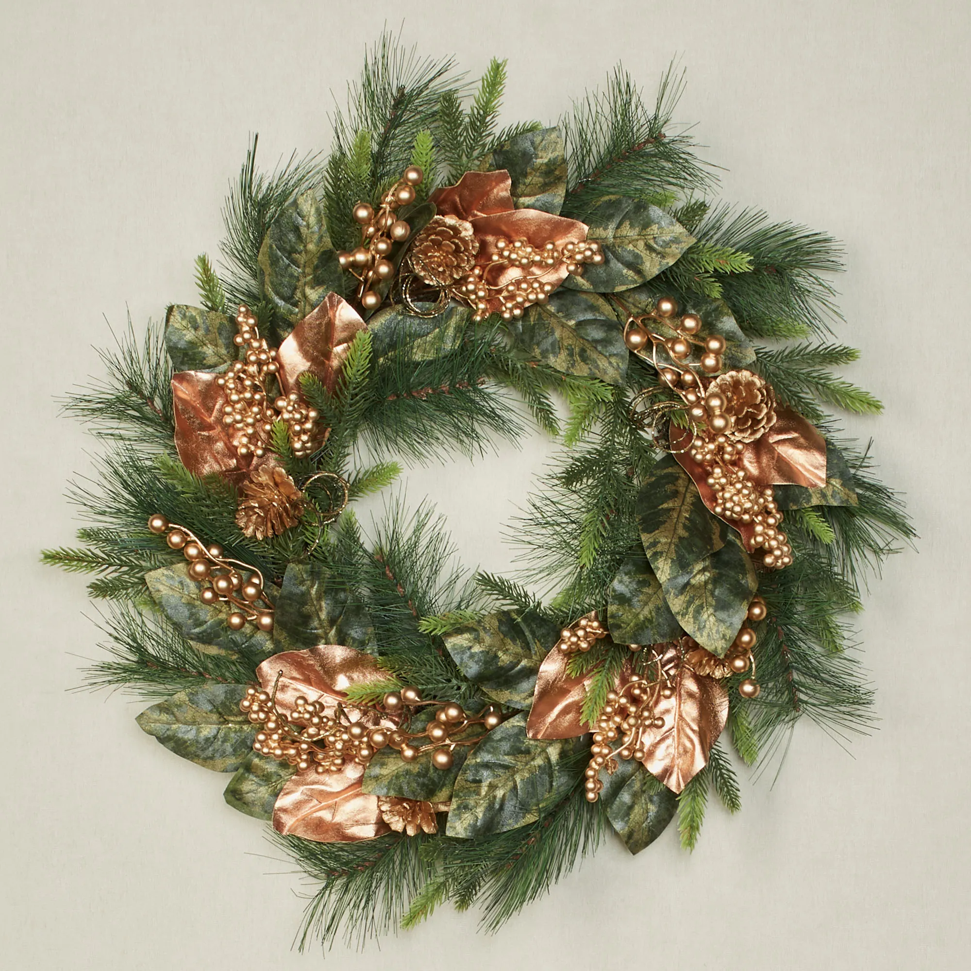 • Features pine greenery and green and copper magnolia leaves