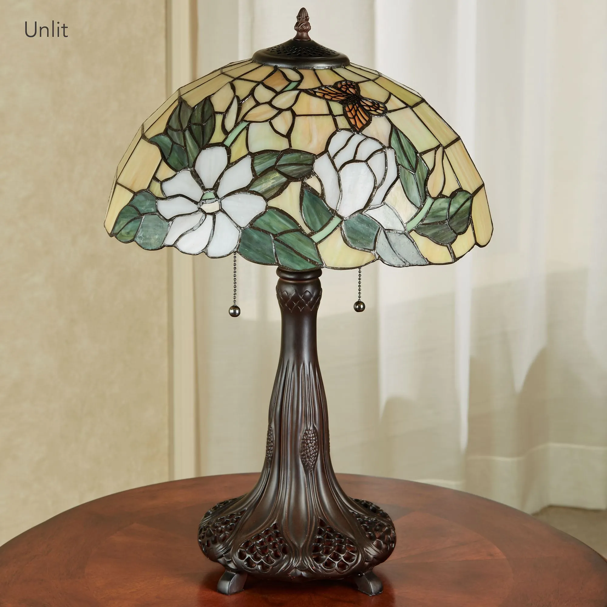 Showcase delicate floral beauty with the Magnolia Butterfly Stained Glass Table Lamp. The hand-cut and hand-soldered stained art glass shade features magnolia flowers, leaves, and a butterfly. Colors include sage green, orange, gold, and ivory. The resin, tree trunk-style base has a bronze finish with gold highlights and ornate openwork details at the bottom. UL listed. Dual pull chains require two of your 60W max. bulbs. Overall, the floral table lamp measures 16"dia.x24"H, including the 1.25"H finial; weighs 10 lbs.