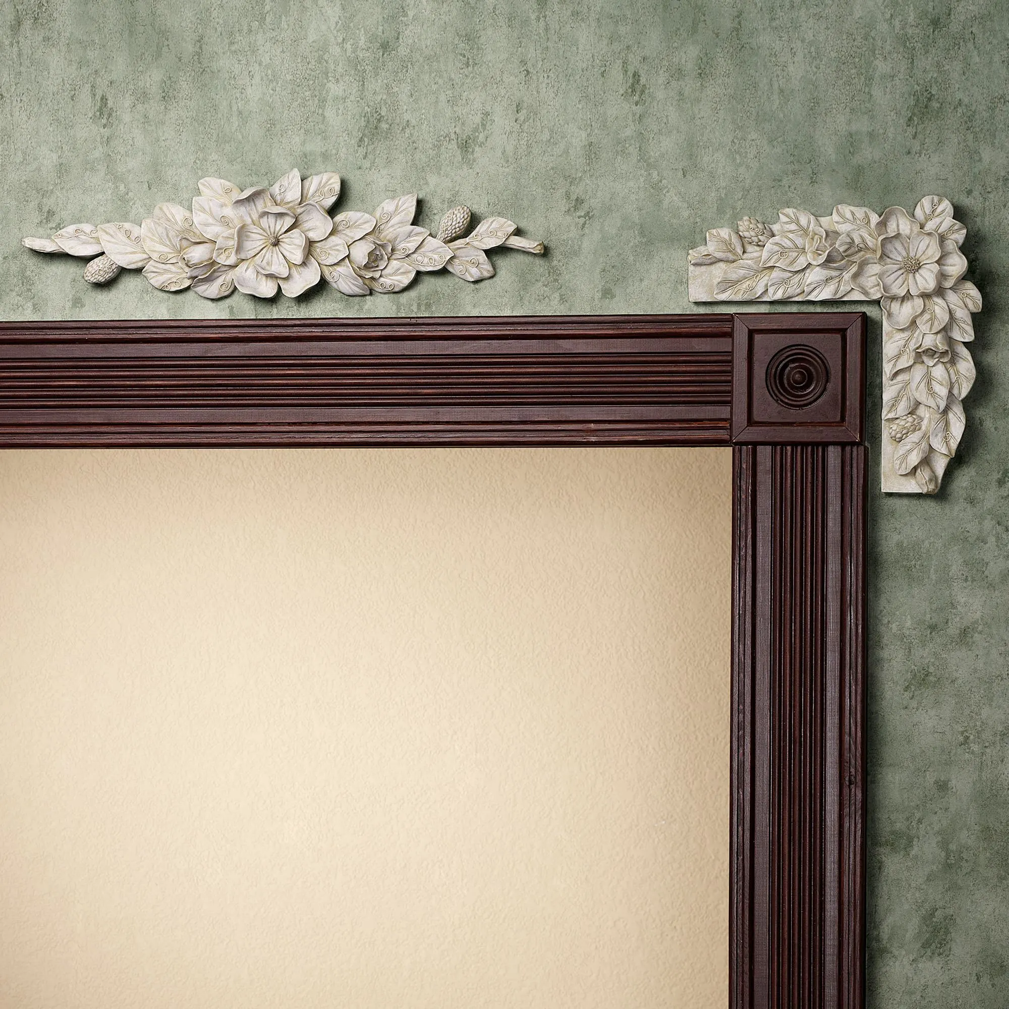 Charming and pretty, the Magnolia Decorative Wall Accents create an amazing display. Resin wall accents feature magnolia flowers and leaves in a multi-step ivory finish with brushed, frosty green highlights. Wall ornament pair can dress up a picture or mirror. Decorative accents also give a pleasing touch to a door or entryway; each is 11"Wx11"H.