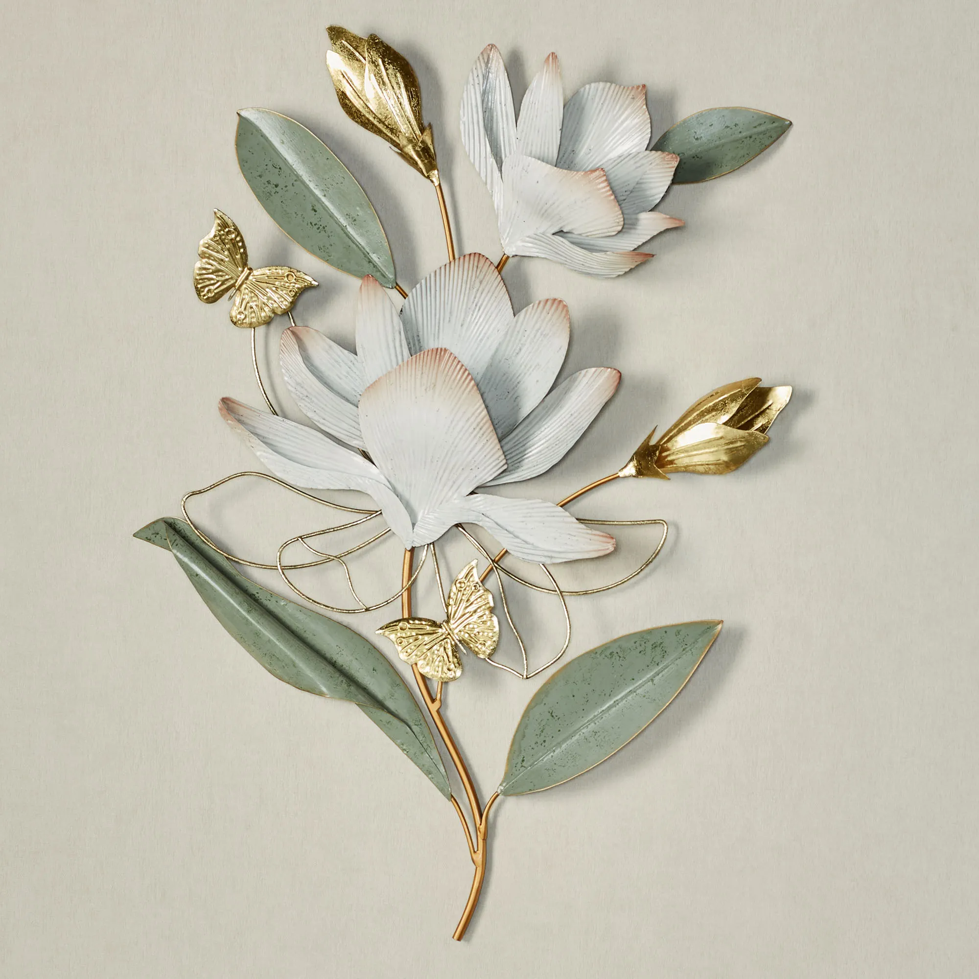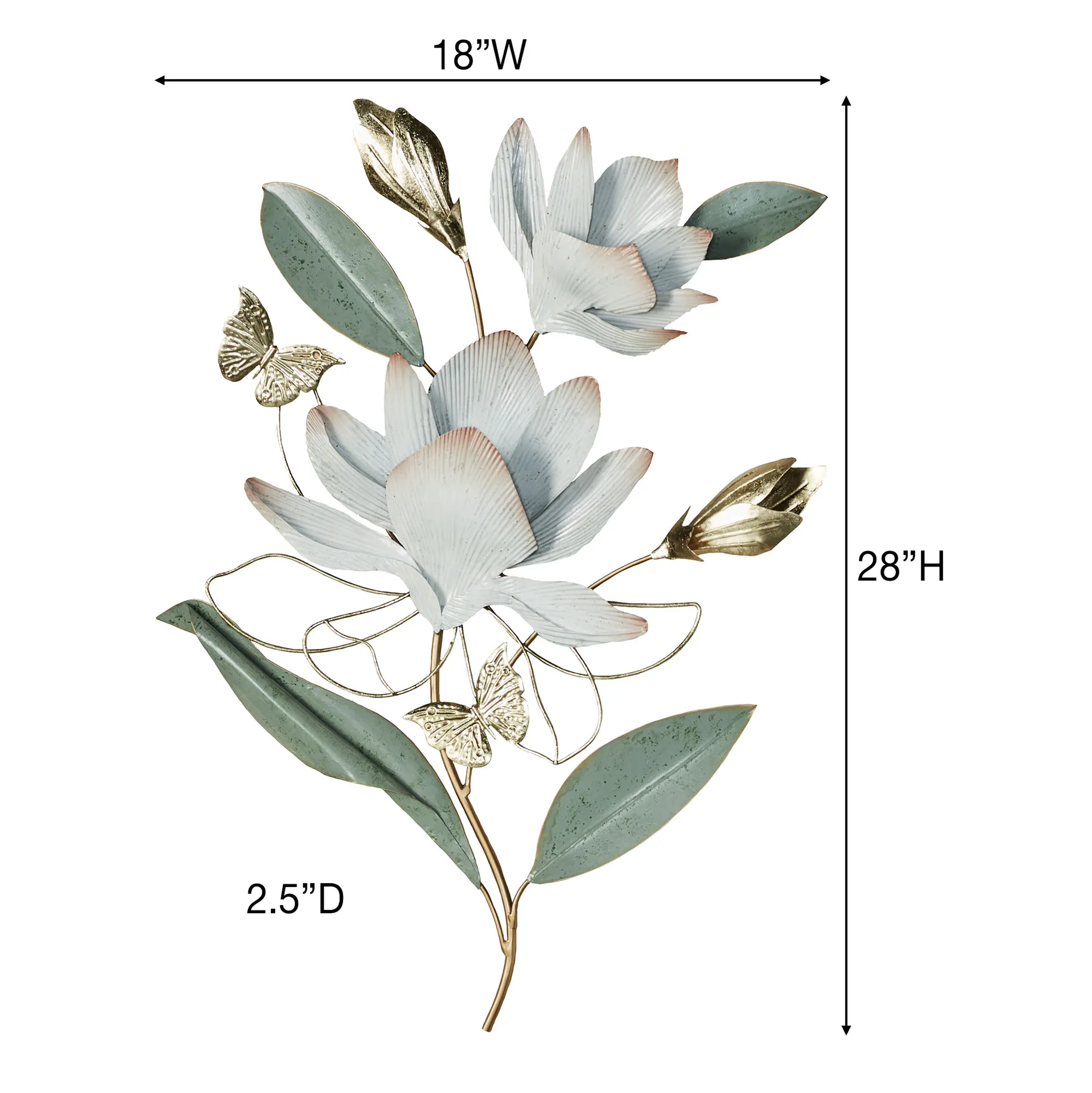 The Magnolia Grace Floral Wall Art sweetens a space with an alluring poise. Handpainted with distressed accenting, the metal wall sculpture resembles a flowering magnolia branch with golden buds and lovely leaves. Beautiful butterflies flit about the antique white blossoms with fluted, dusty blush-edged petals. Magnolia wall art measures 18"Wx2.5"Dx28"H.