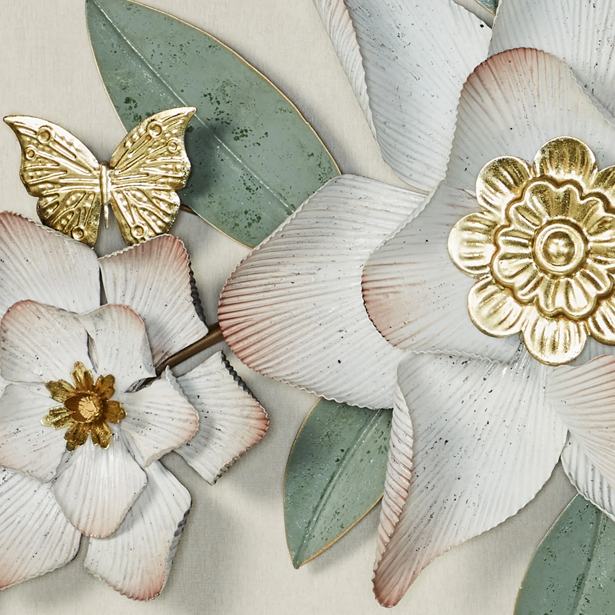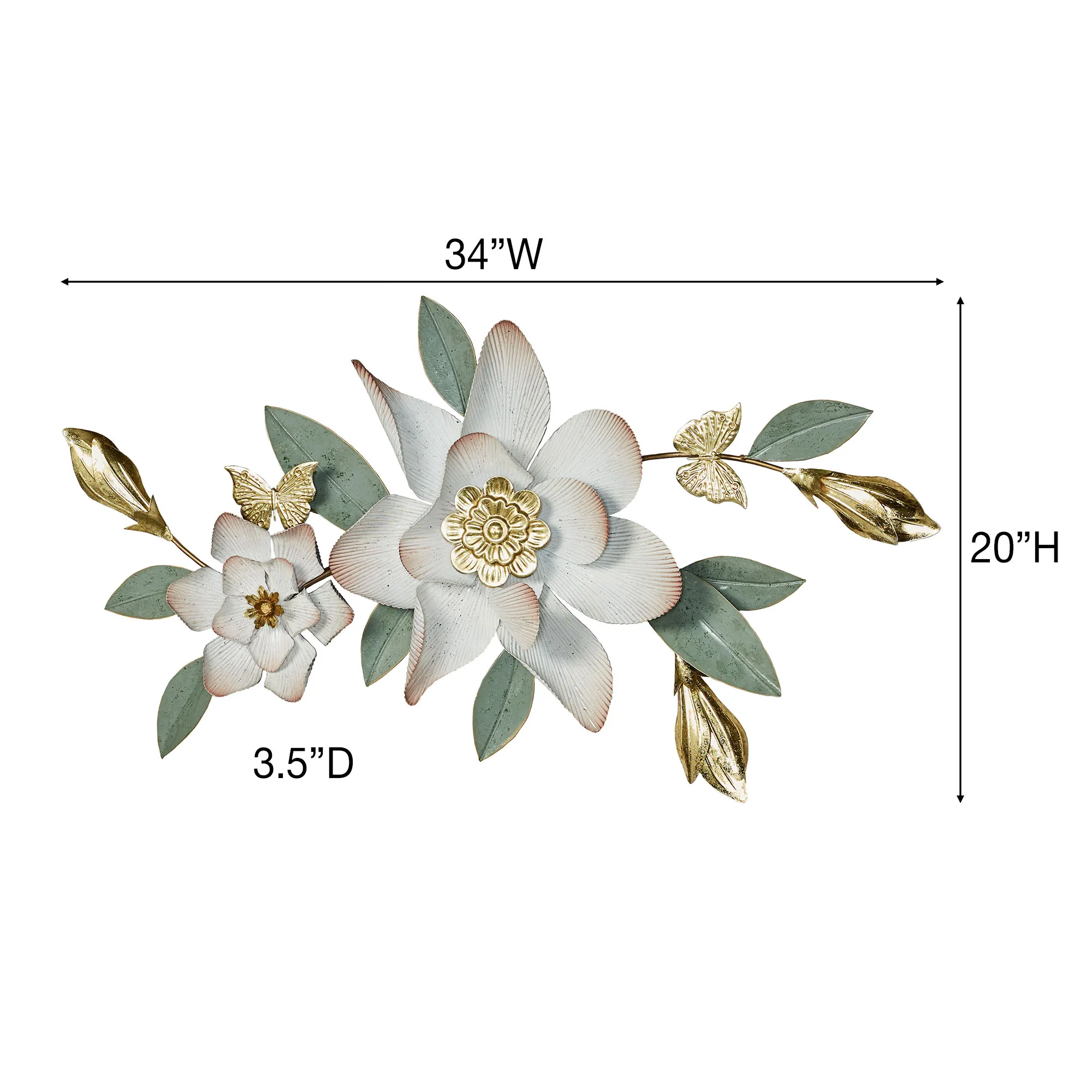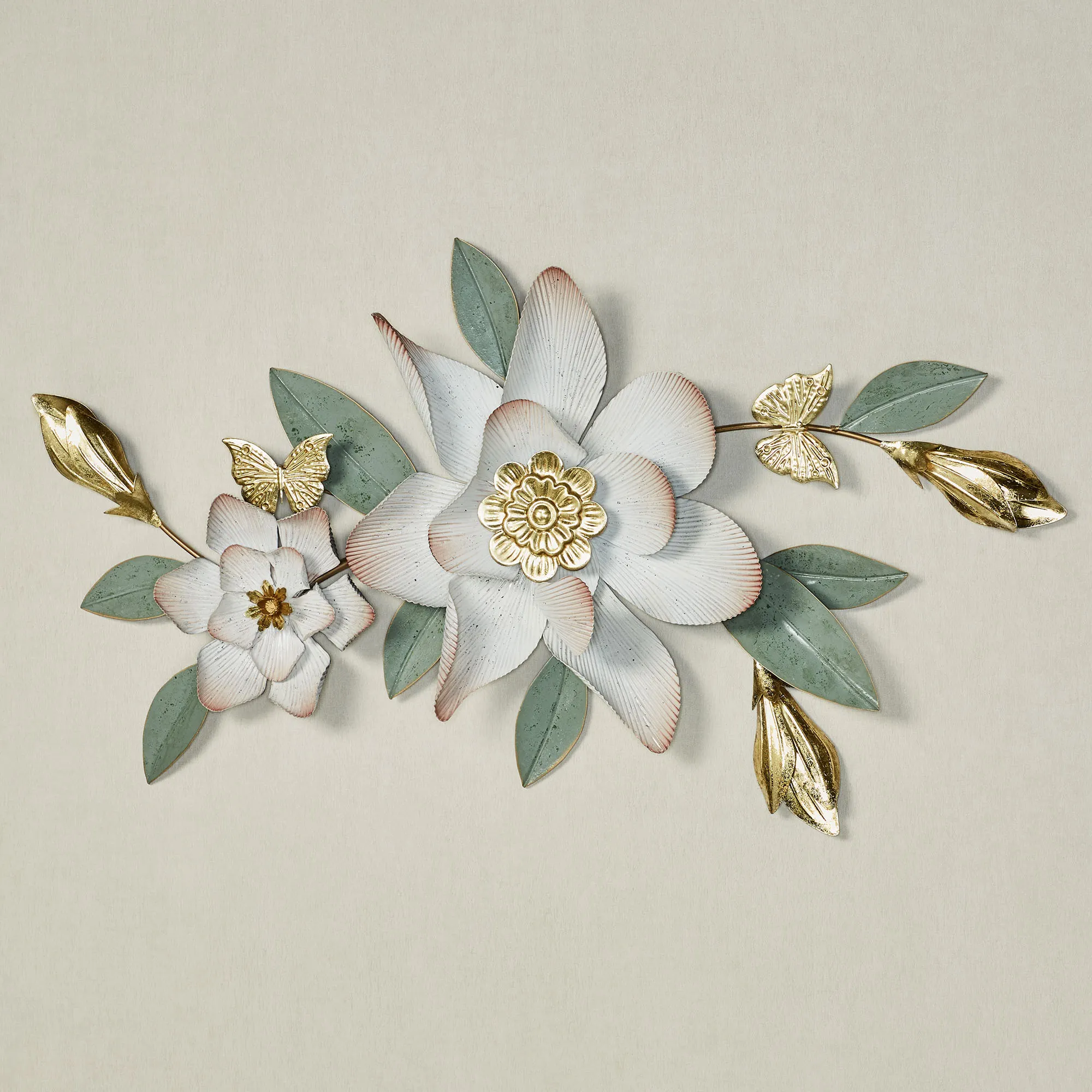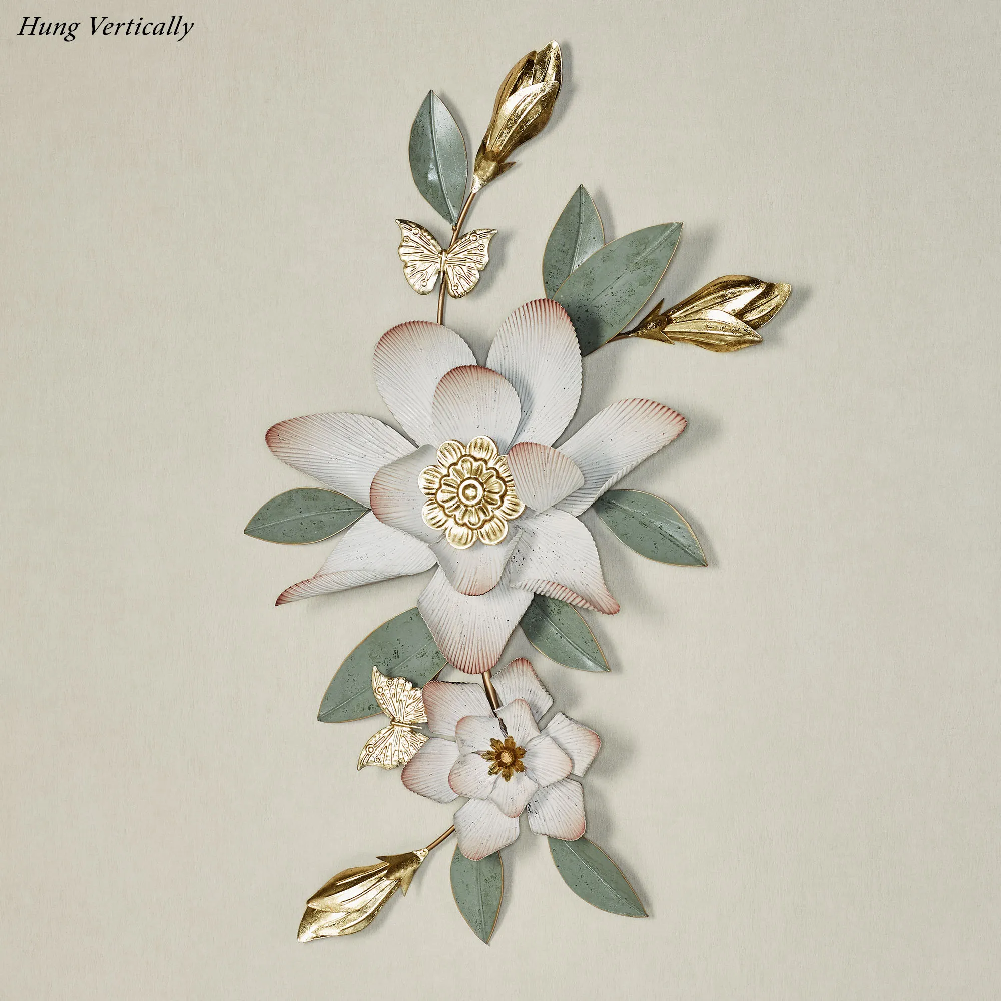 The Magnolia Grace Floral Wall Topper sweetens a space with an alluring poise. Handpainted with distressed accenting, the metal wall topper resembles a flowering magnolia swag with golden buds and lovely leaves. Beautiful butterflies flit about the antique white blossoms with golden centers and fluted, dusty blush-edged petals. The magnolia wall topper may hang horizontally or vertically. Measures 34"Wx3.5"Dx20"H.