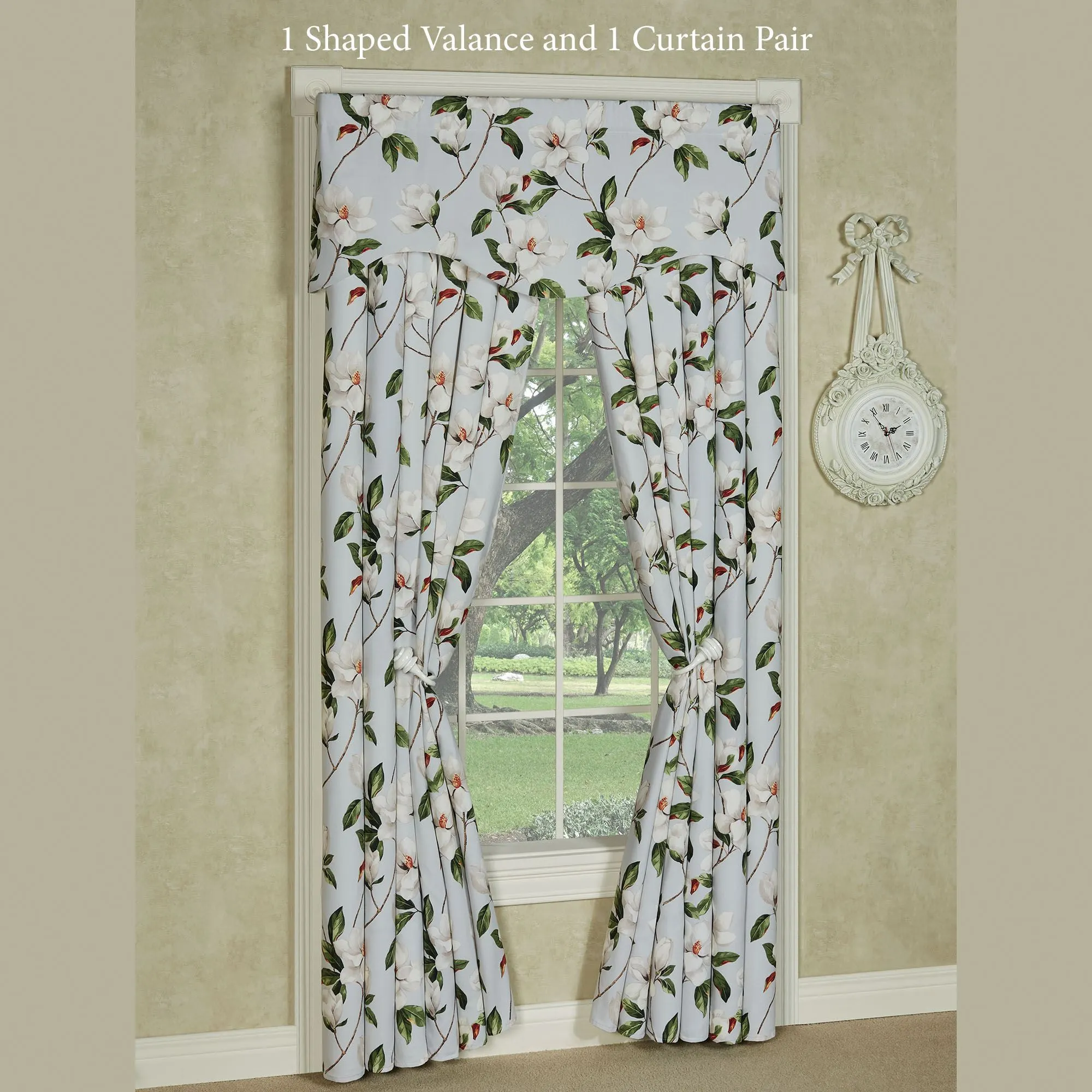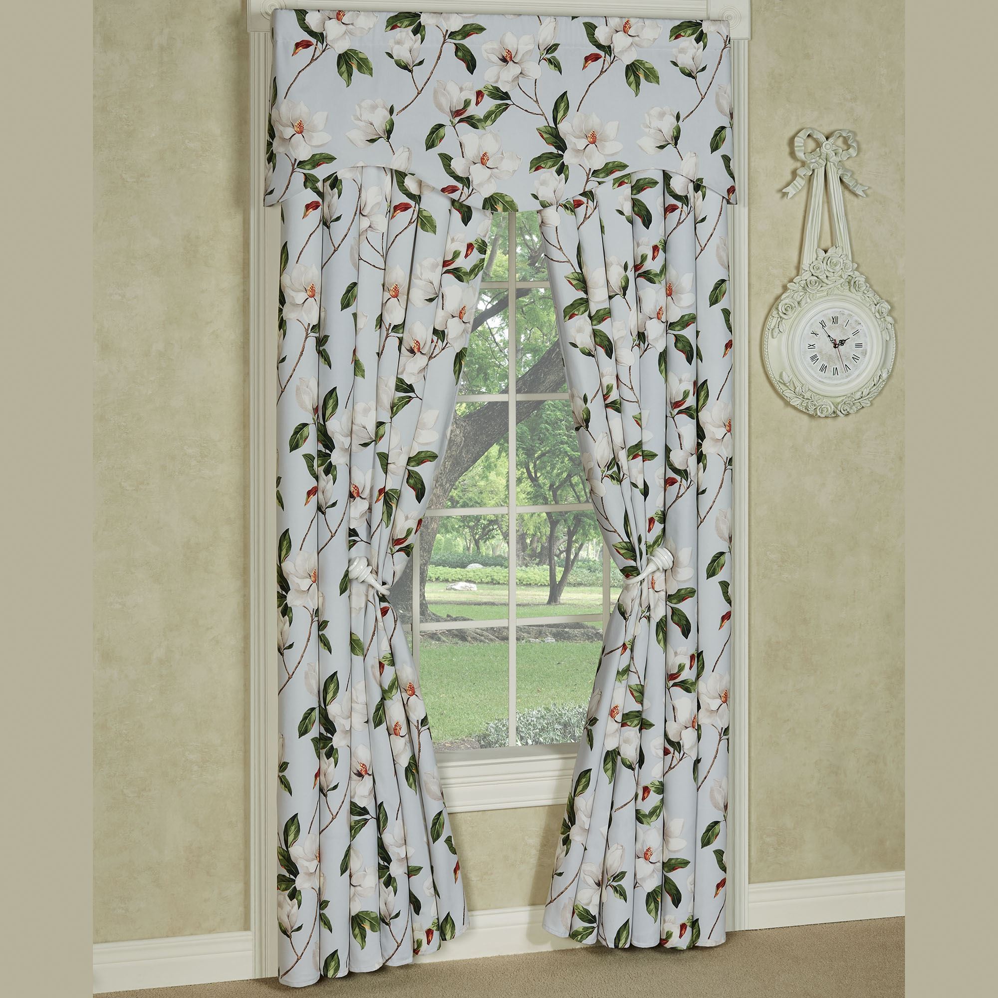 The beauty of sweet flower blossoms and elegant blooms is sure to be found on Magnolia Lane. This charming cotton window treatment features an all-over magnolia floral print. Colors include off-white, gray, yellow, rust, green, and brown on a pale gray ground. Lined window treatment has 3" rod pockets. Specify Wide Curtain Pair or Shaped Valance. The tailored Wide Curtain Pair includes fabric tiebacks; the white metal holdbacks shown are not included. Dry clean. The curtain pair width is the total width of two panels together.
