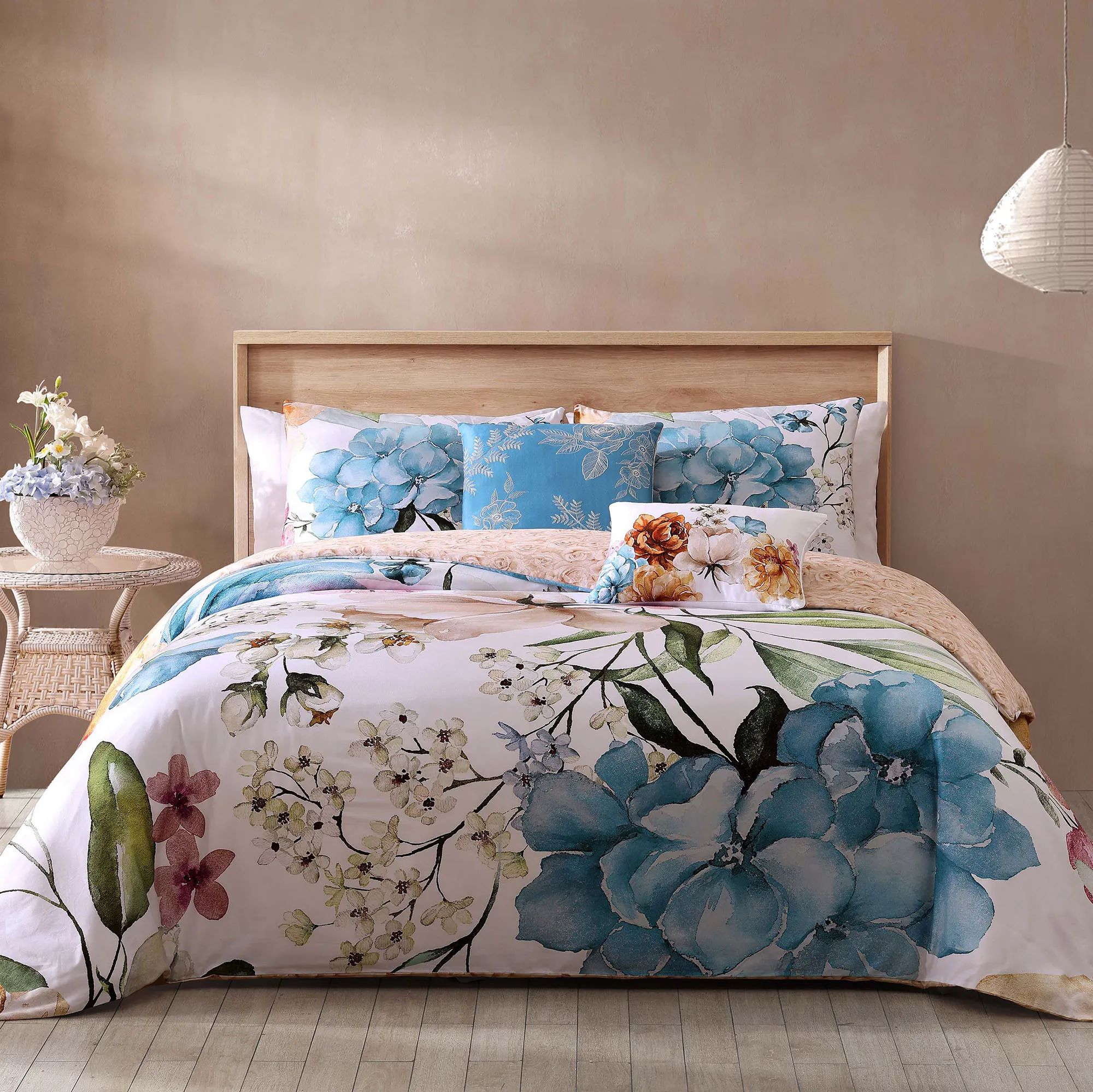 Relax in the lush garden of good dreams with the Maia Floral Bedding. With a lovely watercolor style, the printed white cotton sateen ensemble features beautiful oversized flowers and leaves in shades of blue, blush, pink, ivory, terra cotta, and green. The reversible design features magnificent all-over terra cotta and ivory roses for a romantic allure. The design is OEKO-TEX(R) certified, which ensures a lack of harmful chemicals, making the bedding safe for the whole family.