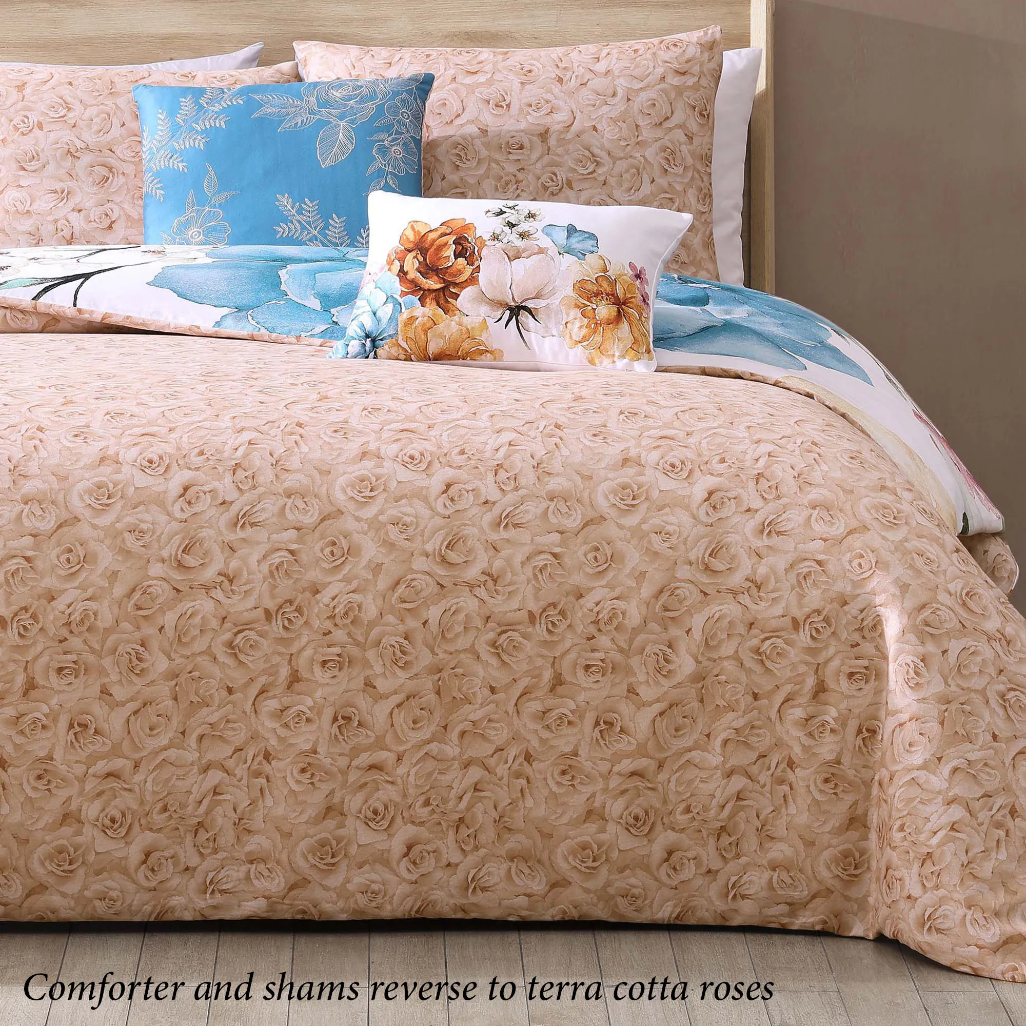 Enjoy a lush garden with the Maia Floral Bedding. The 5-piece Bed Set includes a comforter, 2 shams, and 2 accent pillows. With a lovely watercolor style, the printed white cotton sateen comforter features oversized flowers and leaves in shades of blue, blush, pink, ivory, terra cotta, and green. Oversized comforter is reversible to all-over terra cotta and ivory roses. Click on the Details tab to read about the other items in the bed set. Bedding fill is polyester. Machine washable; spot clean the pillows. Imported.