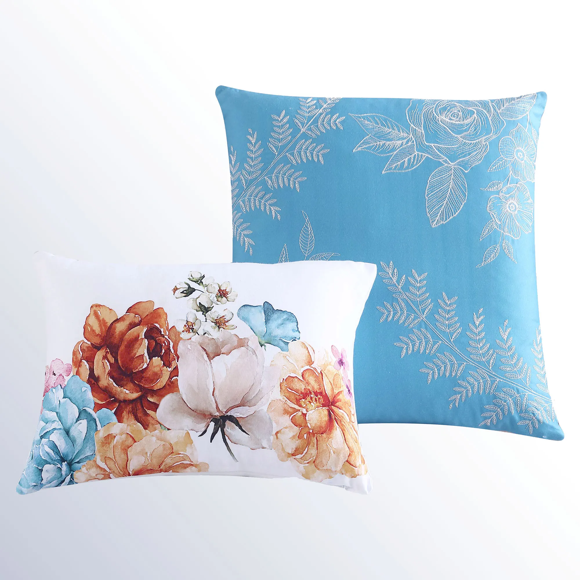 Pillows have tailored edges, zipper closures, and polyester inserts; spot clean. Square pillow is blue with ivory embroidered florals and leaves. Rectangle pillow has coordinating printed florals.