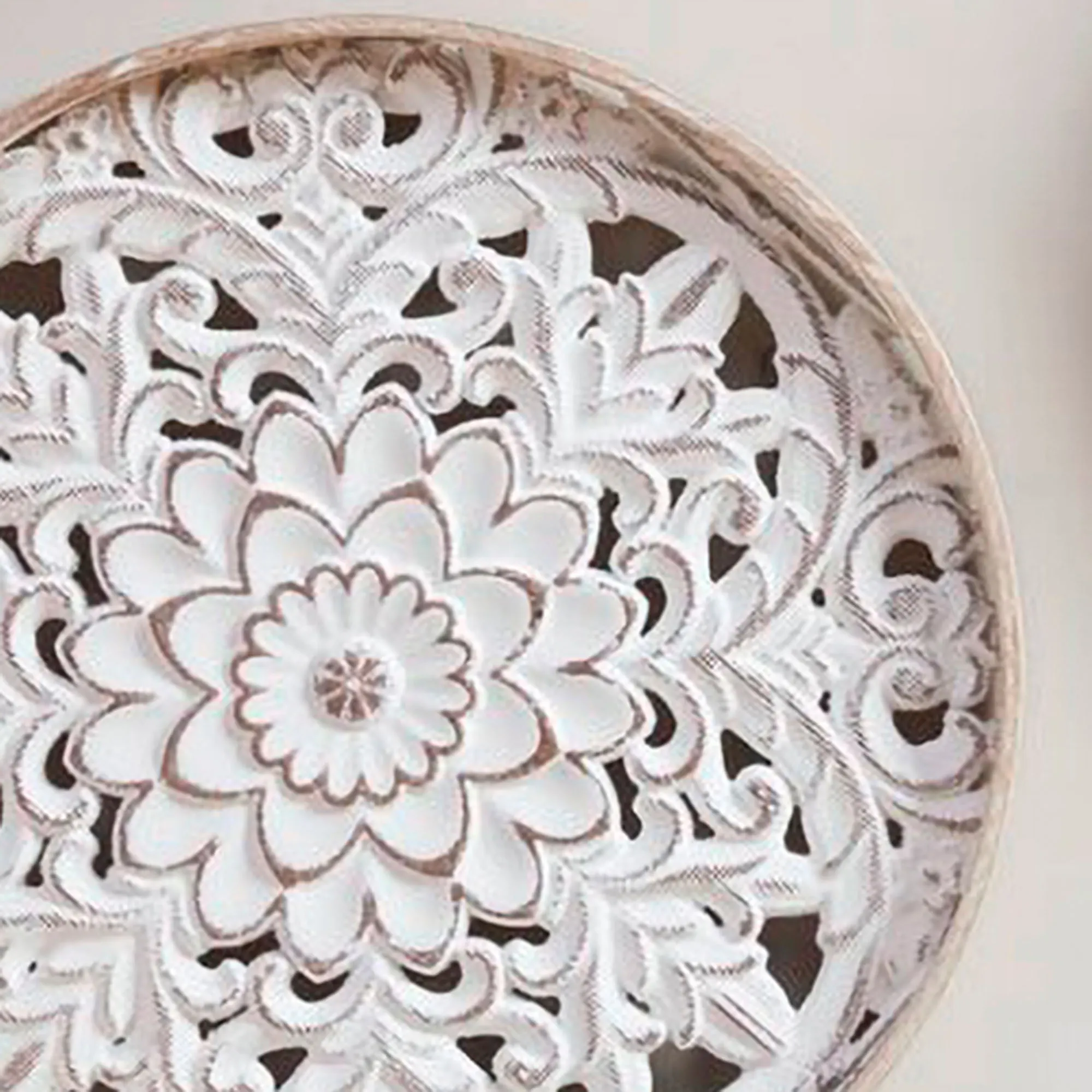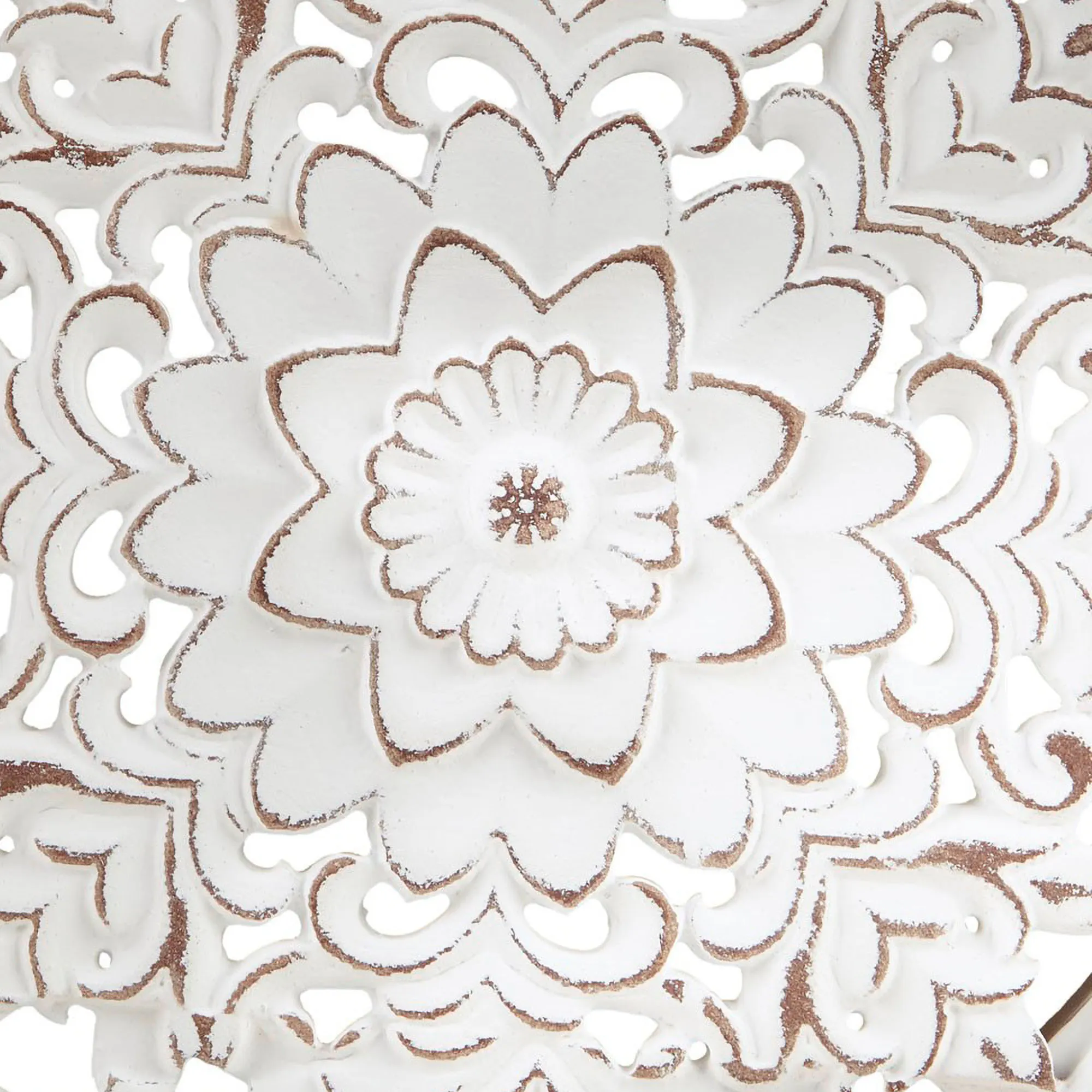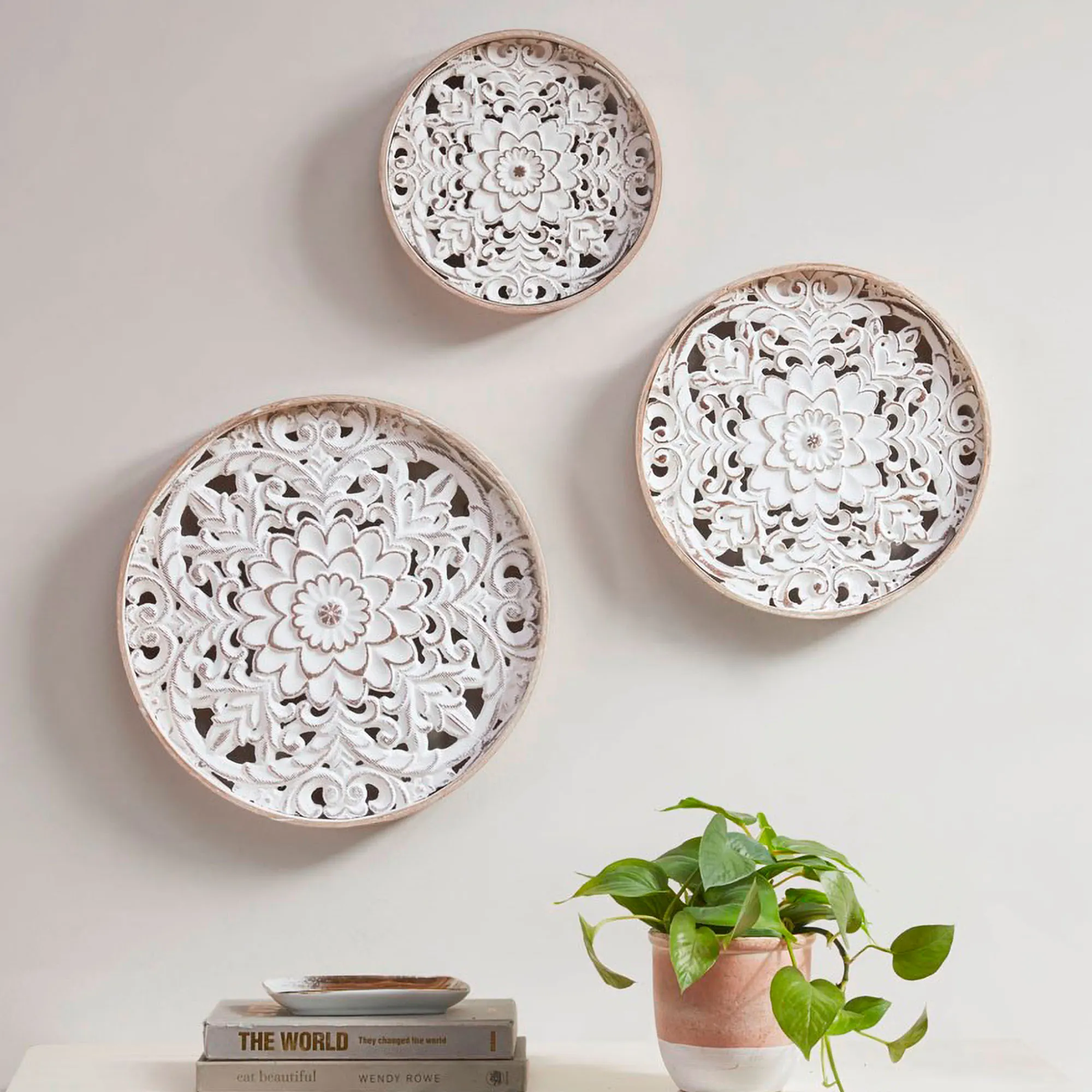 The Maisie Wall Art Set embellishes a space with vintage charm, dimensional allure, and carved detailing. With a weathered white finish, each round, fir wood design features an intricate carved medallion with openwork accents. Wall art set includes small, 10"dia.x1.5"D; medium, 12"dia.x1.5"D; and large, 14"dia.x1.5"D.
